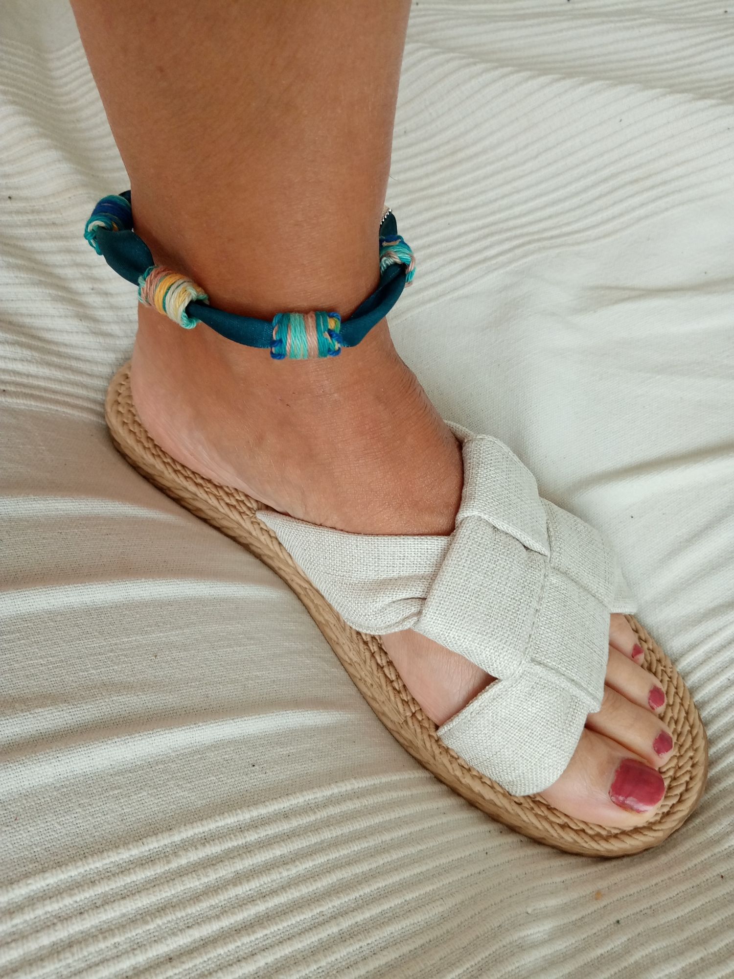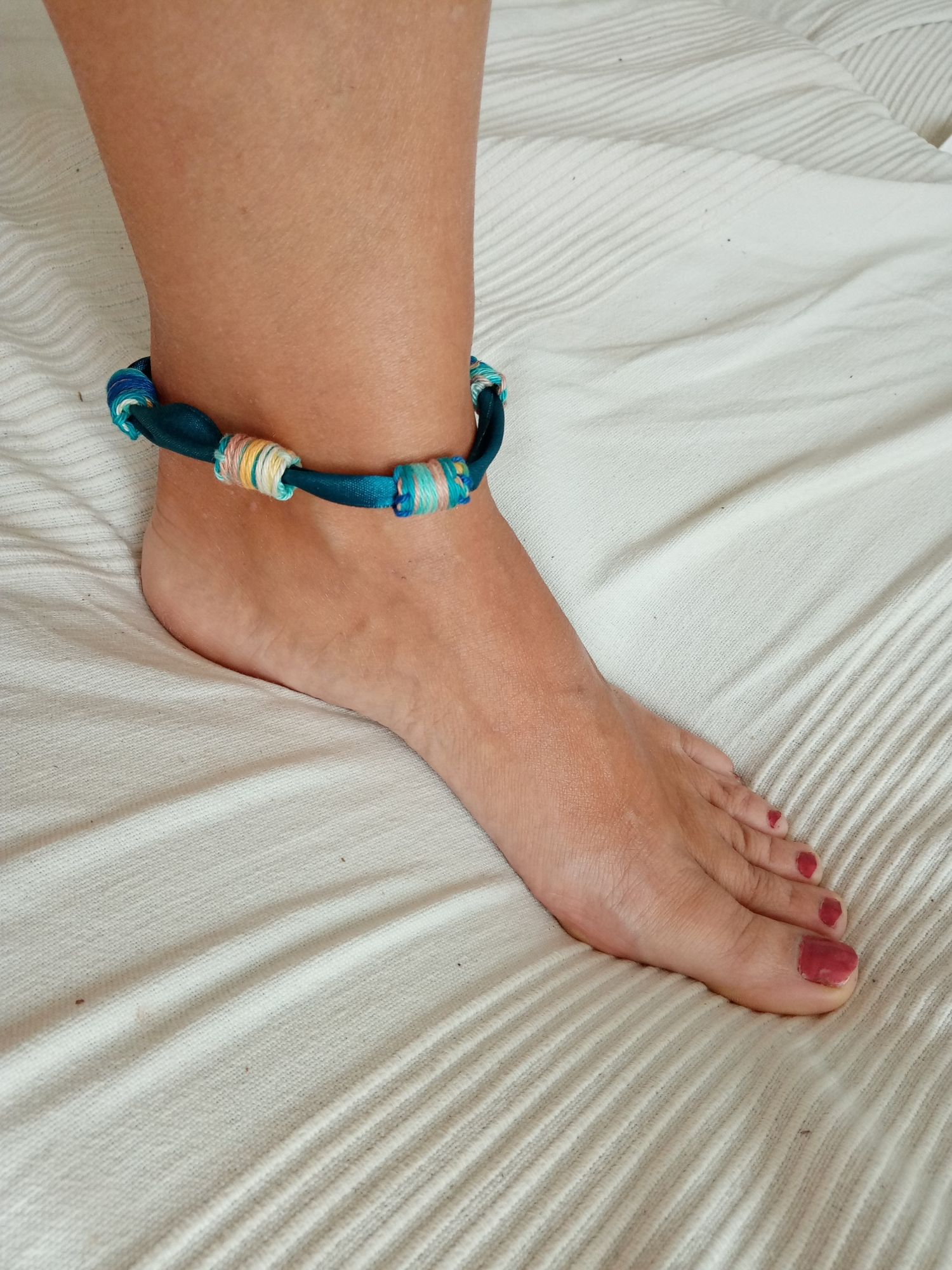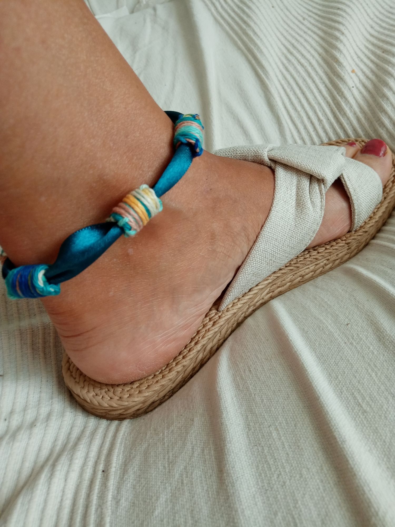 Kényeztesd a lábad textilbogyó bokalánccal! Sárga-kék tarka színben játszó textilbogyó bokaékszer, mely igazán megemeli a nyári hangulatot.
