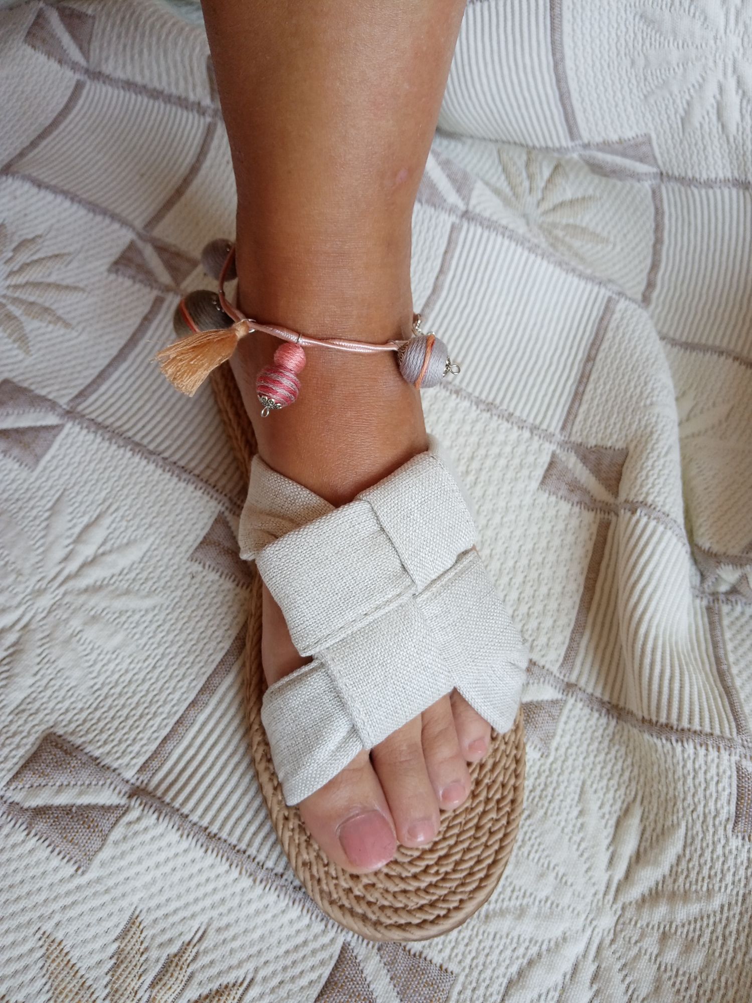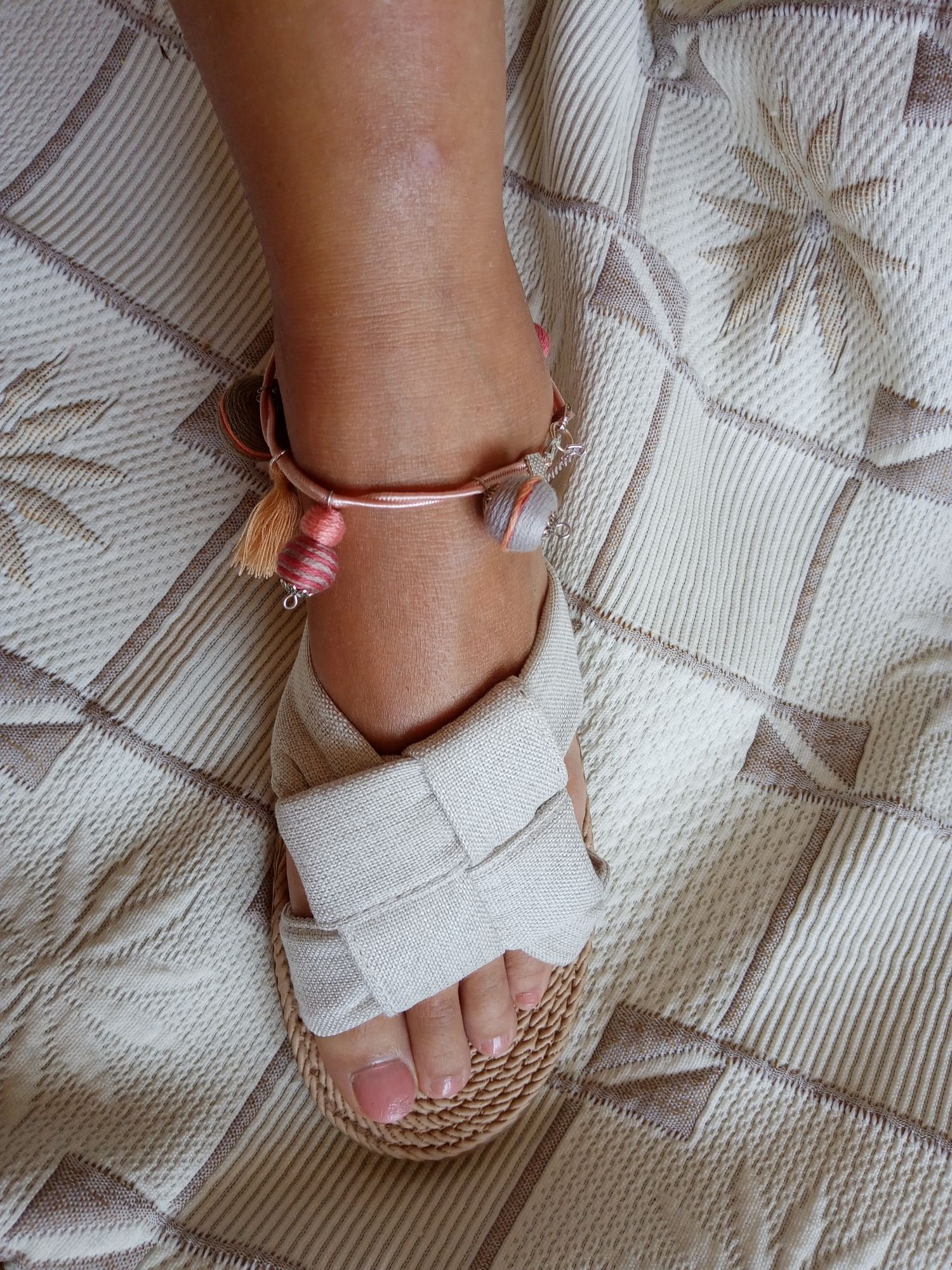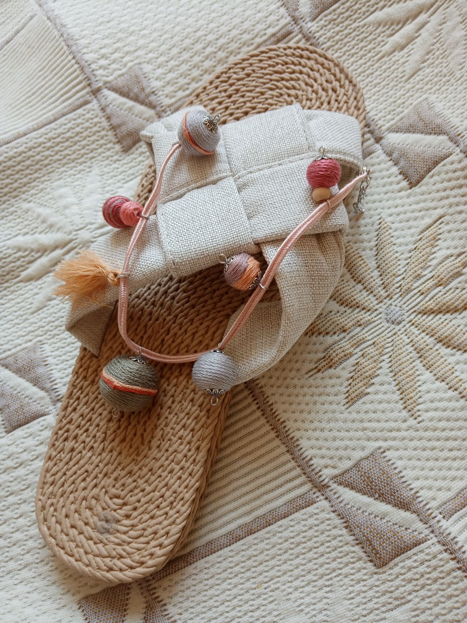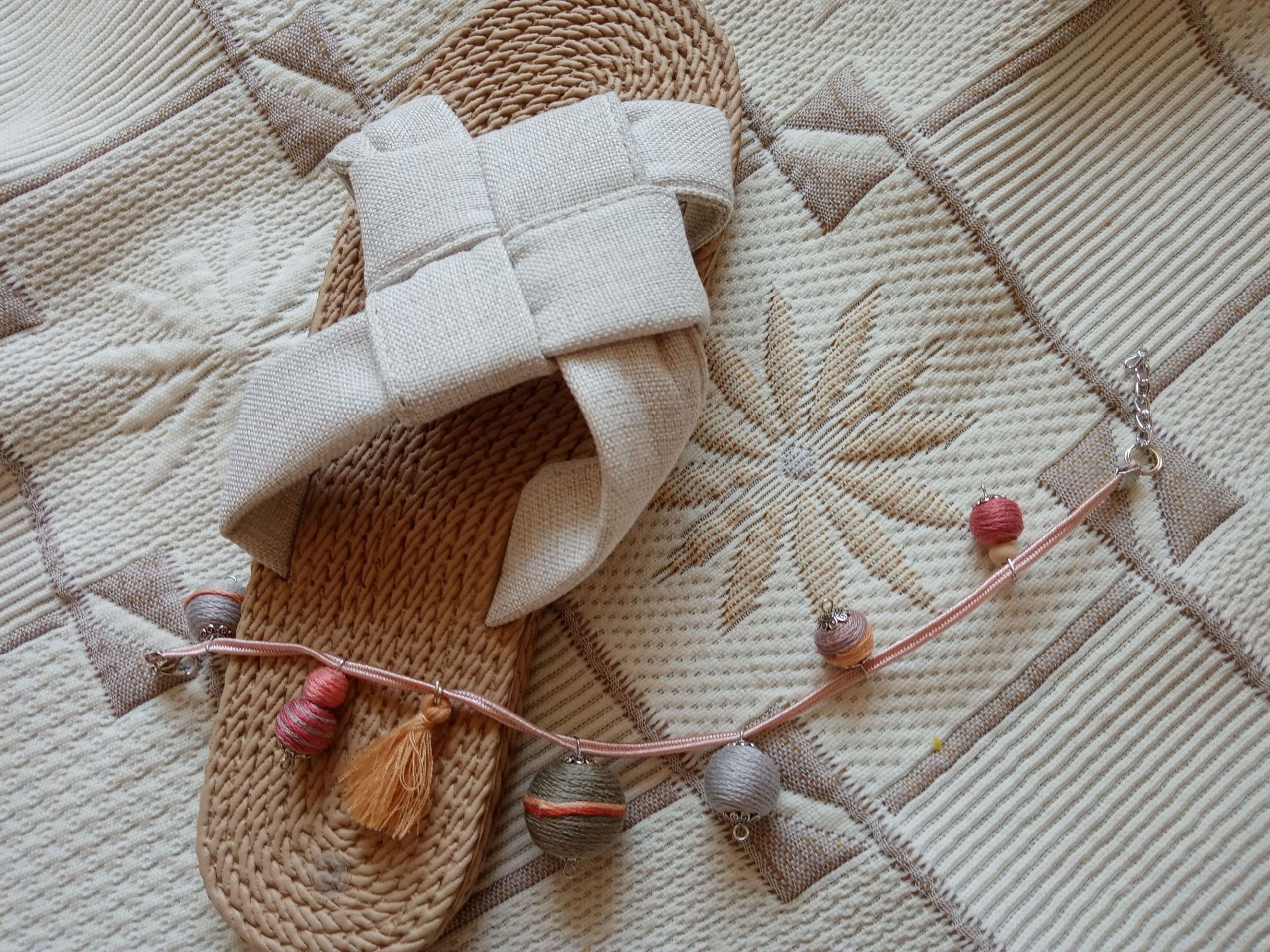 Szürke-bézs-barackszínű gömbös textilbogyó bokaékszer, mely igazán megemeli a nyári hangulatot. Pompás nyári viselet. Lila sújtászsinórra vannak felfűzve a textilbogyók.