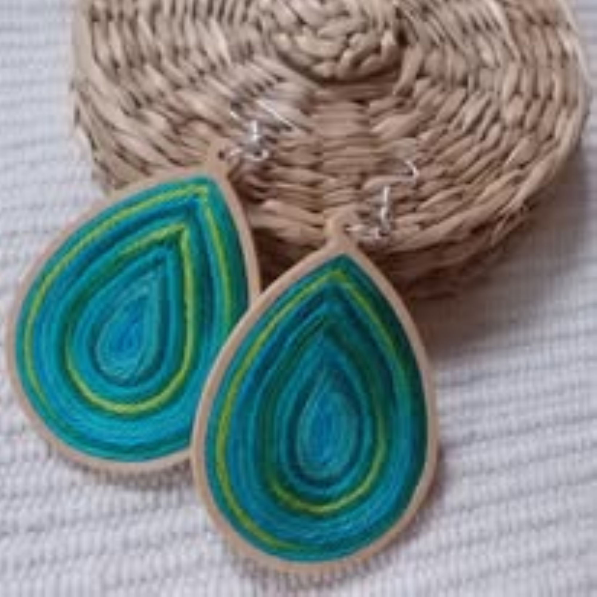 ELKELT Kékes-zöldes csepp alakú fonal fülbevaló ,textil egyedi fülbevaló, fonal fülbevaló, fafülbevaló
