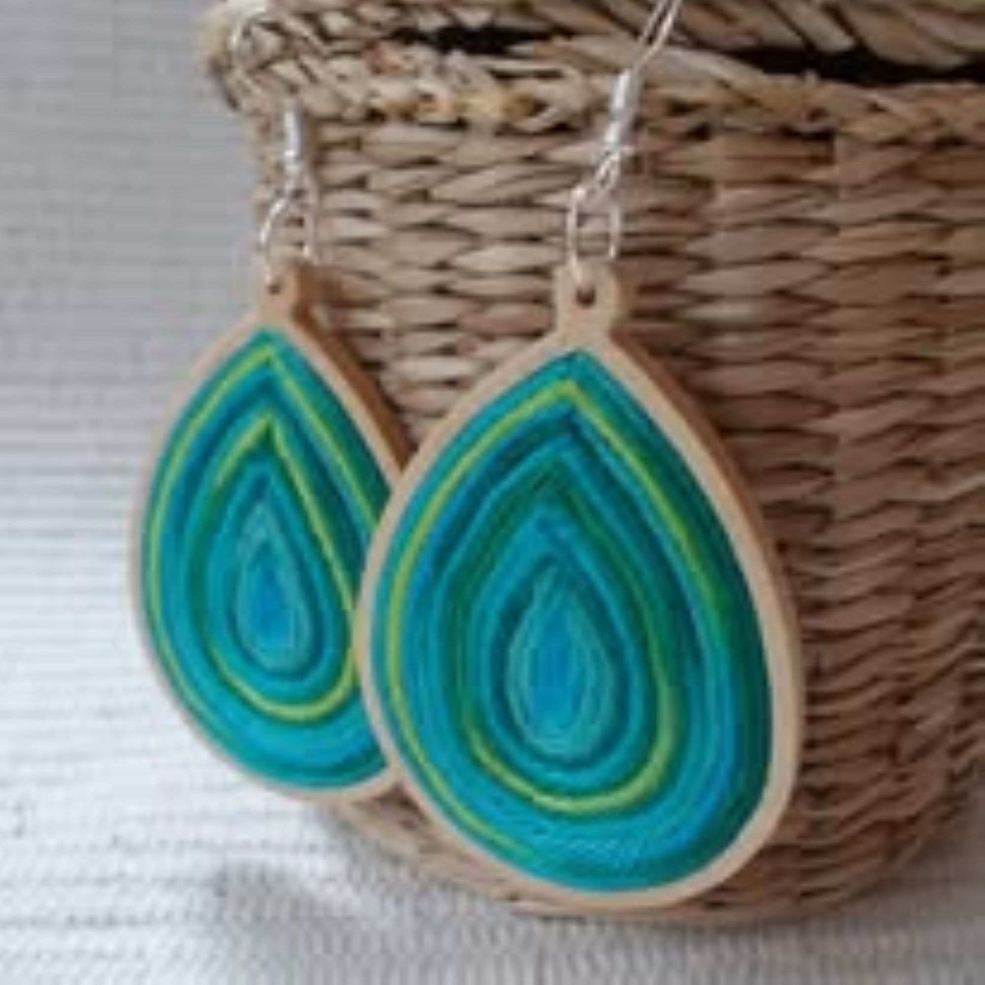 Csepp alakú faalapra készült színes fonal fülbevaló . Kőris fából készült a faalap..