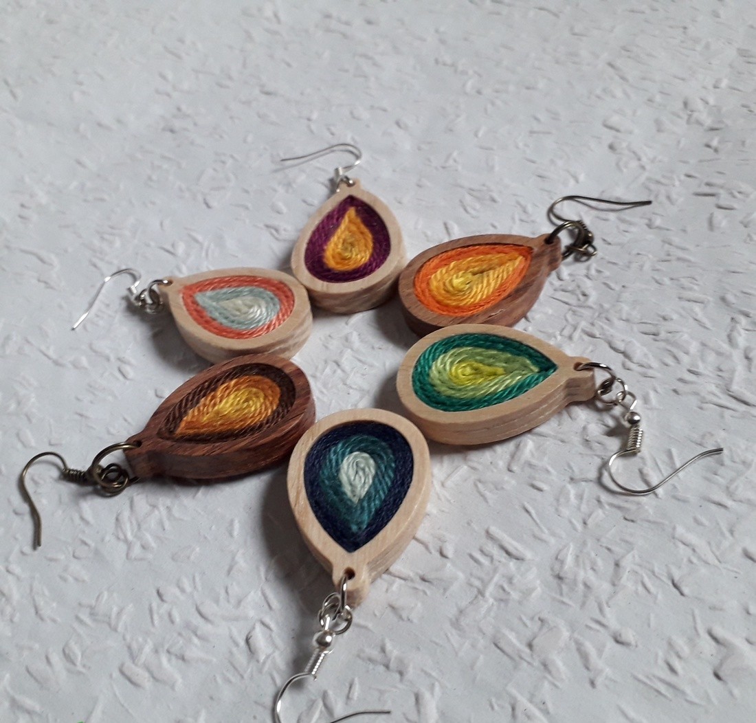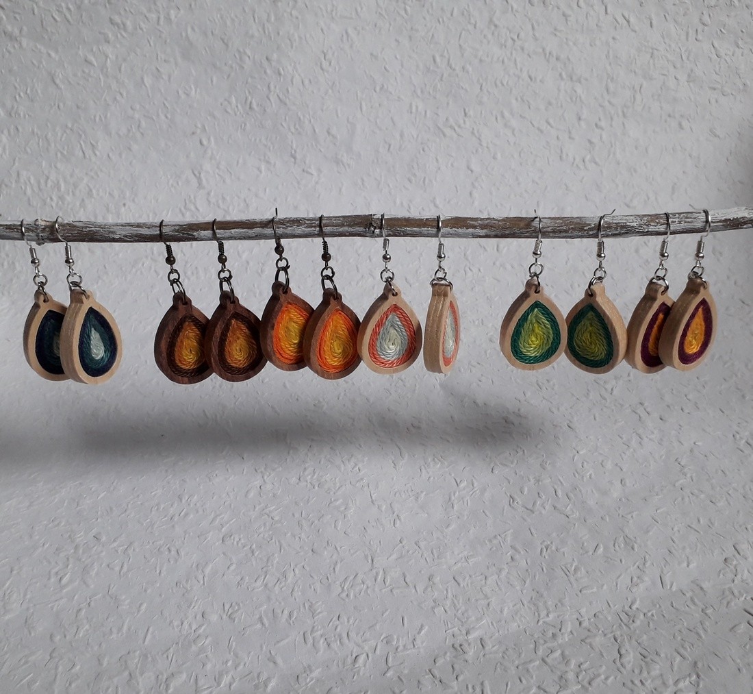 Csepp alakú faalapra készült színes fonal fülbevaló . A faalap kőris fából készült. Egyedi darab. Több darabot is el tudok készíteni rendelésre más színvilágban is . Kék szín árnyalatban készült. Azoknak ajánlom, akik a világosabb,visszafogottabb színeket kedvelik. Könnyű viselet.
