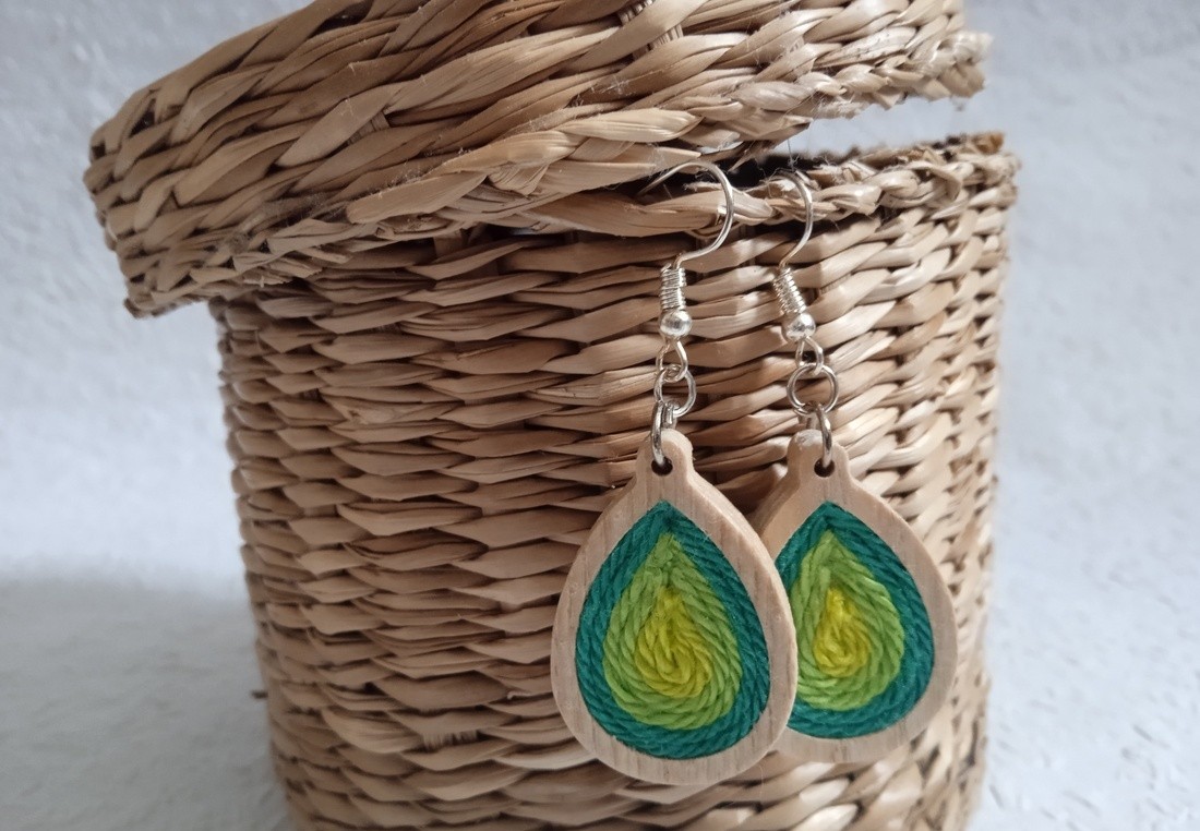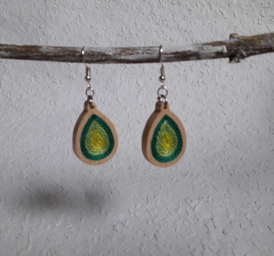 Csepp alakú faalapra készült színes fonal fülbevaló . A faalap kőris fából készült. Egyedi darab. Több darabot is el tudok készíteni rendelésre más színvilágban is . Zöld szín árnyalatban készült. Azoknak ajánlom, akik a világosabb,visszafogottabb színeket kedvelik. Könnyű viselet.