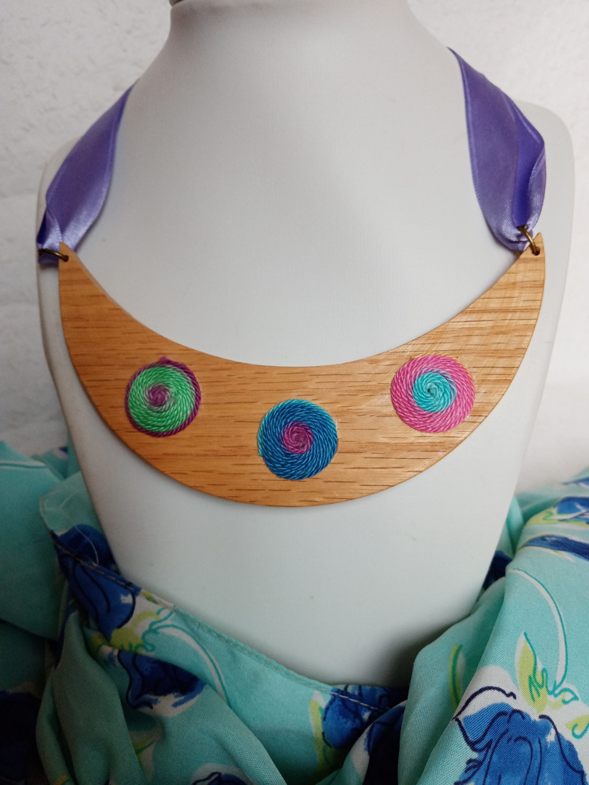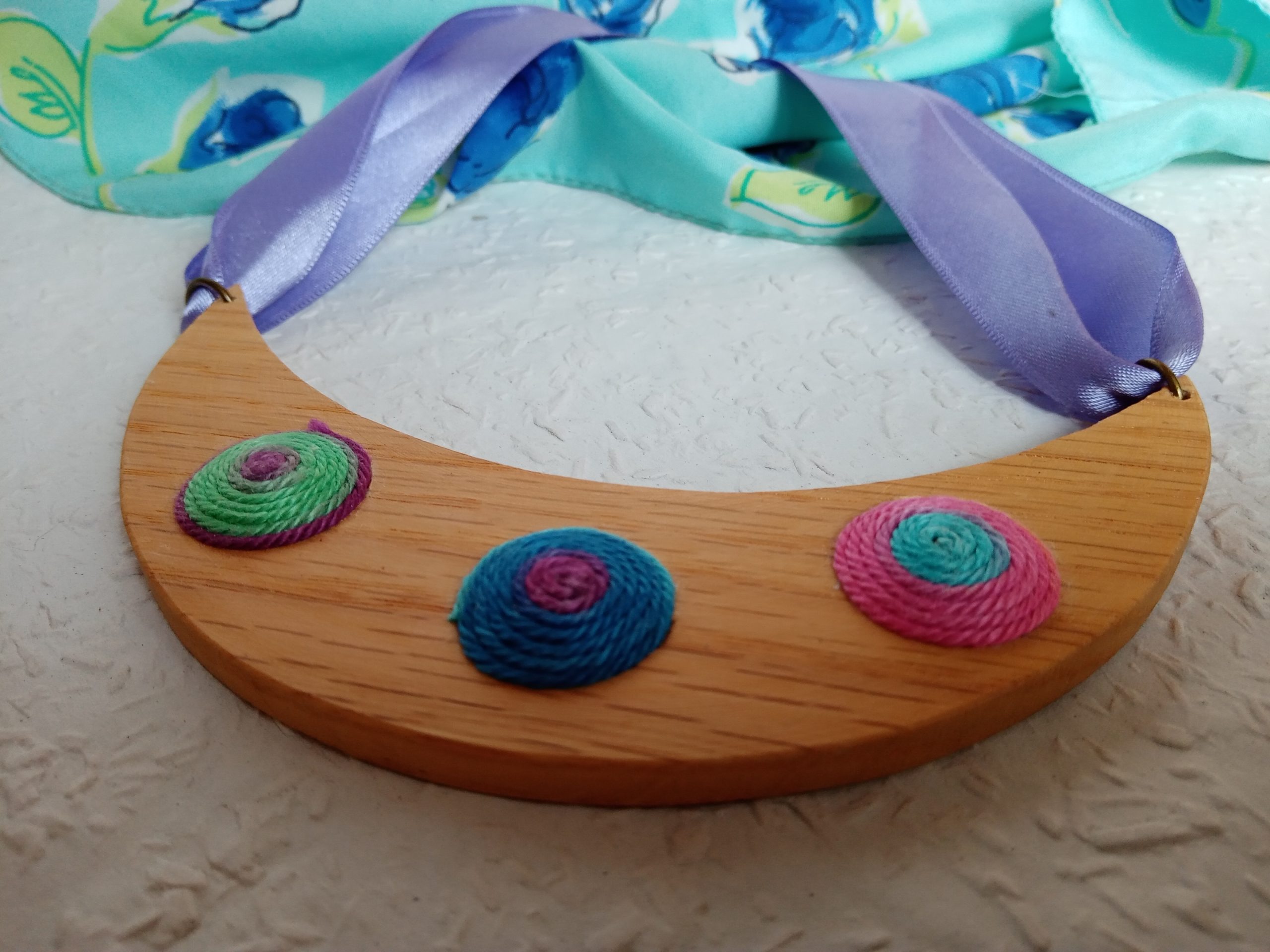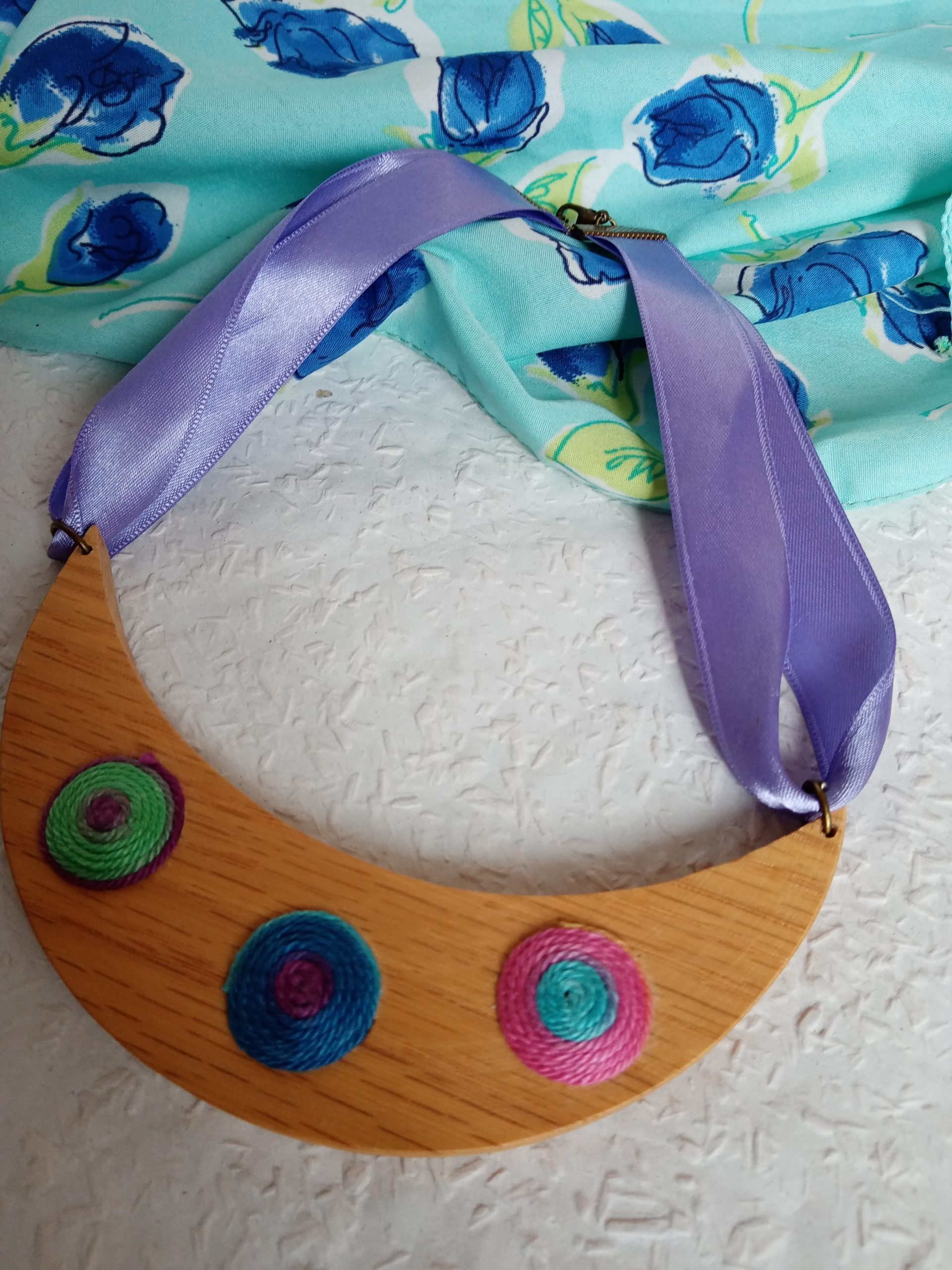 Félhold alakú nyaklánc kék, zöld, pink színekben faalapon . Saját tervezés és kivitelezés. Divatos,különleges kiegészítő minden nő számára. Minden alkotásom kézzel, szeretettel és a részletekre való odafigyeléssel készült, kiváló minőségű fonalak és anyagok felhasználásával. Egyedi darab. A nyaklánc selyemszalagos kapoccsal köthető meg Több darabot is tudok készíteni rendelésre.