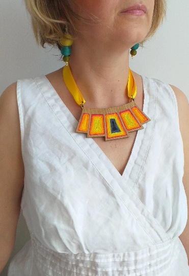 Inka elnevezésű nyaklánc sötétkék, narancs és citromsárga színekben. Ezzel a nyaklánccal is minden bizonnyal rengeteg figyelmet fogsz kapni viselete során. Számomra ez a stílus az inkák világát jeleníti meg. Saját tervezés és kivitelezés. Divatos,különleges kiegészítő minden nő számára. Minden alkotásom kézzel, szeretettel és a részletekre való odafigyeléssel készült, kiváló minőségű fonalak és anyagok felhasználásával. Egyedi darab. A nyaklánc selyemszalagos kapoccsal köthető meg Több darabot is tudok készíteni rendelésre.
