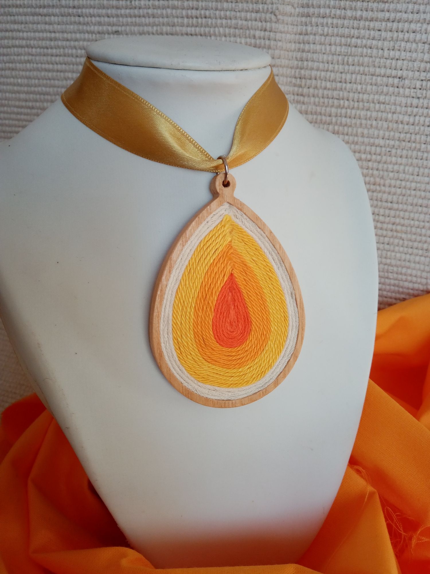 Csepp alakú faalapra készült színes fonal nyaklánc. Kőris fából készült a faalap,lakkozott. Bib ékszer, azoknak, akik a nagyobb darabokat kedvelik. Több darabot is el tudok készíteni rendelésre más színvilágban is .