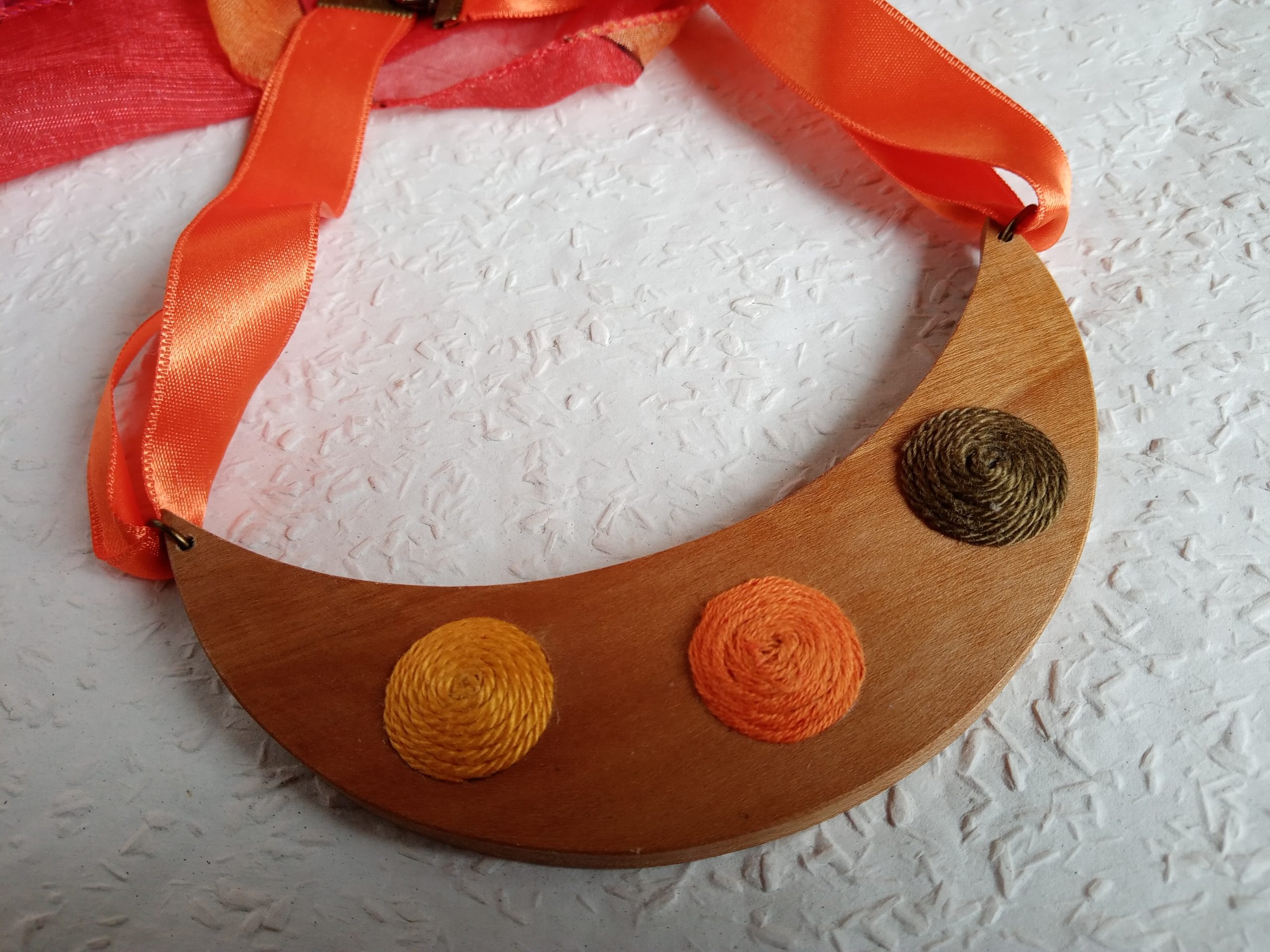 Félhold alakú nyaklánc narancssárga, sárga, zöld színekben faalapon . Saját tervezés és kivitelezés. Divatos,különleges kiegészítő minden nő számára. Minden alkotásom kézzel, szeretettel és a részletekre való odafigyeléssel készült, kiváló minőségű fonalak és anyagok felhasználásával. Egyedi darab.