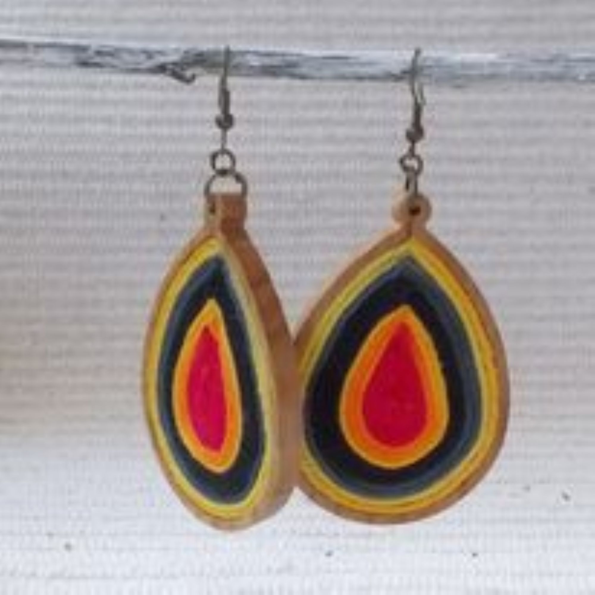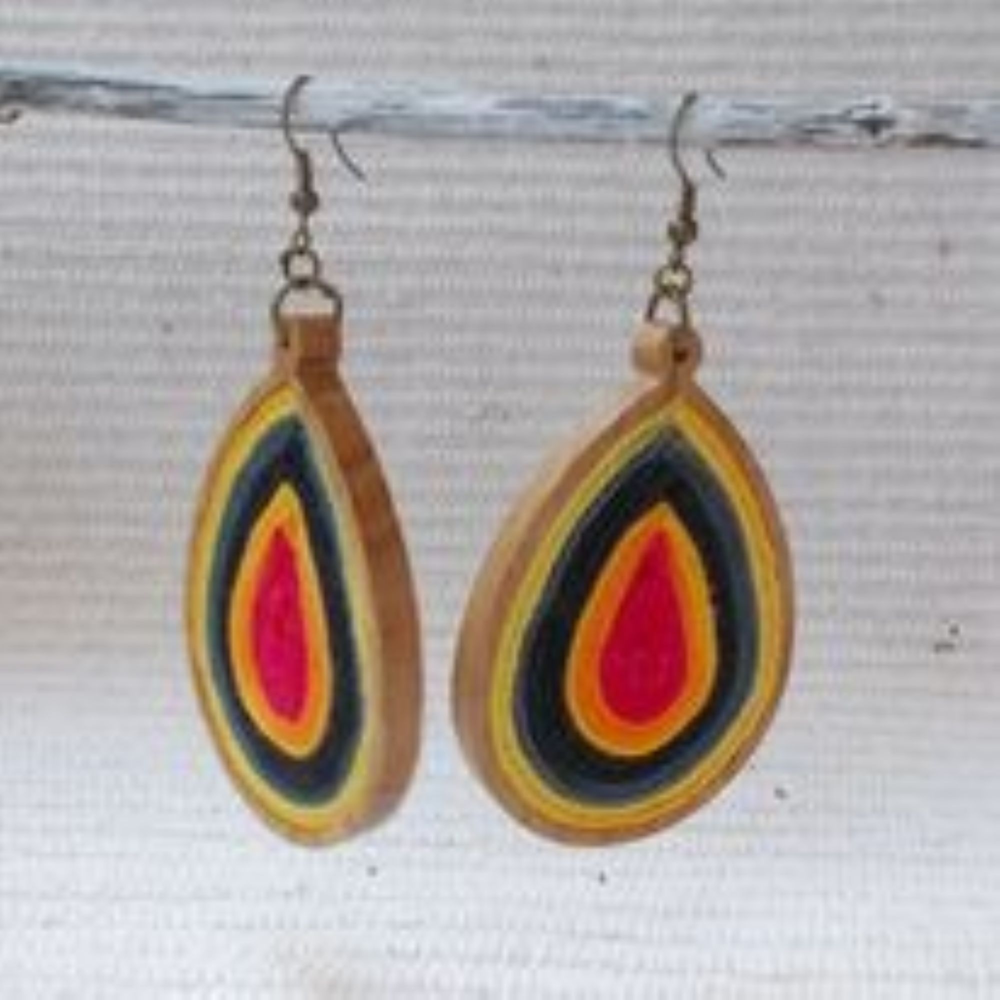 Csepp alakú faalapra készült színes fonal fülbevaló . Kőris fából készült a faalap..