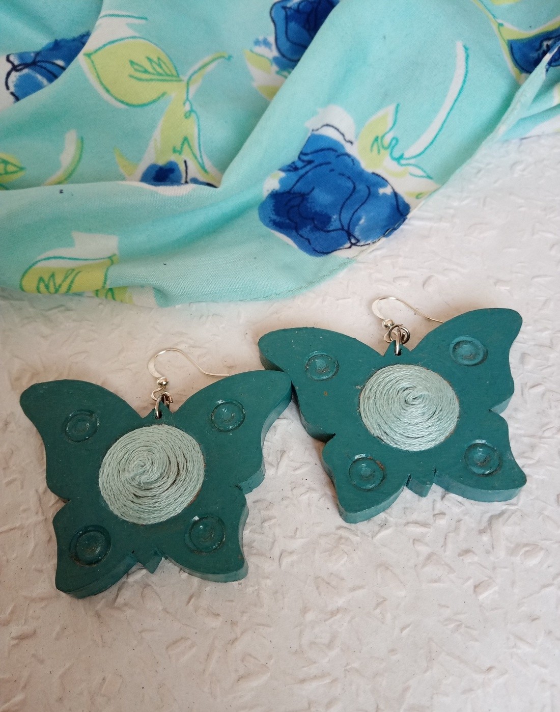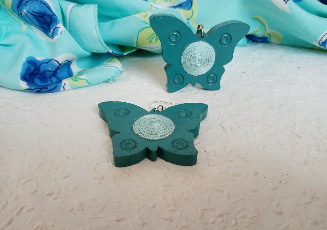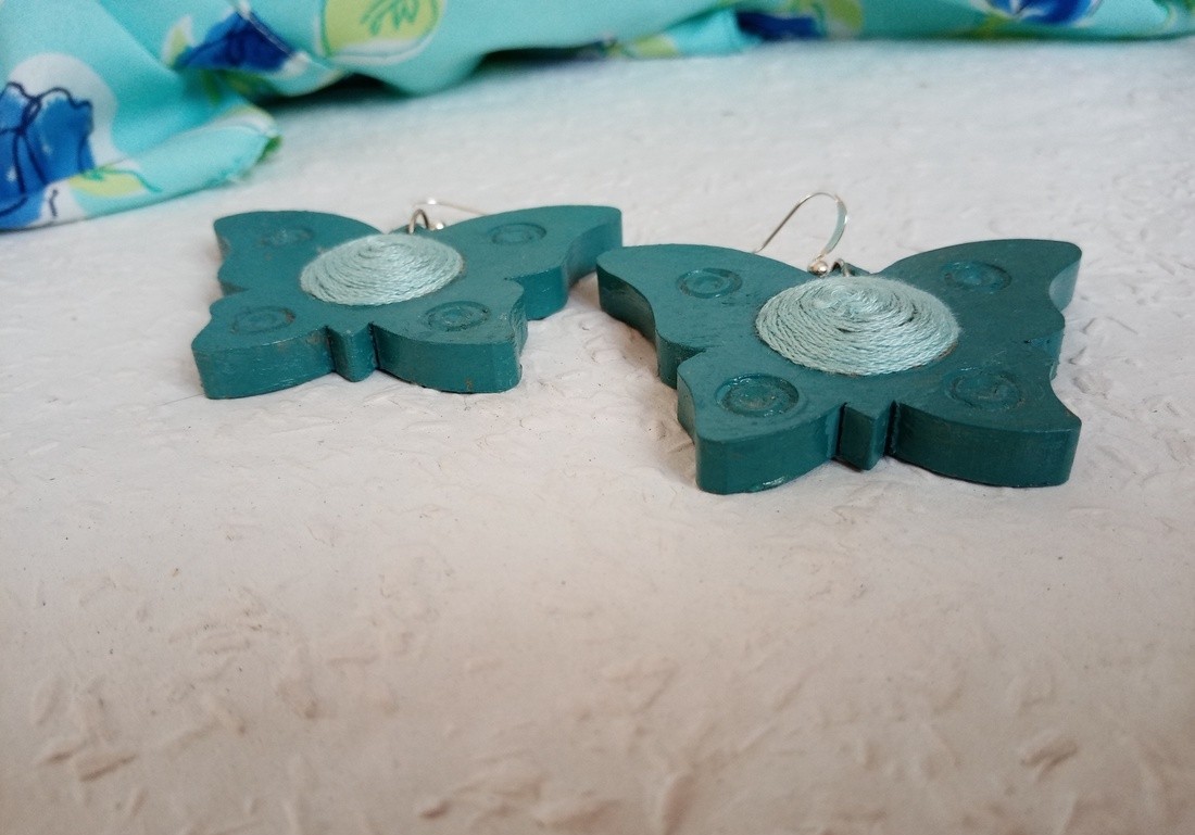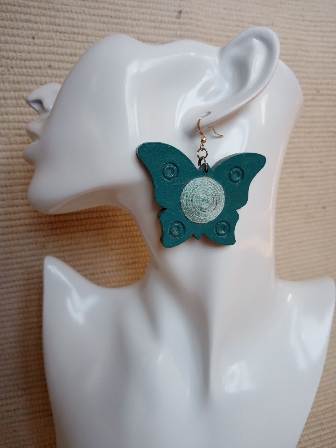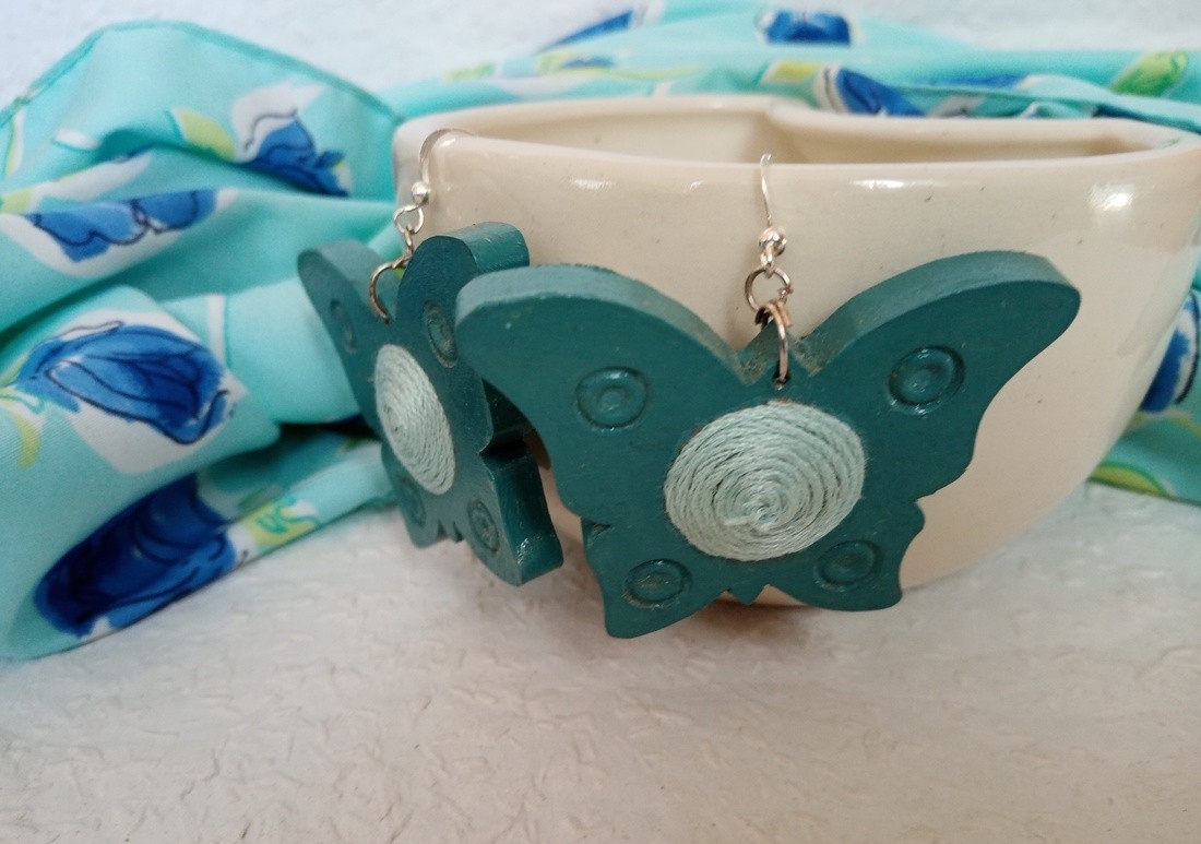 Fából készült fülbevaló, melynek a közepén halvány kék fonal gömb domborodik ki.