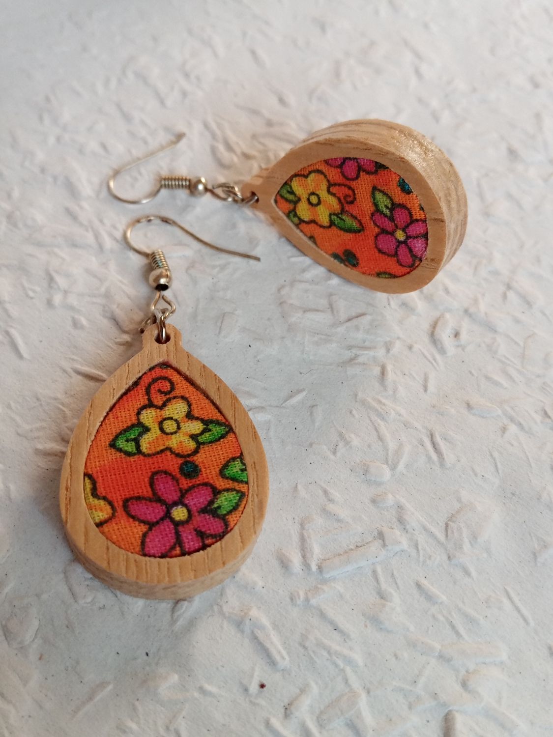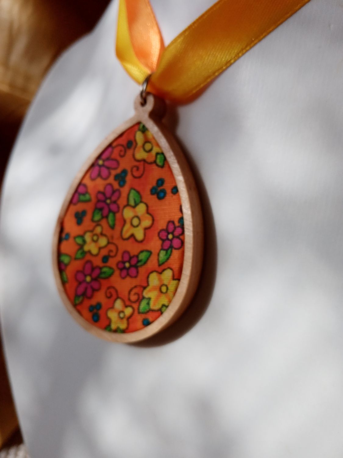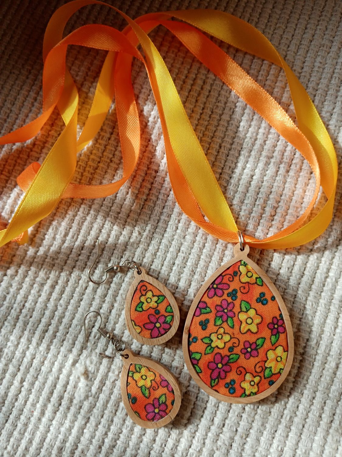 Csepp alakú faalapra készült narancsos alapon virágos fülbevaló és nyaklánc . A faalap kőris fából készült. Egyedi darab. Több darabot is el tudok készíteni rendelésre más színvilágban is . Azoknak ajánlom, akik az élénkebb színeket kedvelik. Könnyű viselet.