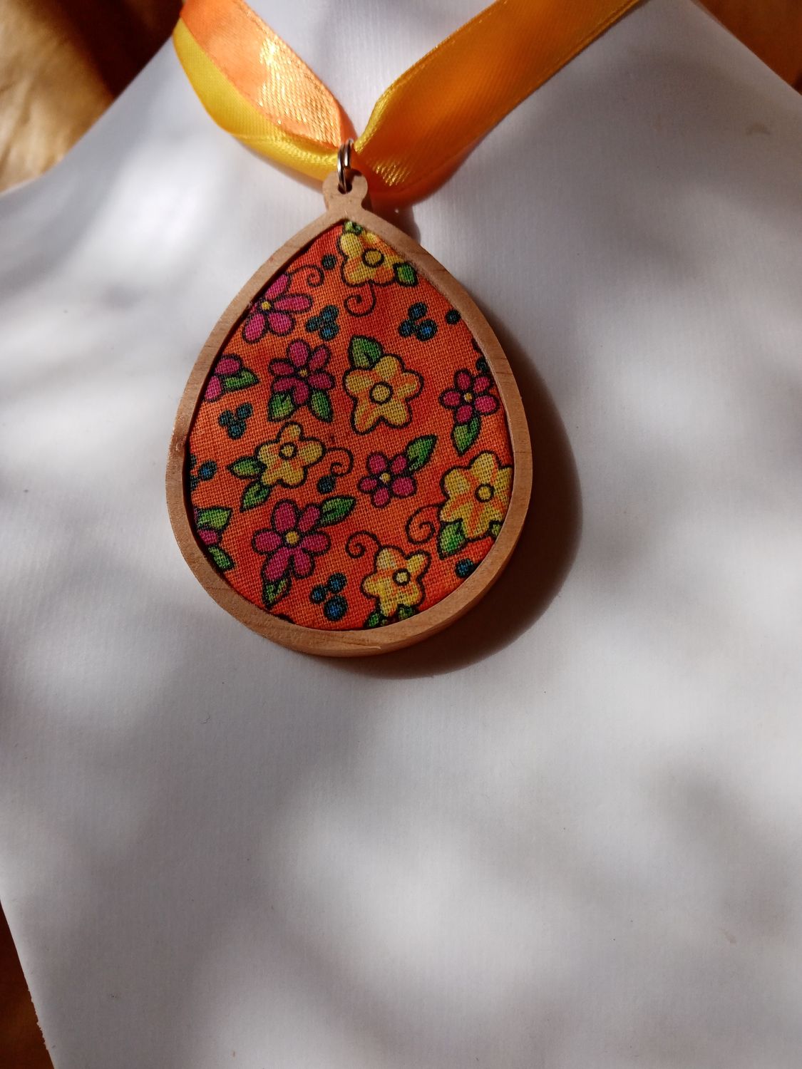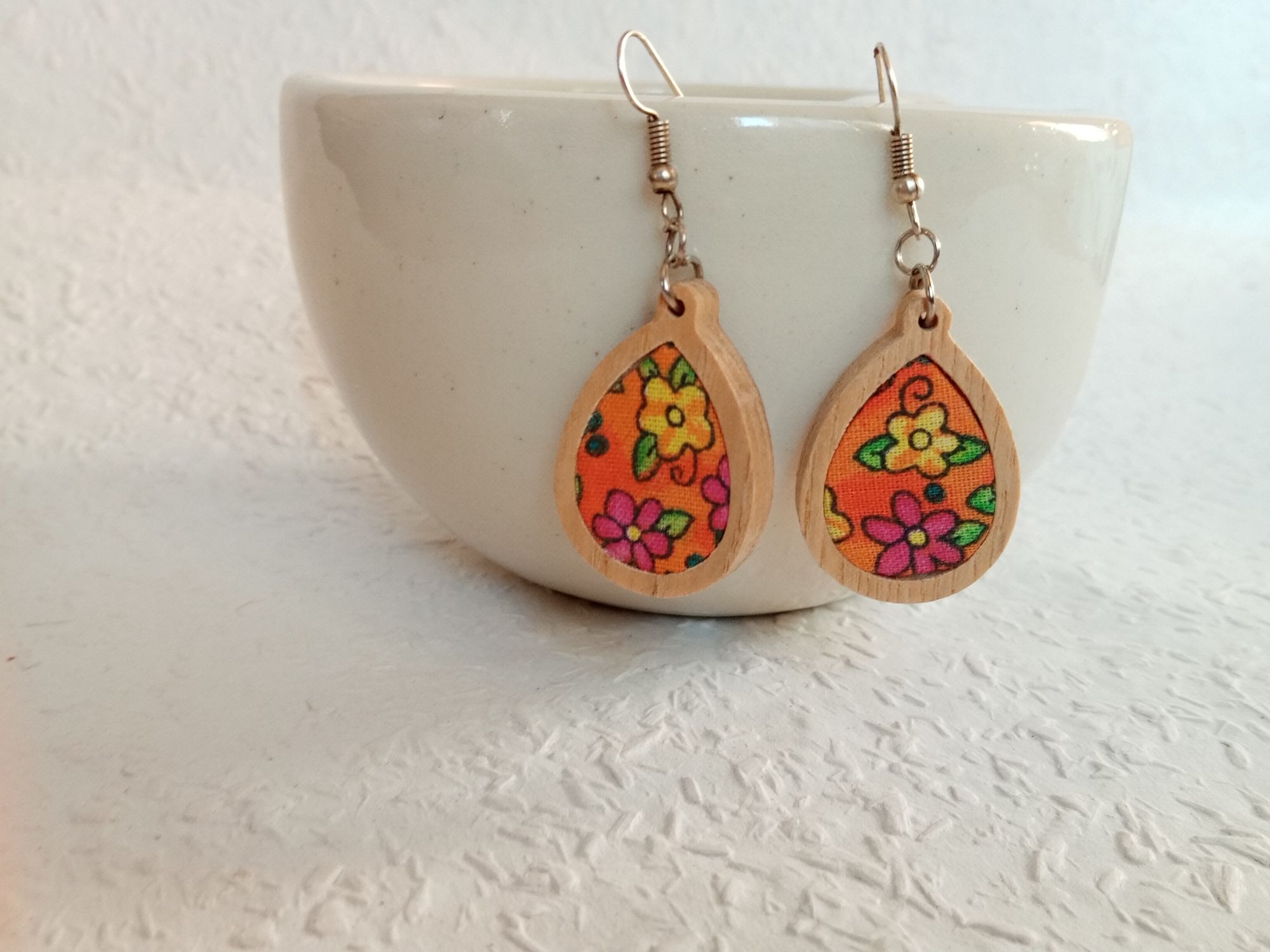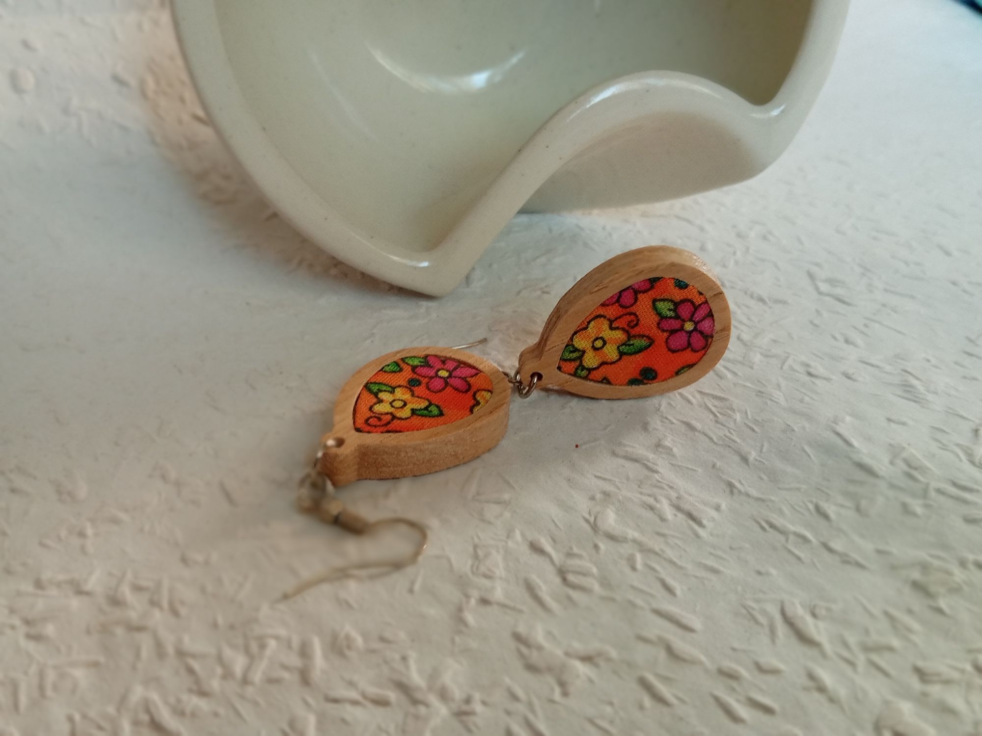Csepp alakú faalapra készült narancsos alapon virágos fülbevaló és nyaklánc . A faalap kőris fából készült. Egyedi darab. Több darabot is el tudok készíteni rendelésre más színvilágban is . Azoknak ajánlom, akik az élénkebb színeket kedvelik. Könnyű viselet.