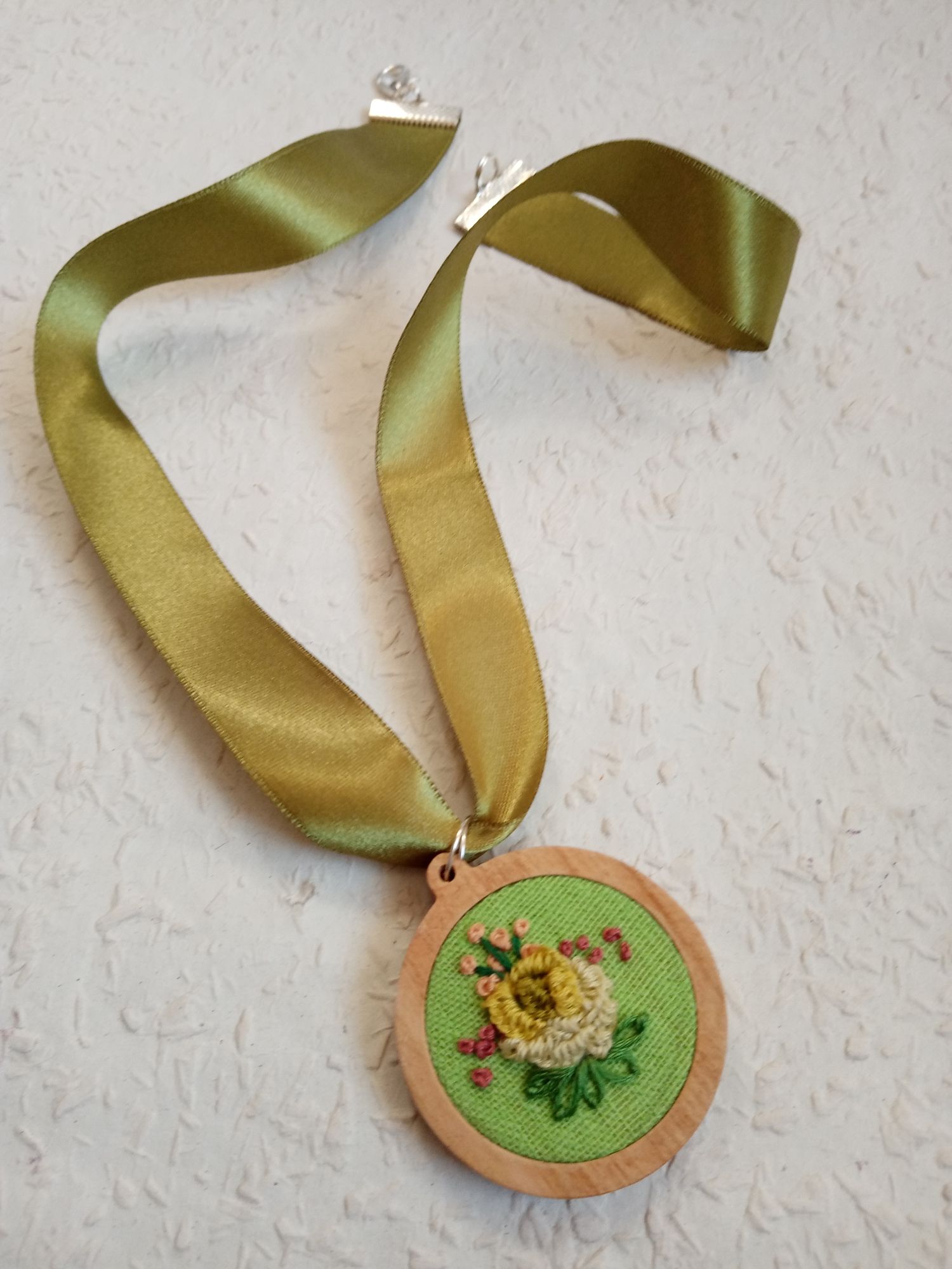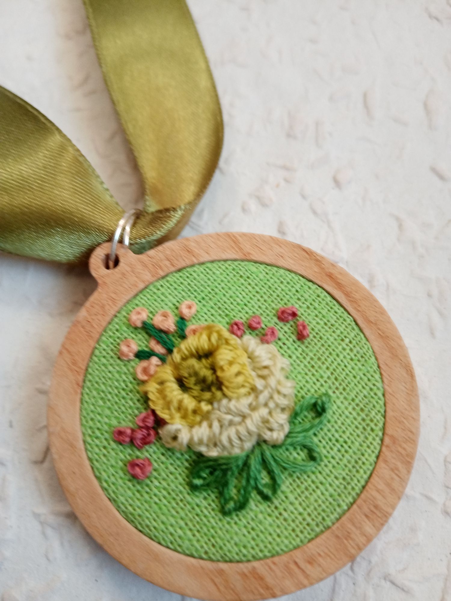Vintage stílust idéző mini hímzett egyedi rózsaszínű nyaklánc zöld lenszöveten kerek alakú bükk fakeretben. Zöld selyemszalaggal ellátva. Ajánlom Neked ezt az ékszert, ha szeretnéd elvarázsolni a környezetedben élőket!