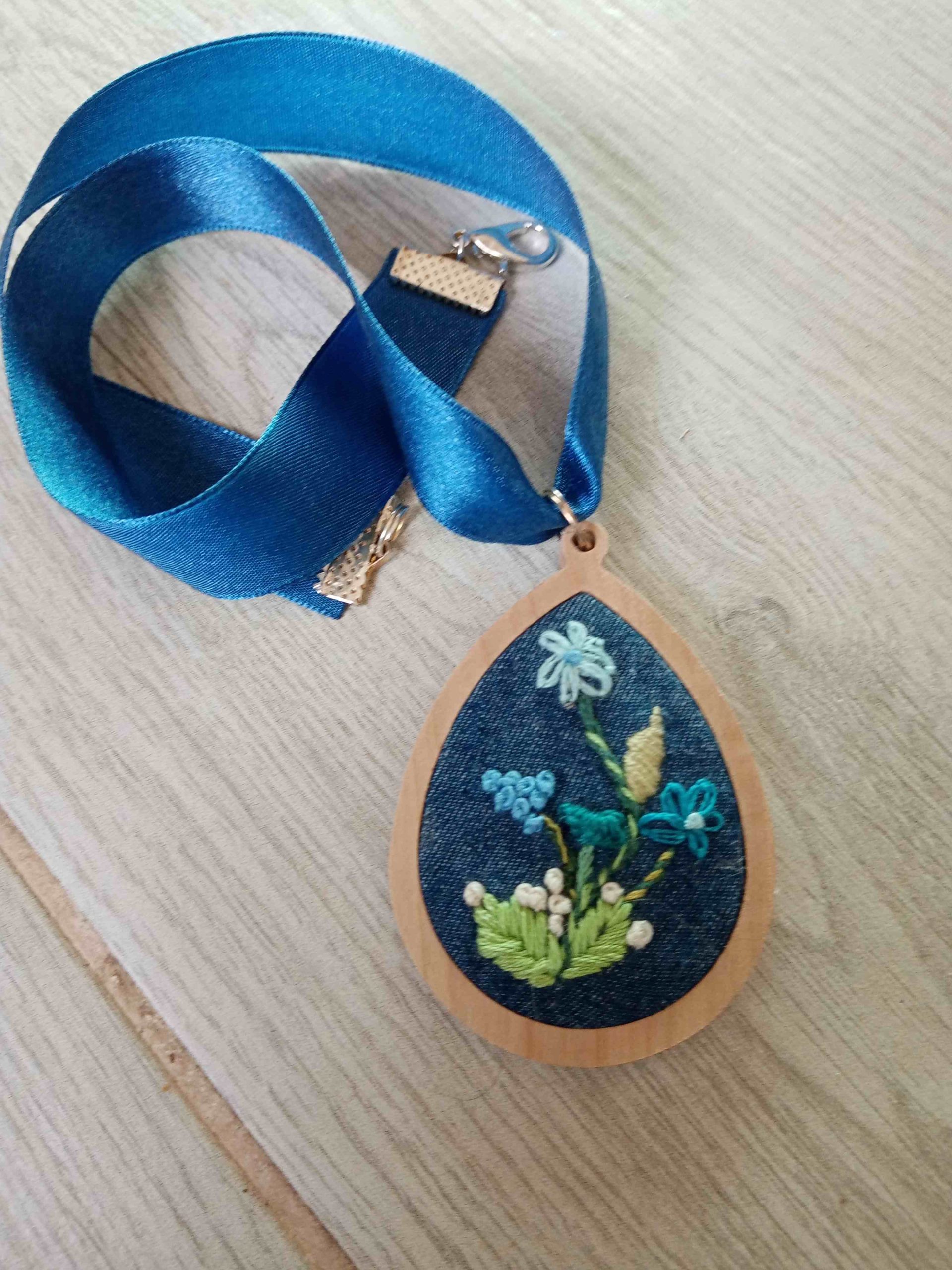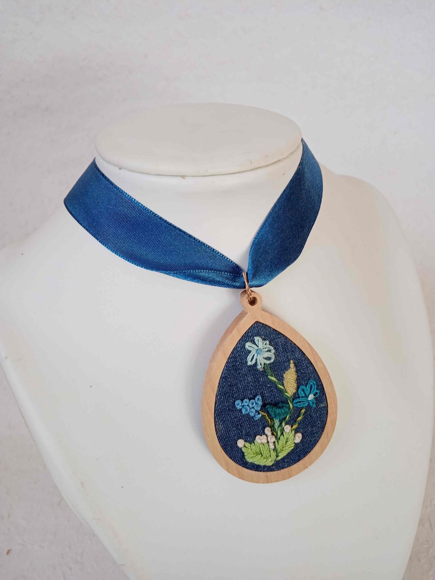 Farmer anyagra hímzett 3D-s virágok cseppalakú faalapban.
