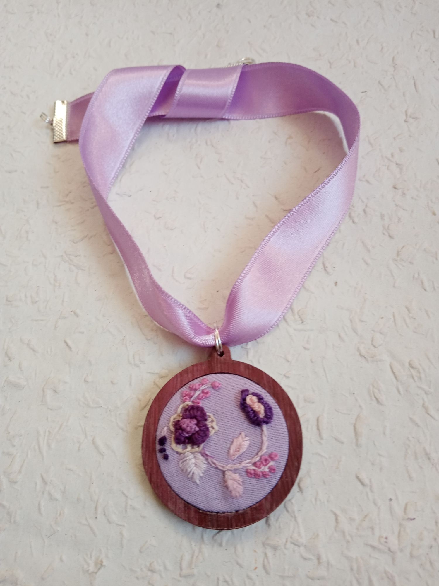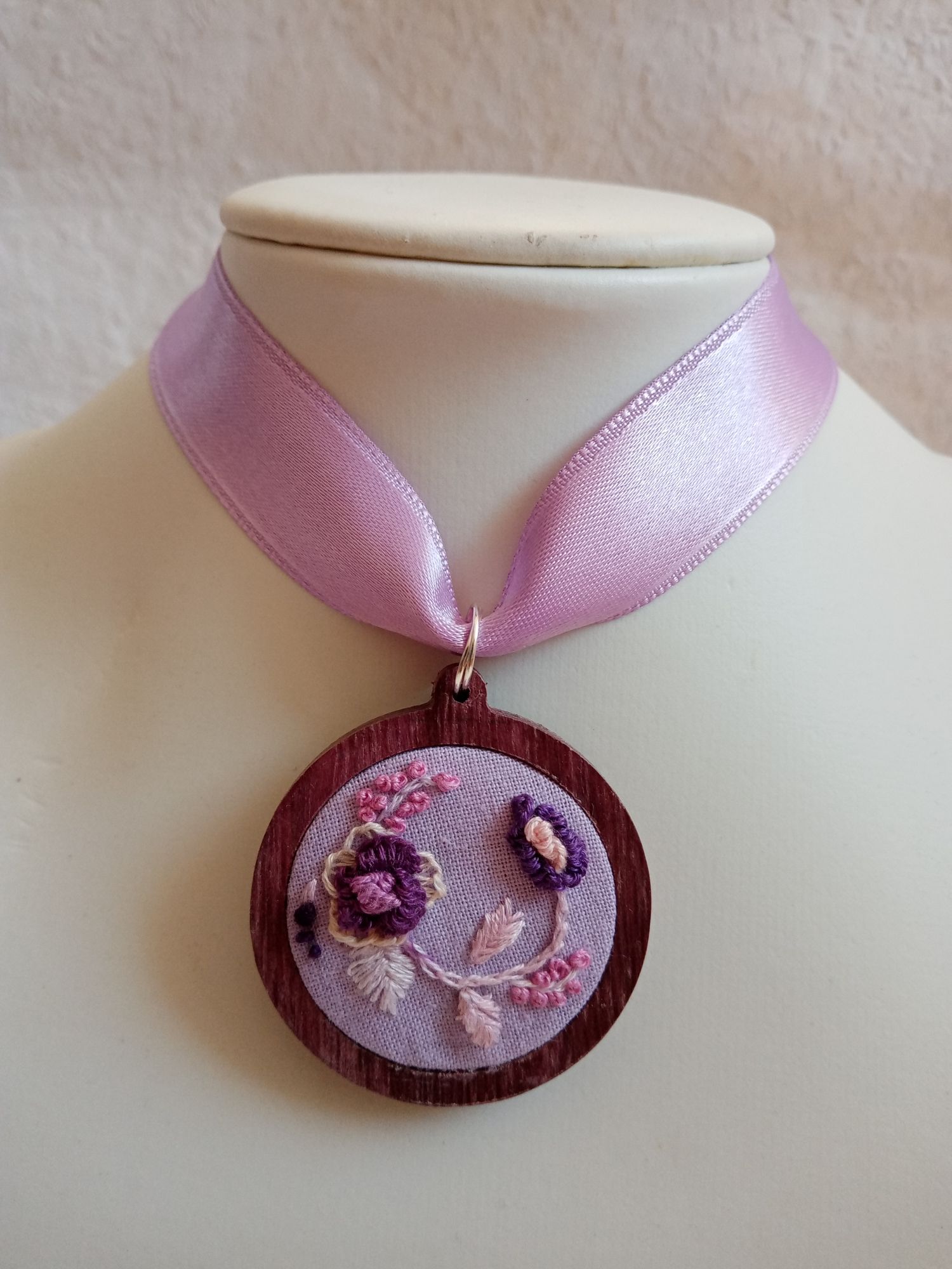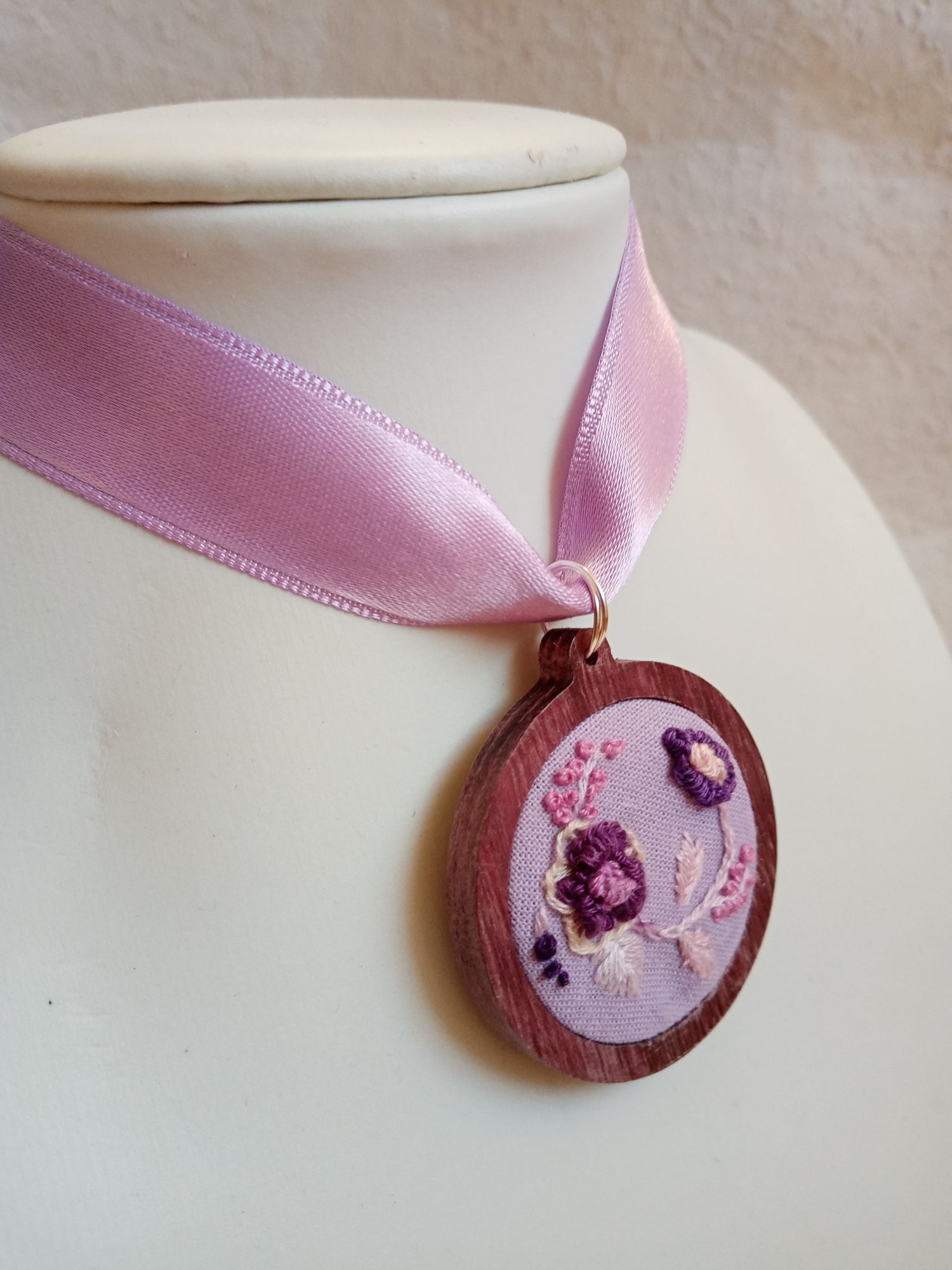 Vintage stílust idéző mini hímzett rózsaszínű nyaklánc lila lenszöveten kerek alakú amaranth fakeretben. Lila selyemszalaggal ellátva. Ezzel a nyaklánccal divatossá varázsolhatod a mindennapjaidat!