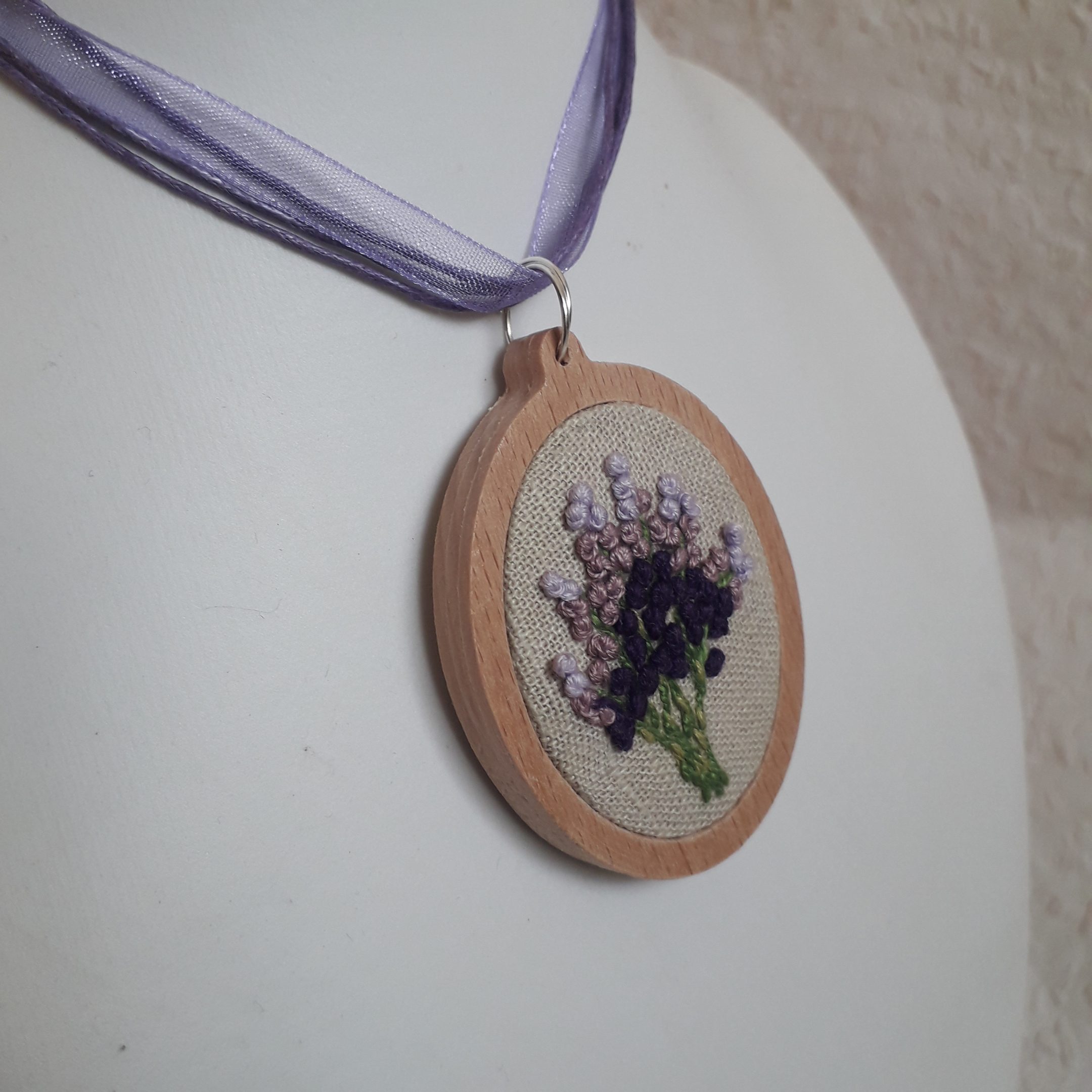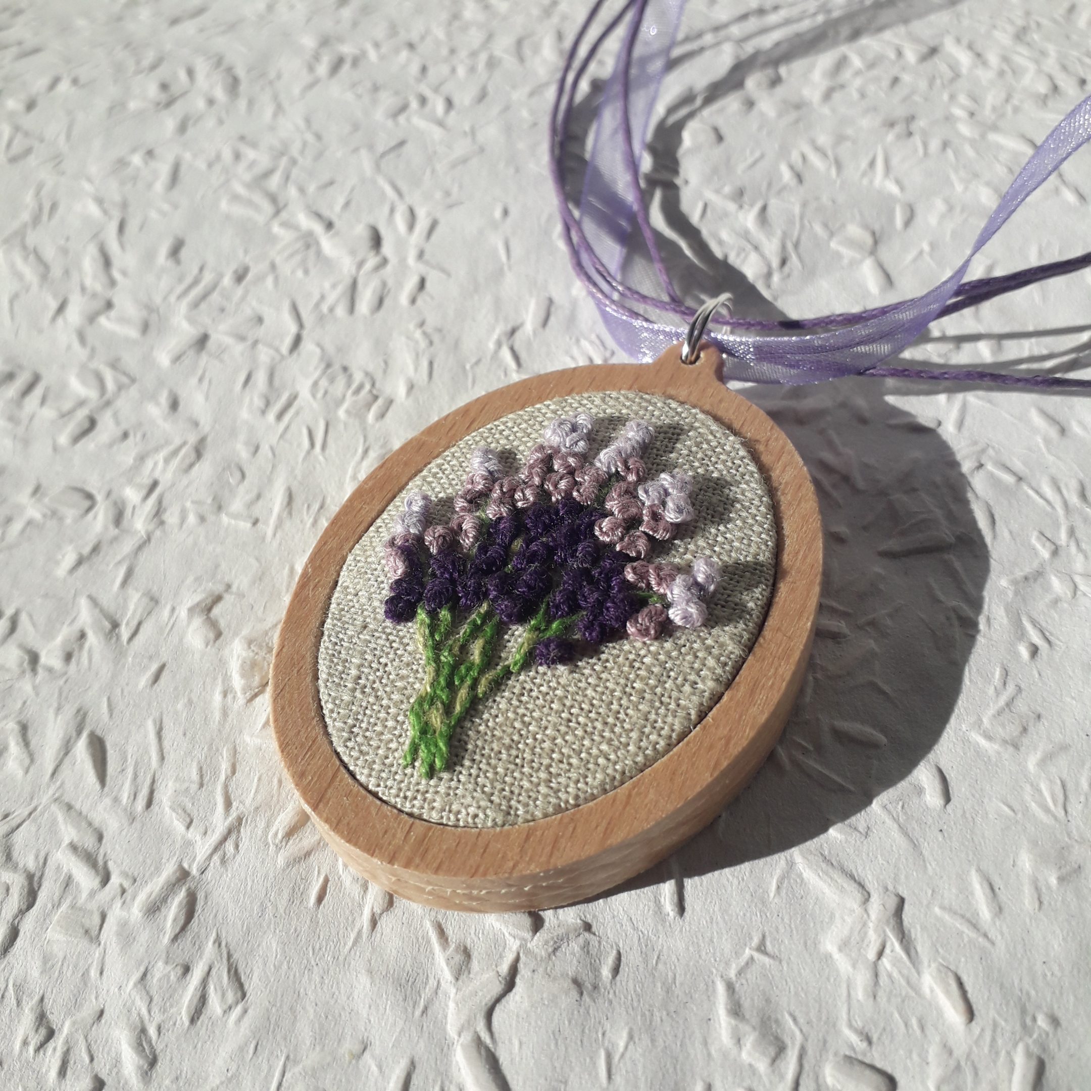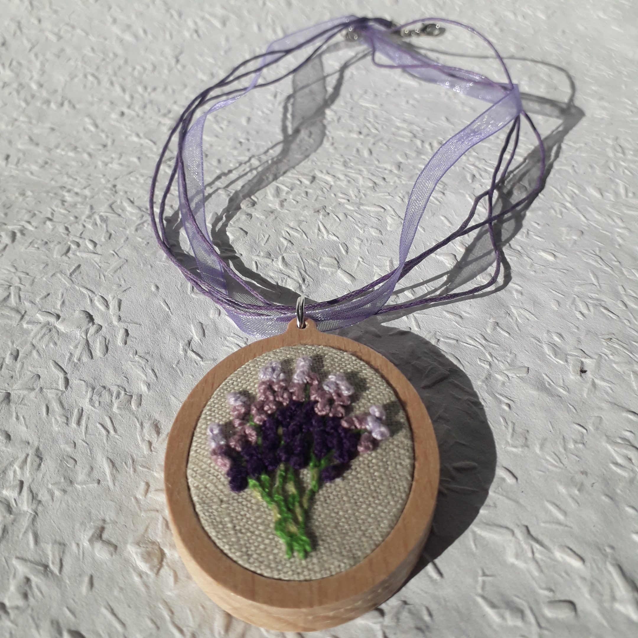 Levendulás brazíl hímzéssel készült medál