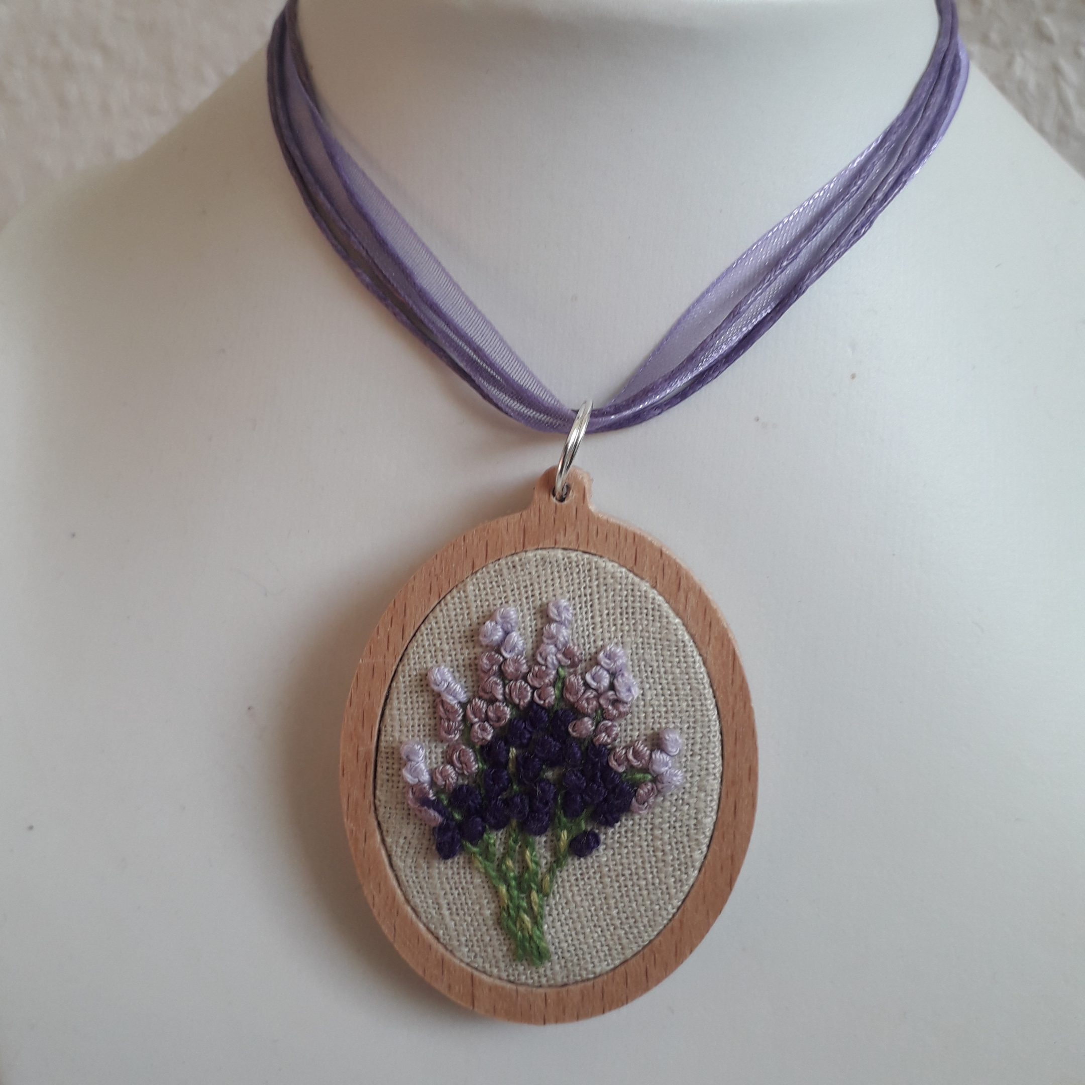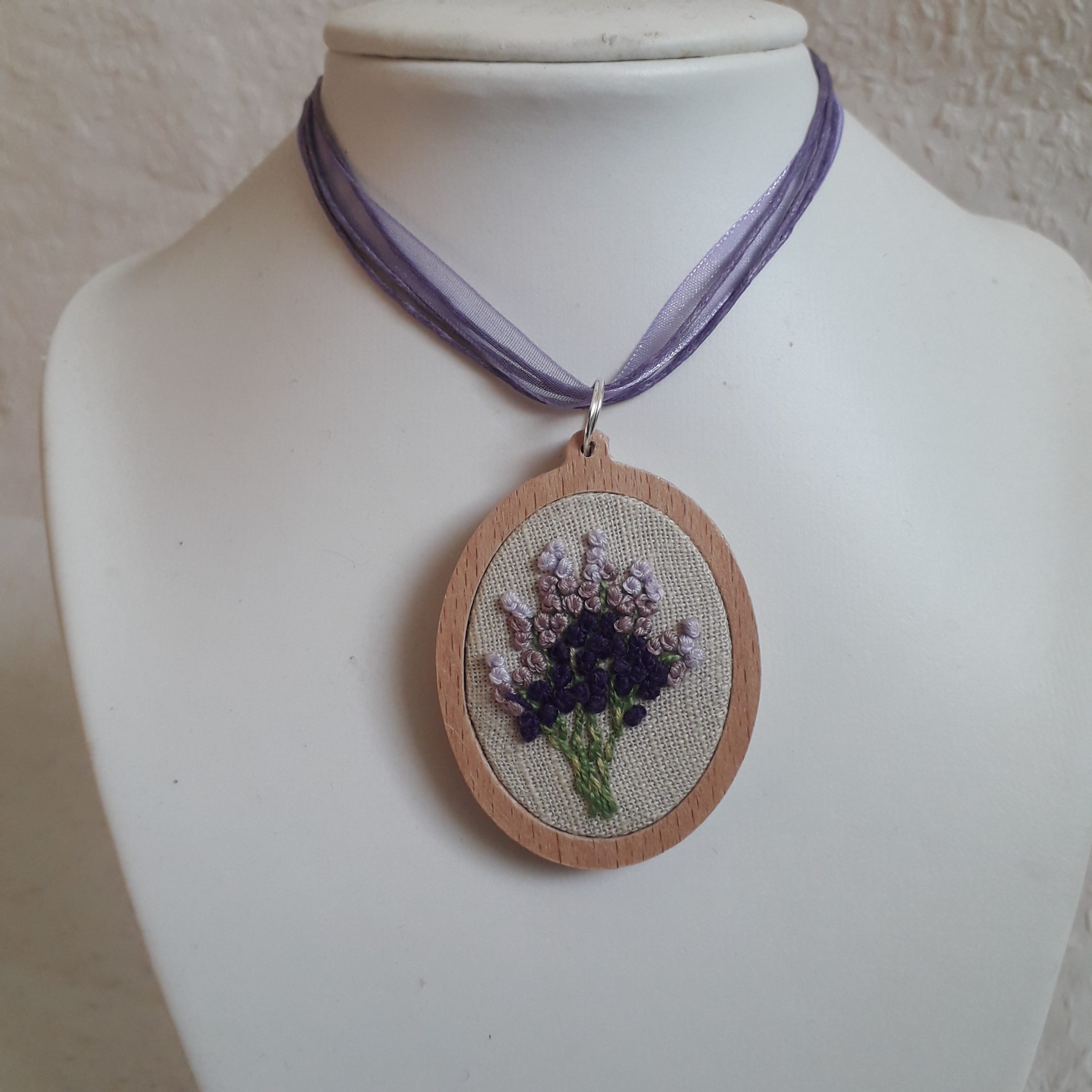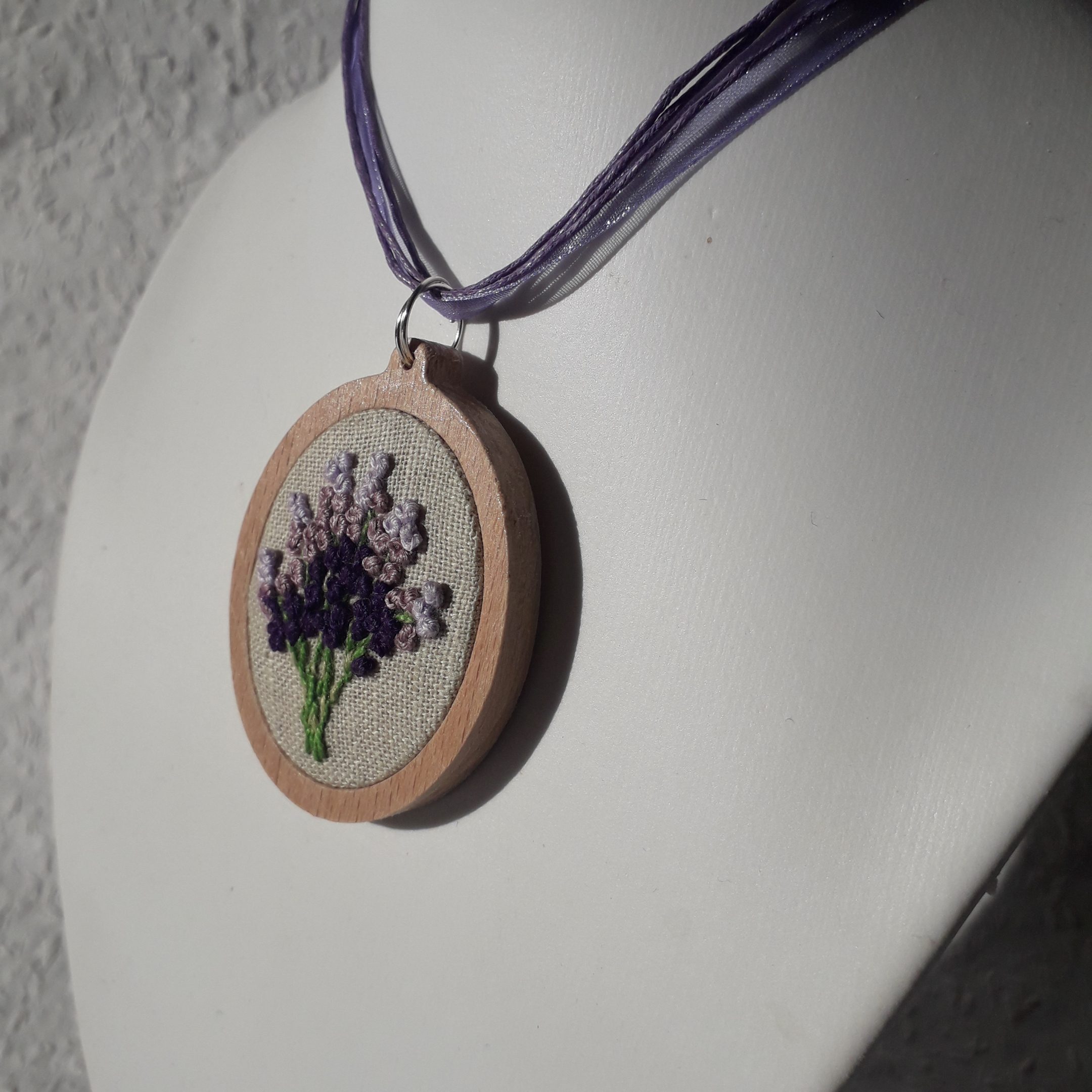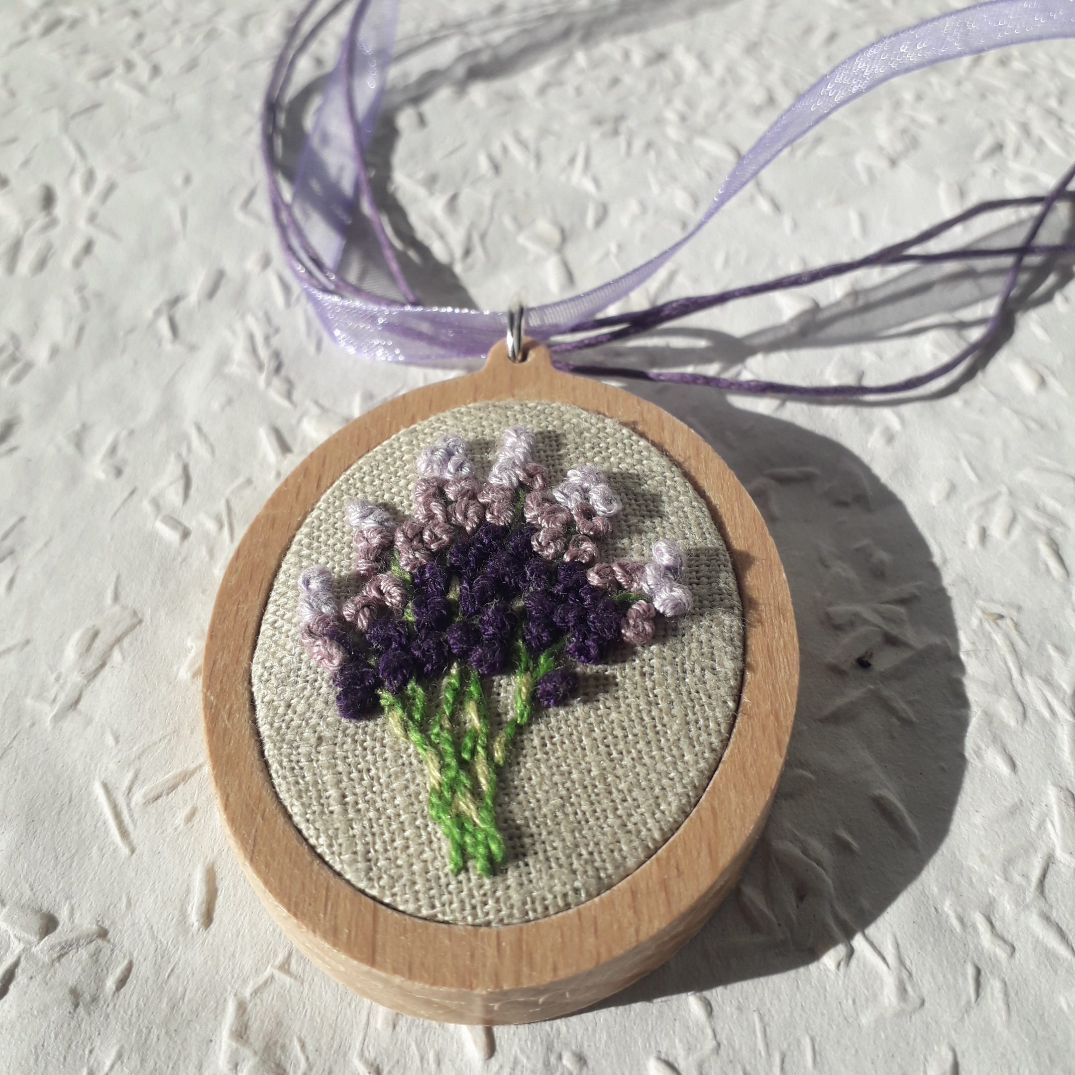 Levendulás brazíl hímzéssel készült medál
