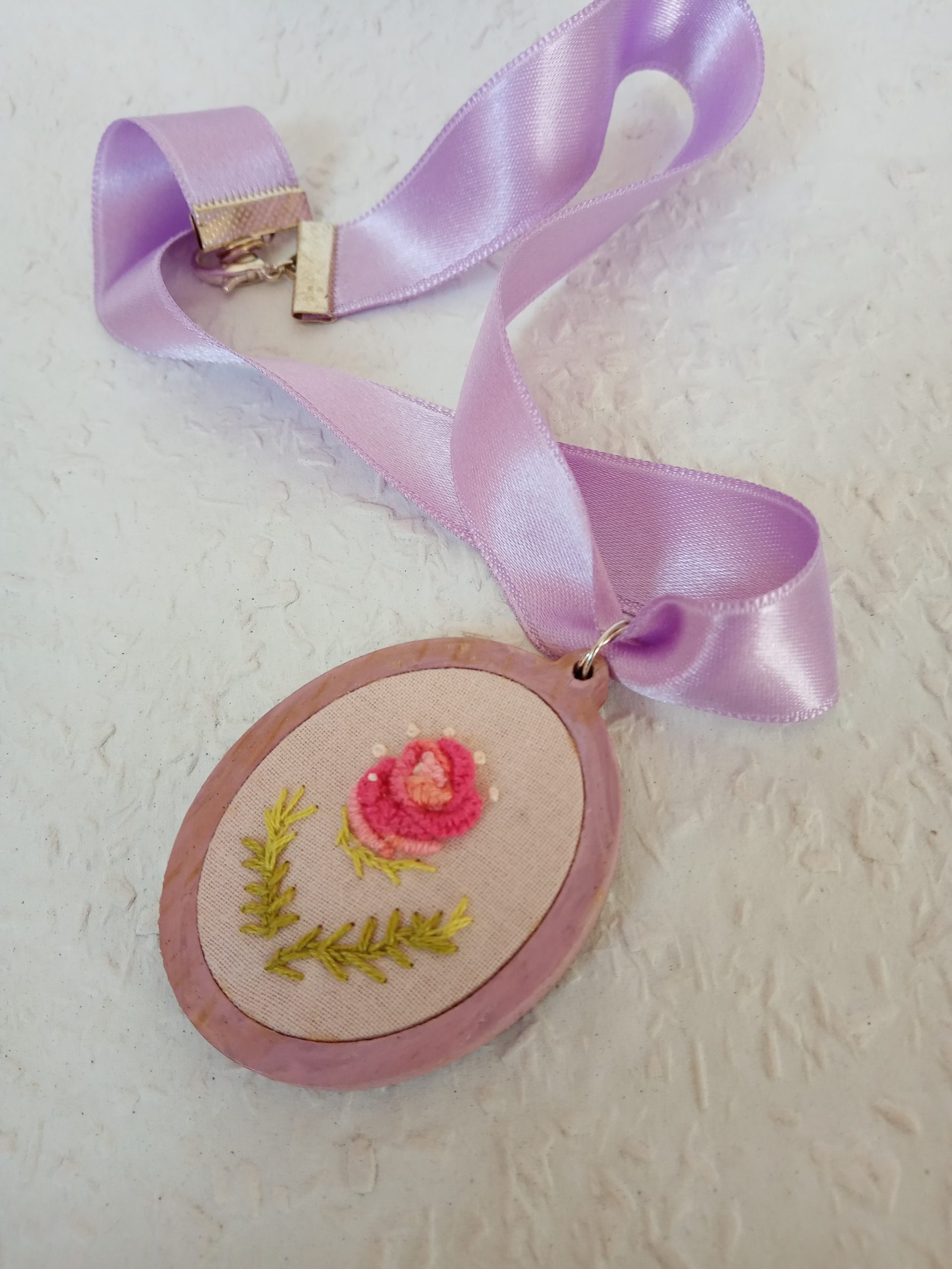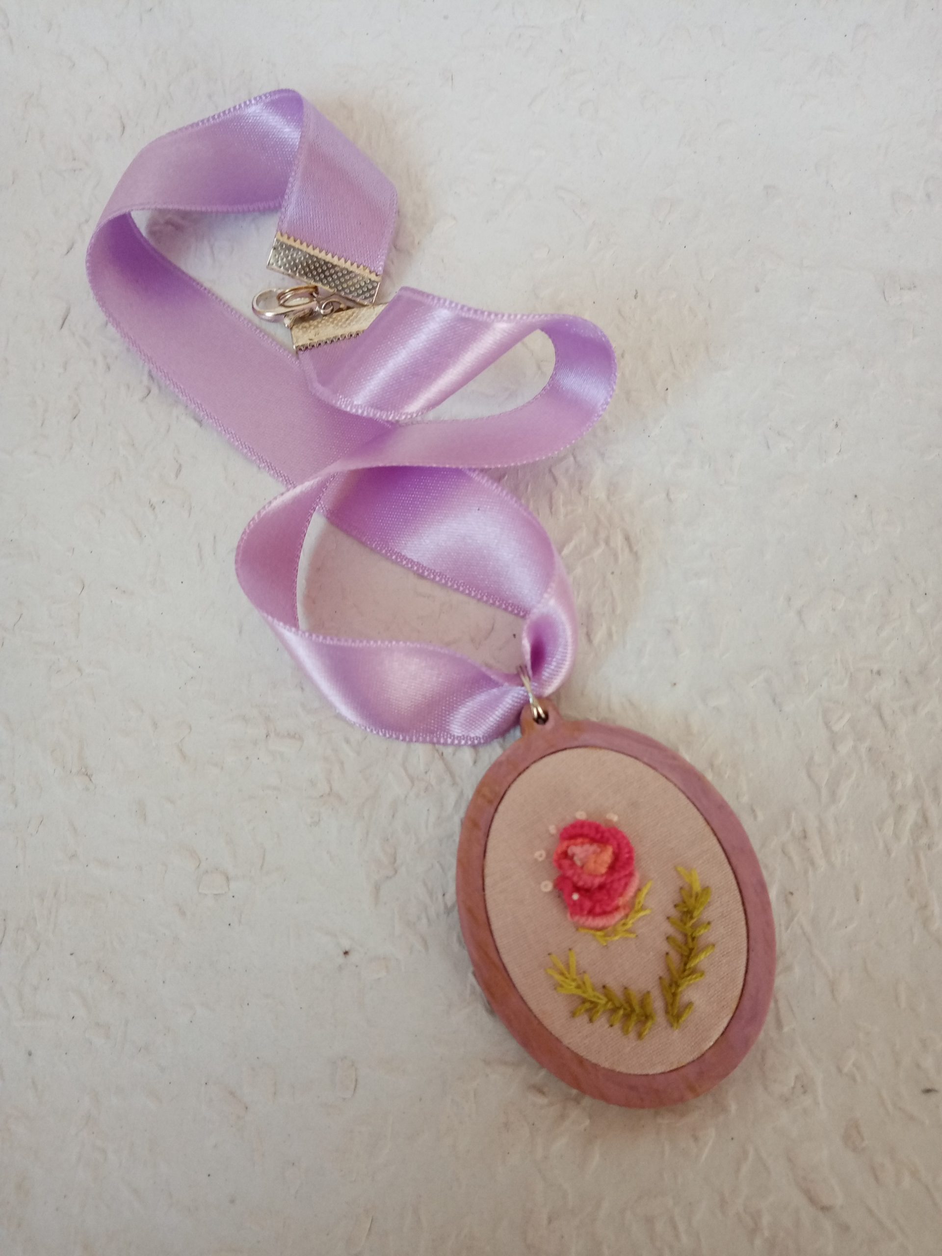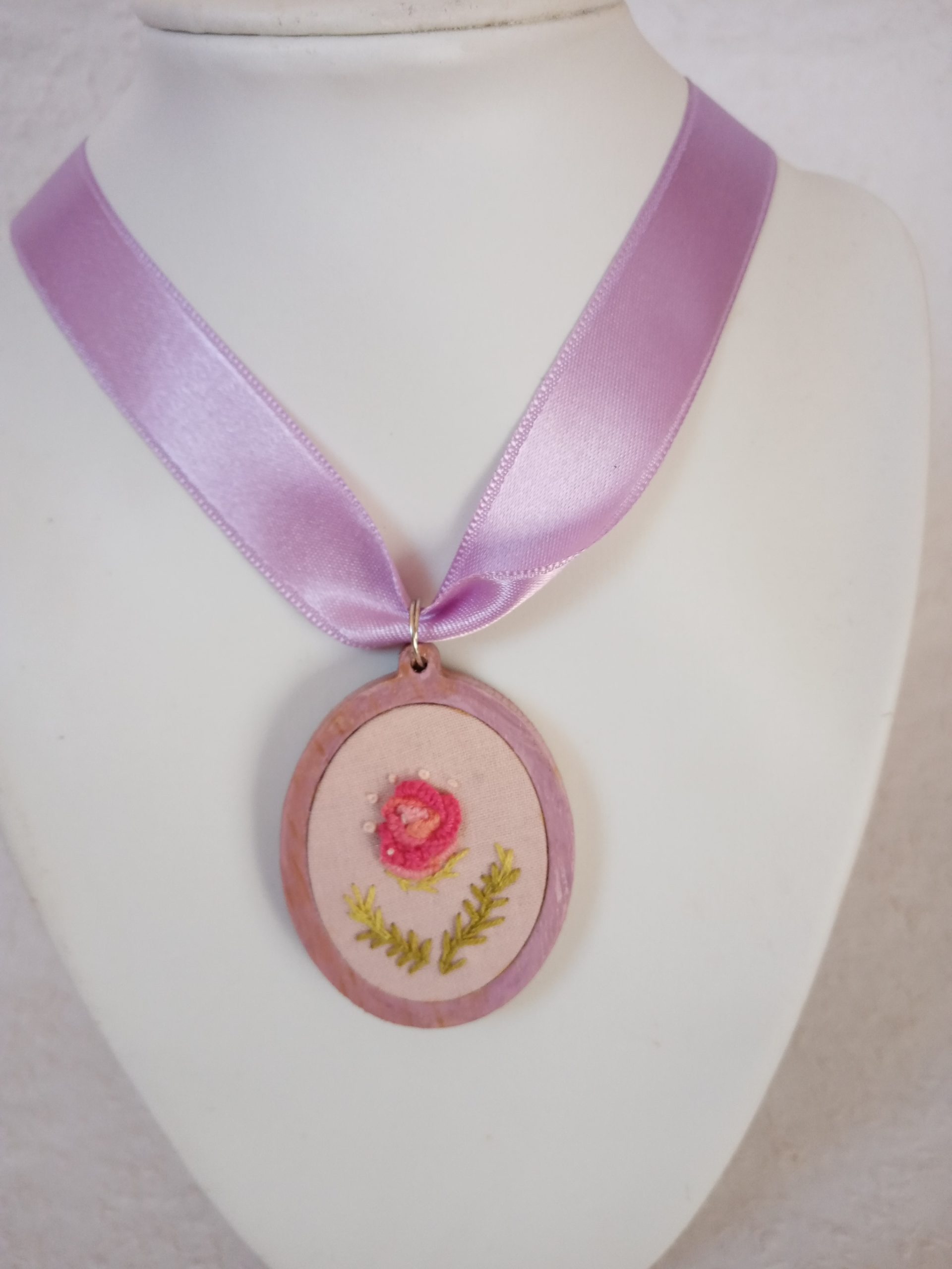 A stunning, eyecatchingoval embroidered necklace for your or a special someone. Roses surrounded by leaves. Embroidered using silk threads on a light pink-shade linen.