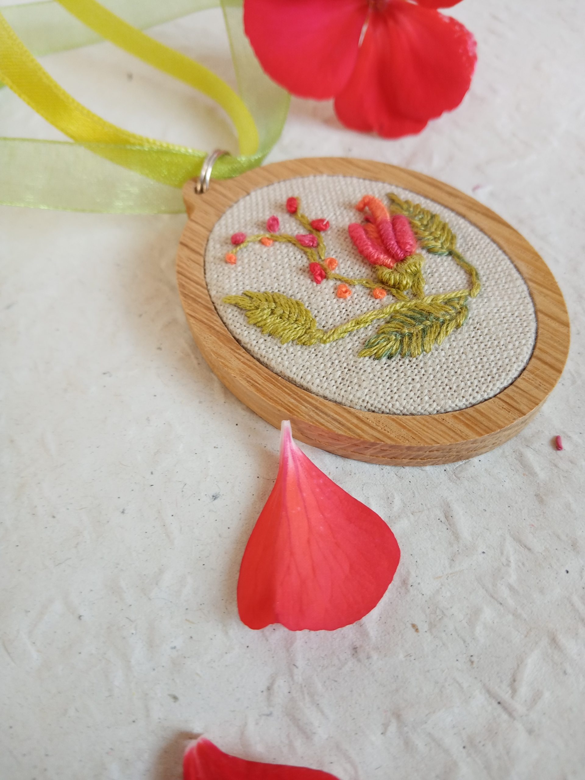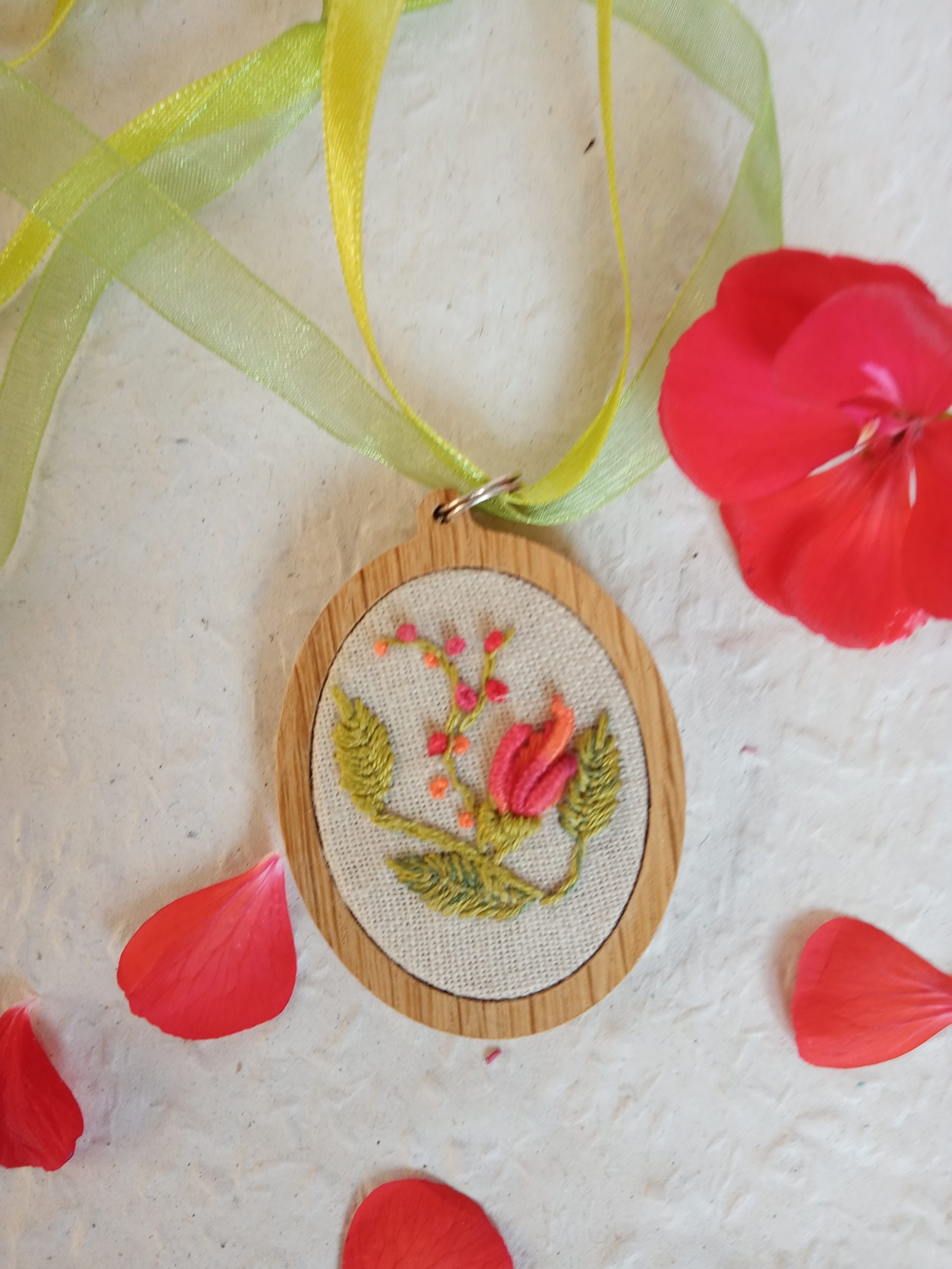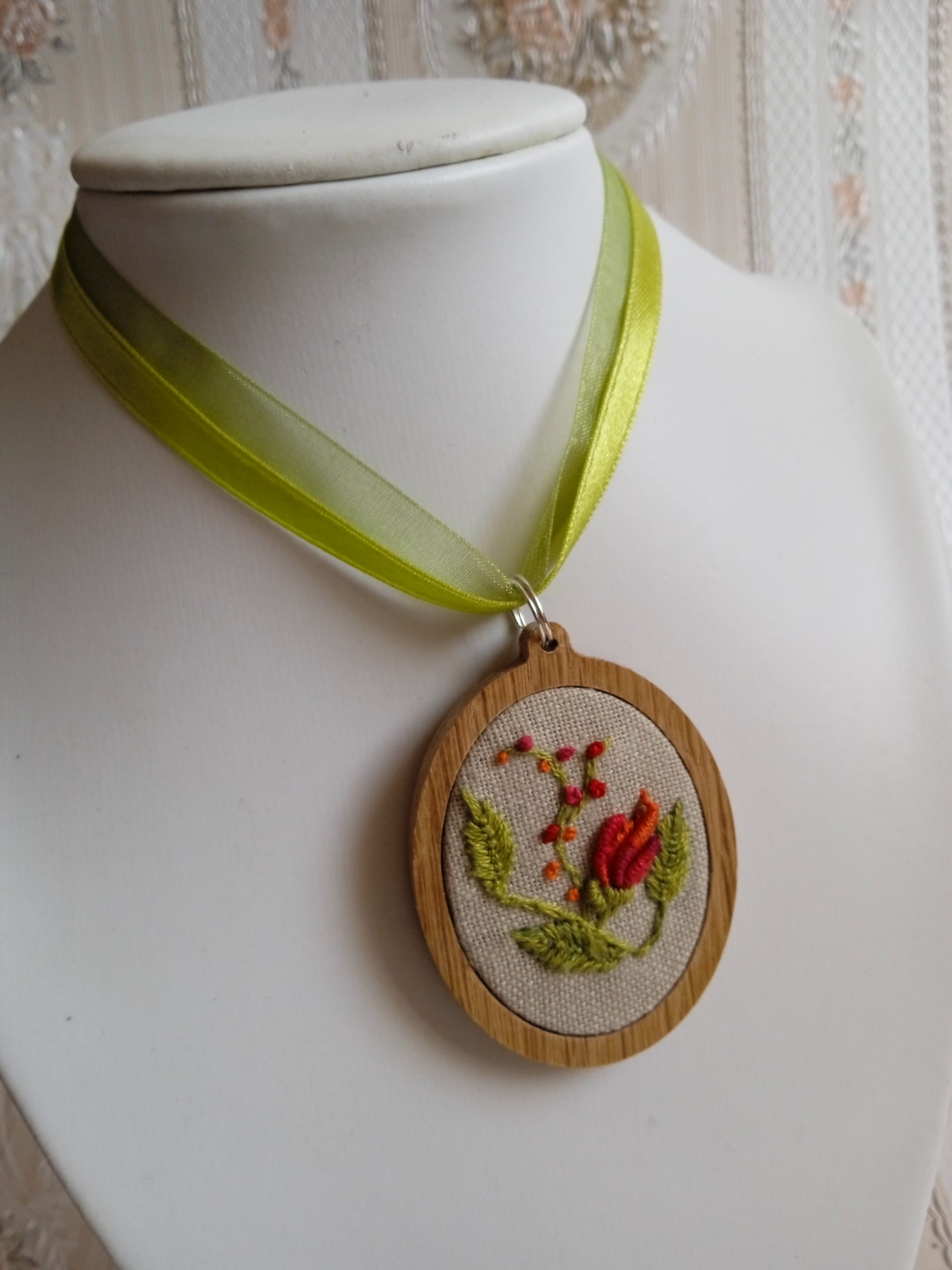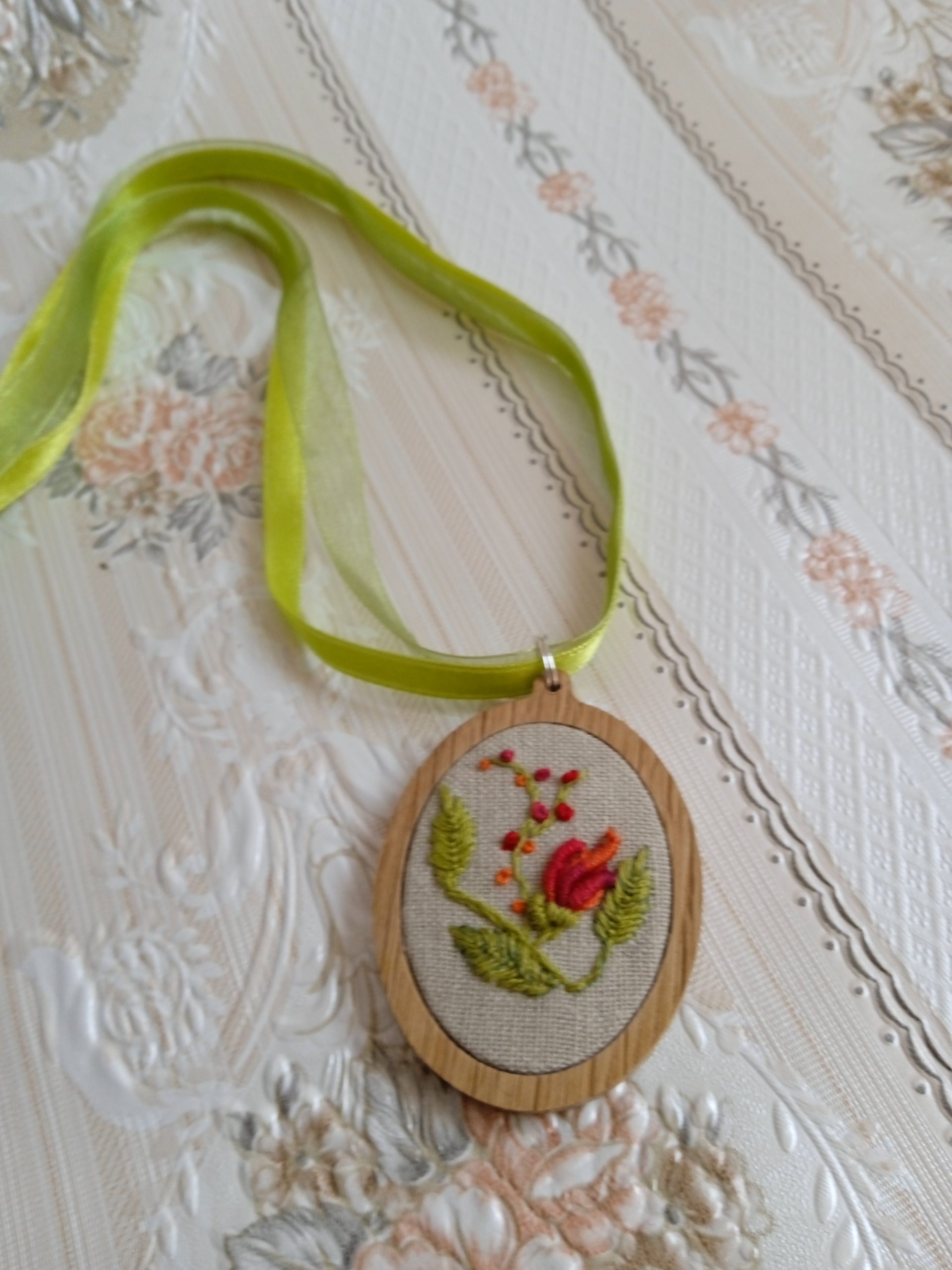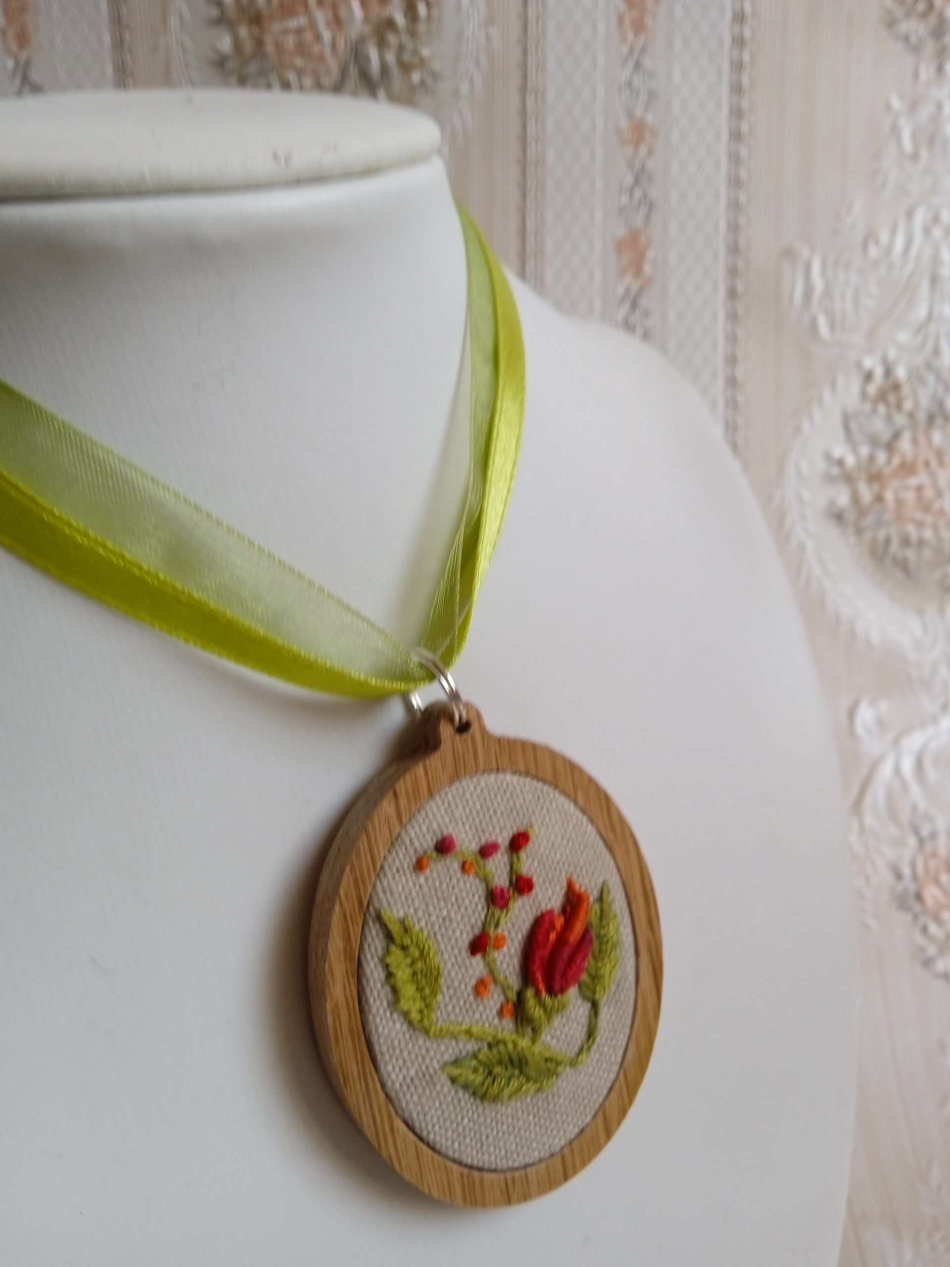 3d hatású piros virágot ábrázoló hímzett nyakláncomat látod lenszöveten ovális fakeretben. Halványzöld selyemszalaggal ellátva. Ez a nyaklánc annak szól, aki most legszívesebben egy virágos kertben lenne és egy rózsa illatát szippantaná magába.
