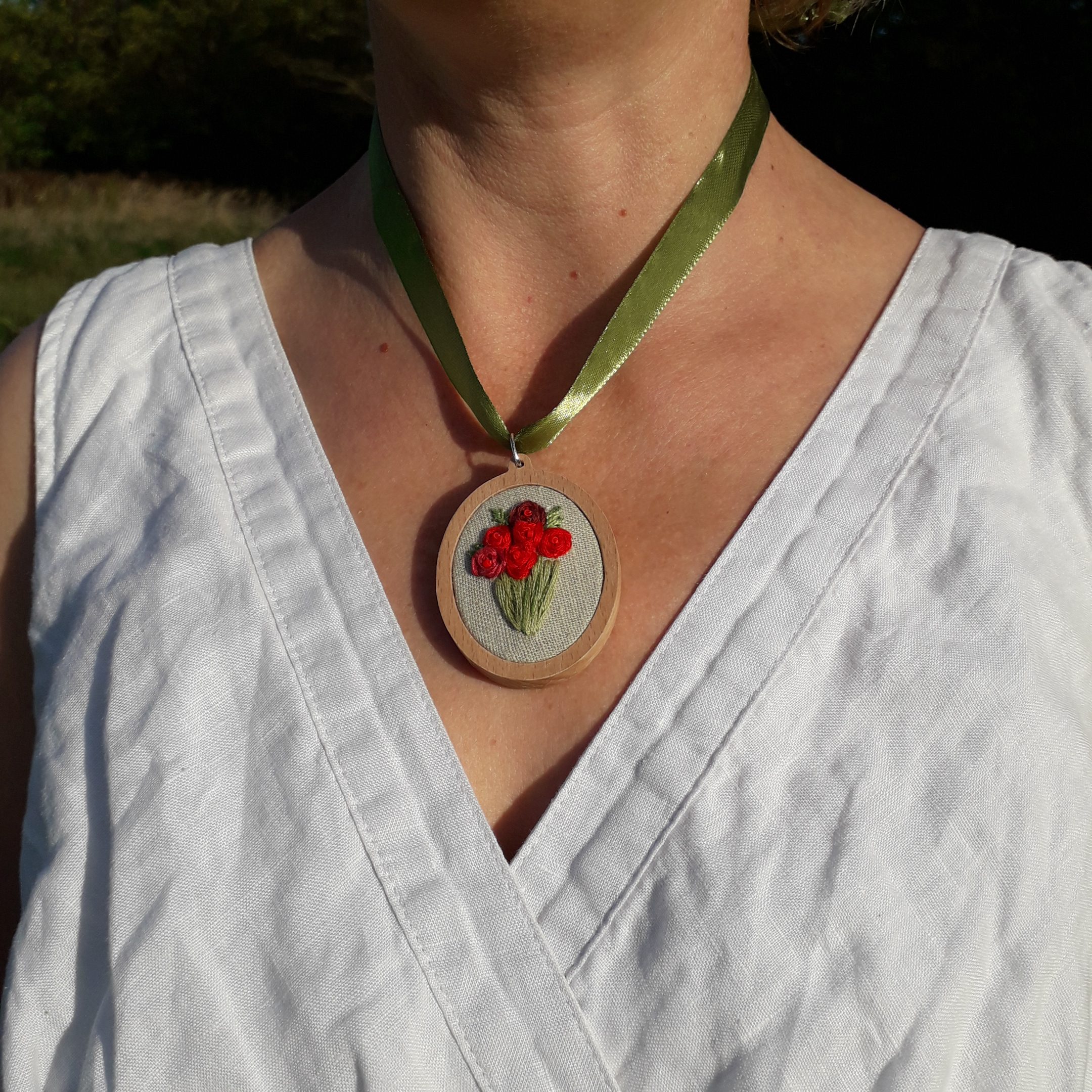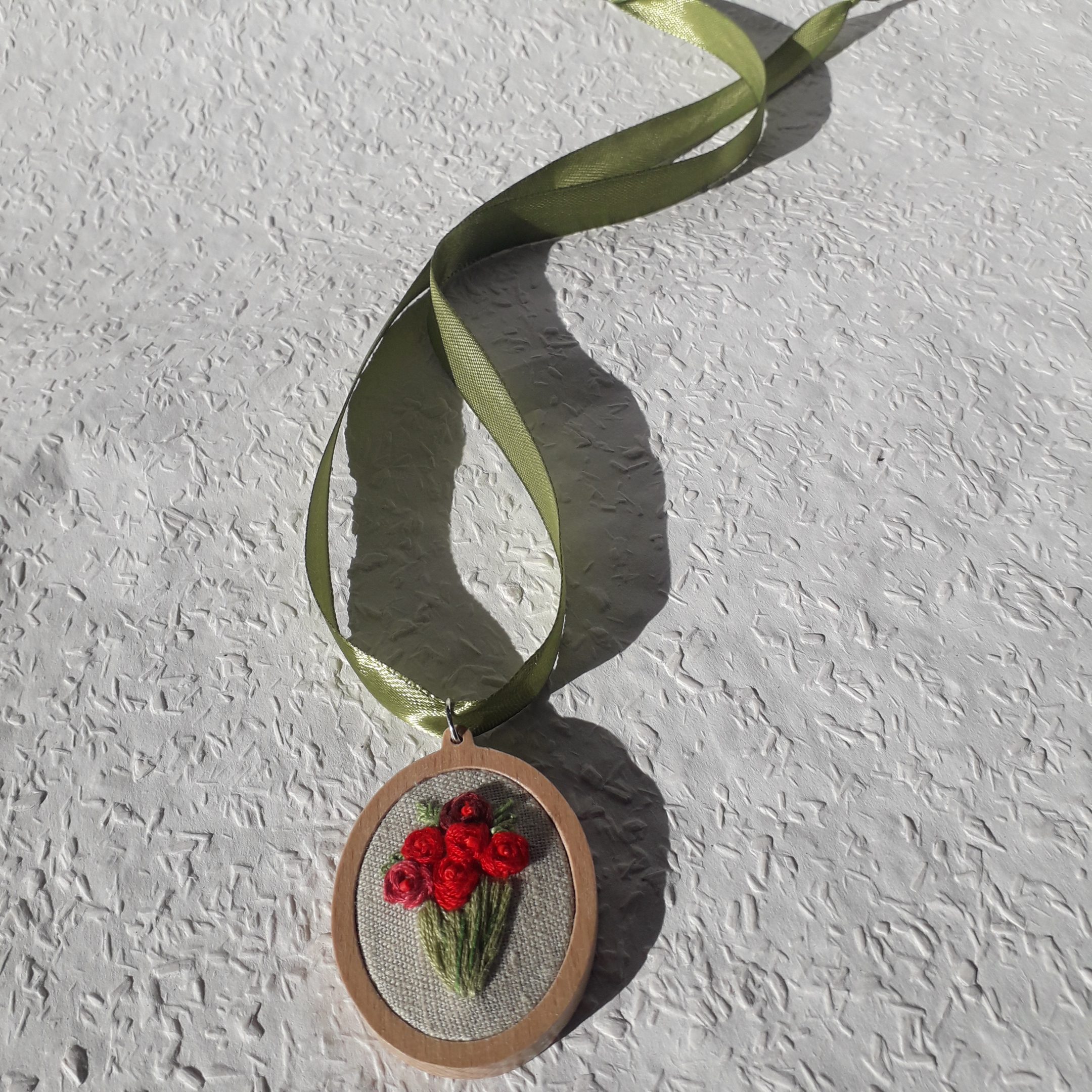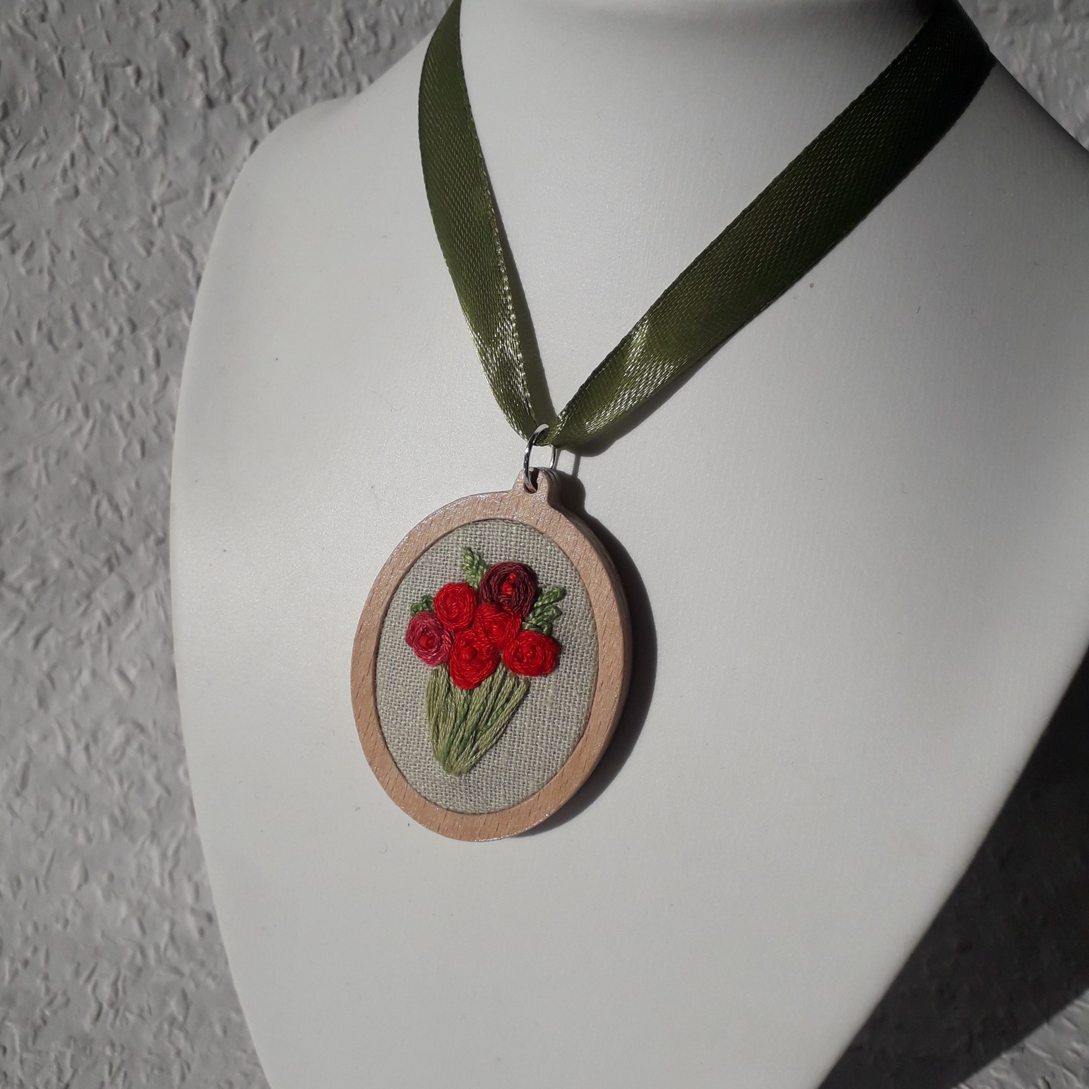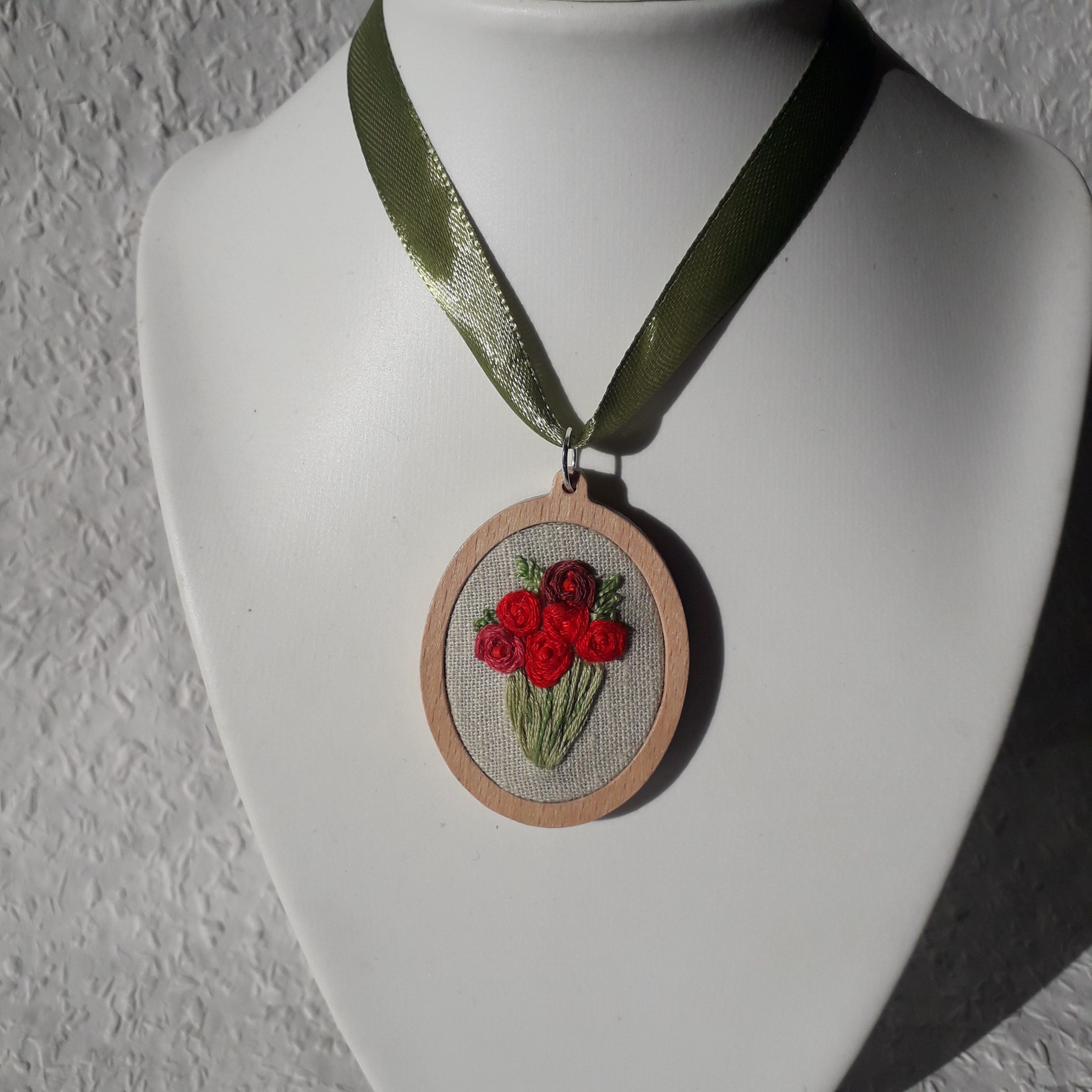 3d hatású Rózsacsokor virágot ábrázoló hímzett nyakláncomat látod lenszöveten ovális fakeretben. Halványzöld selyemszalaggal ellátva. Ez a nyaklánc annak szól, aki most legszívesebben egy virágos kertben lenne és egy rózsa illatát szippantaná magába.