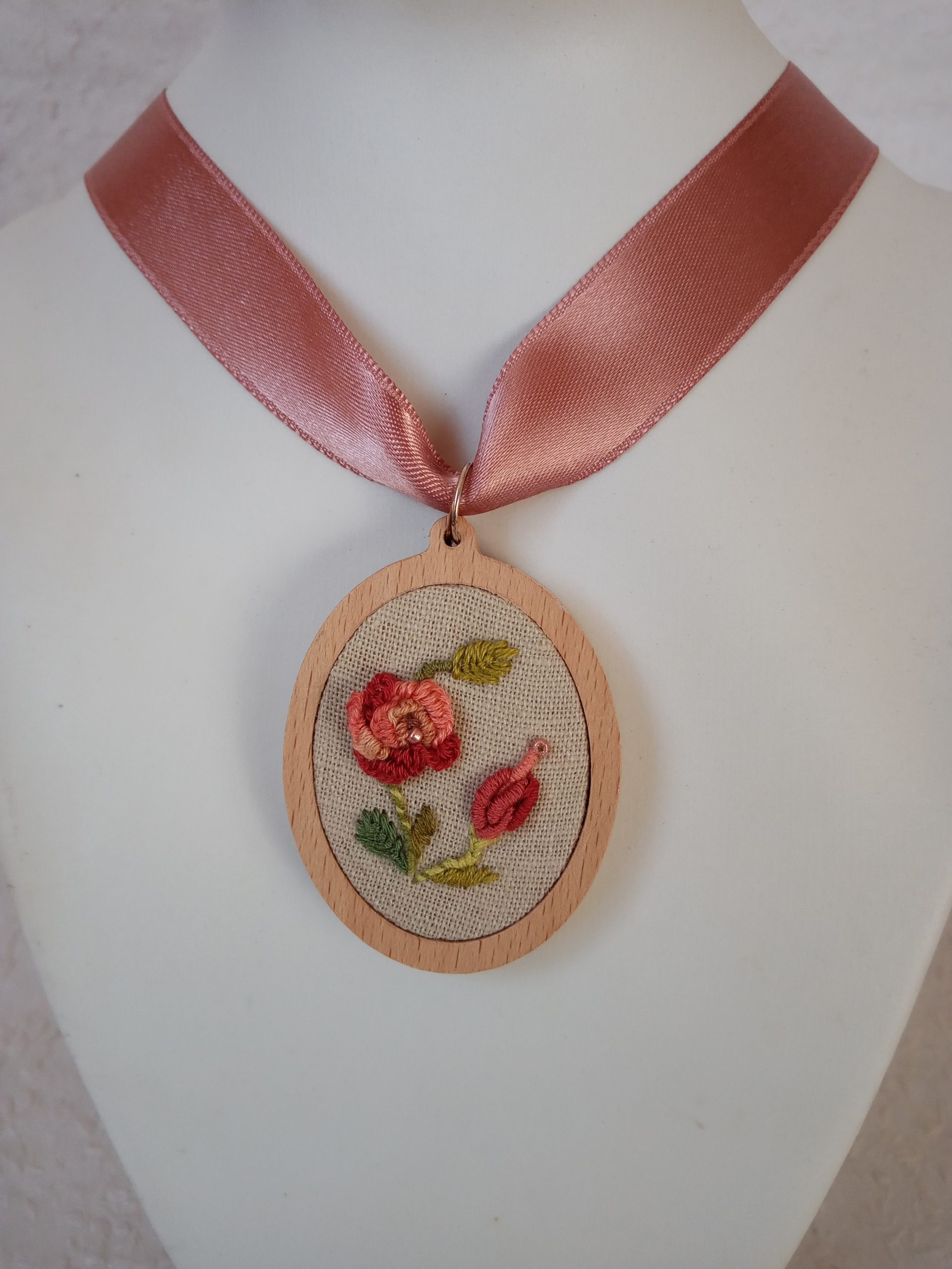 3d hatású Rózsa virágot ábrázoló hímzett nyakláncomat látod lenszöveten ovális fakeretben. Halvány rózsaszín selyemszalaggal ellátva. Ez a nyaklánc annak szól, aki most legszívesebben egy virágos kertben lenne és egy rózsa illatát szippantaná magába. Mérete: