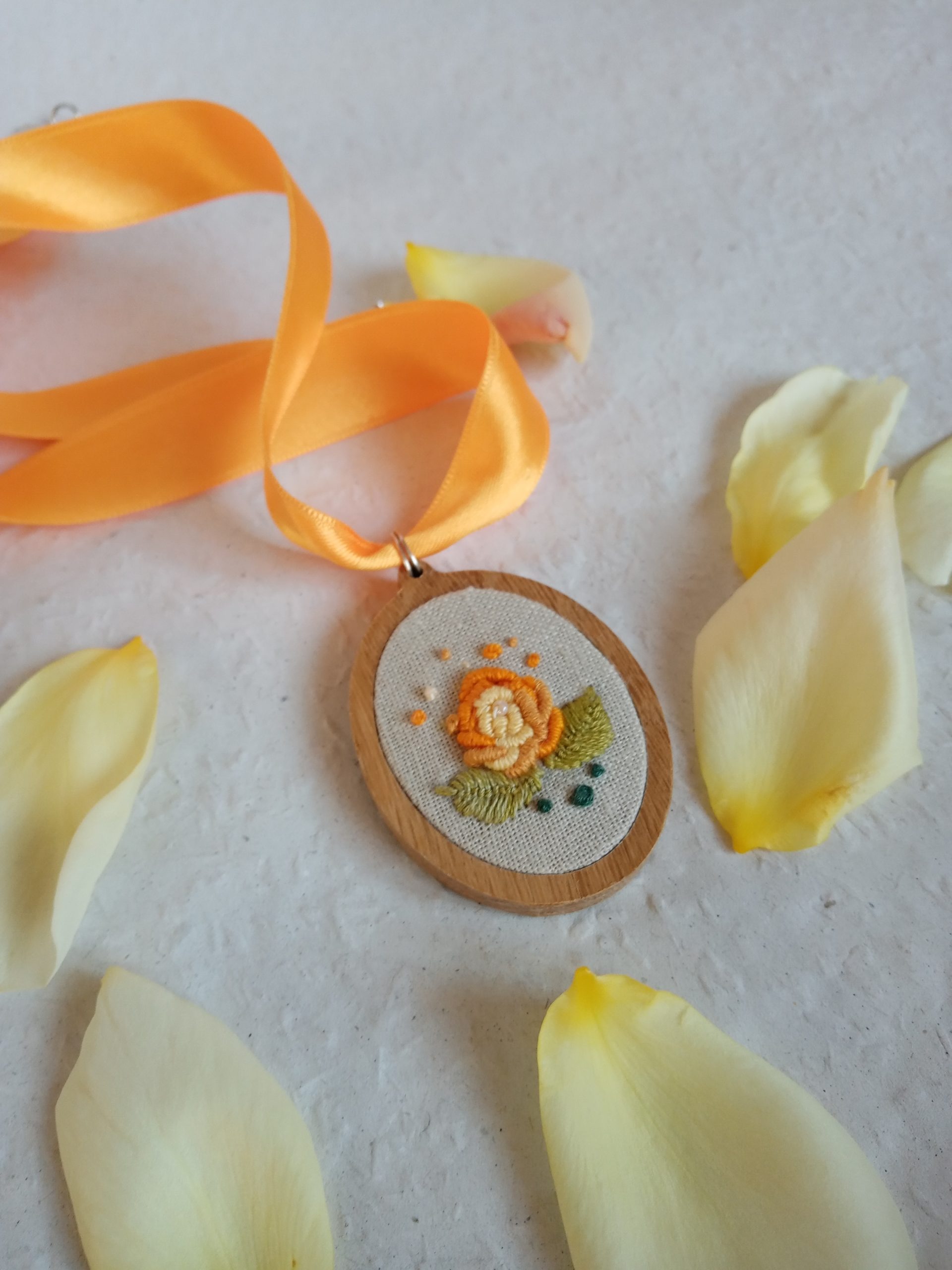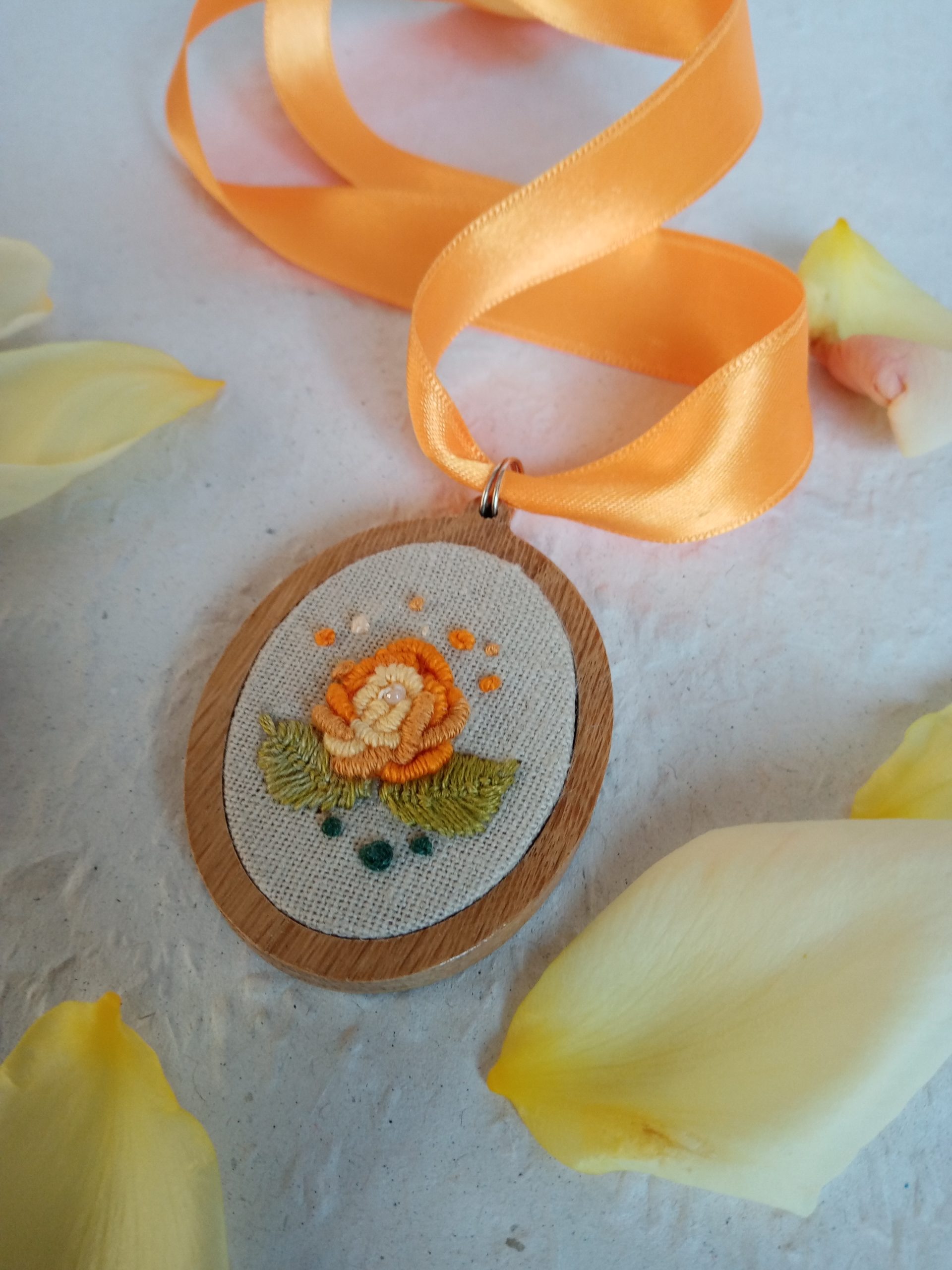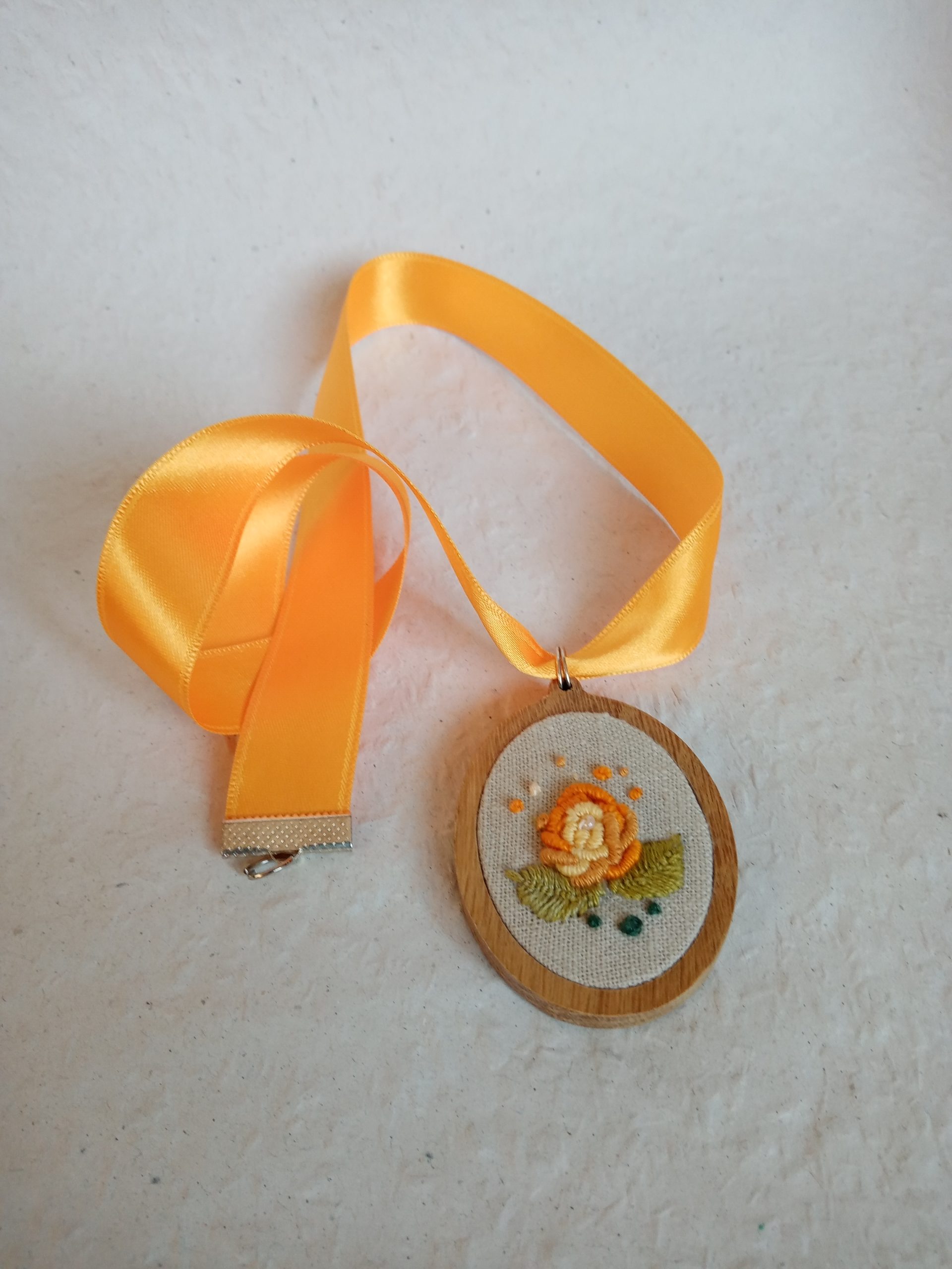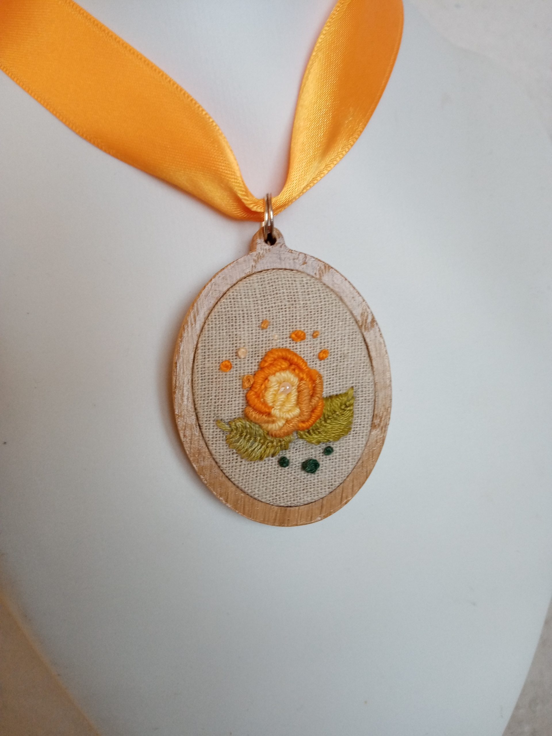 Hímzett sárga rózsás nyaklánc lenszöveten ovális alakú fakeretben. Narancssárga kapcsos zsinórral ellátva.