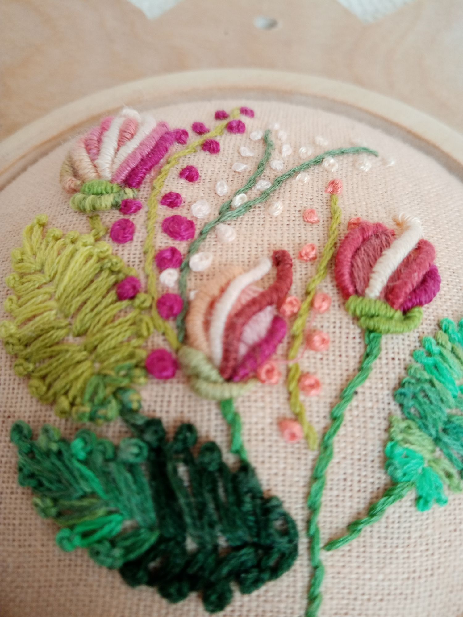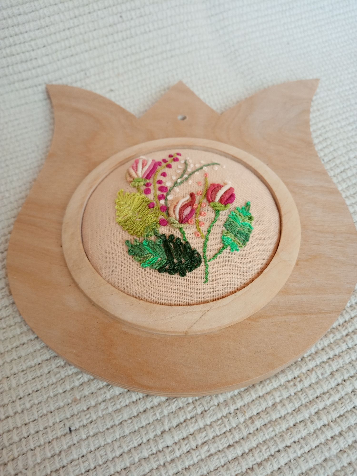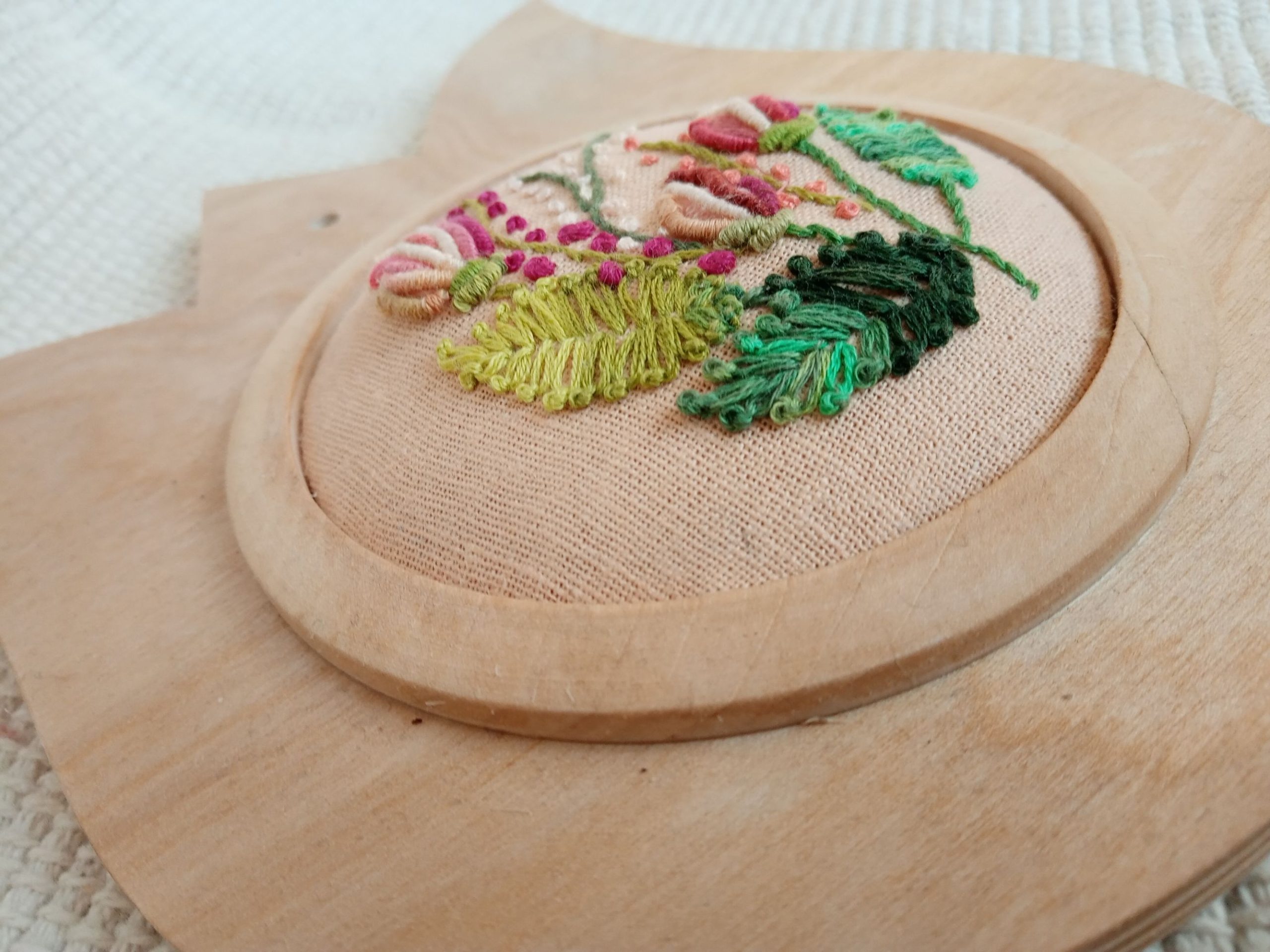 A fakeretet faesztergályossal készíttettem, melyben egy domború falencsén helyezkedik el a 3D hímzéssel készült virágos anyag.