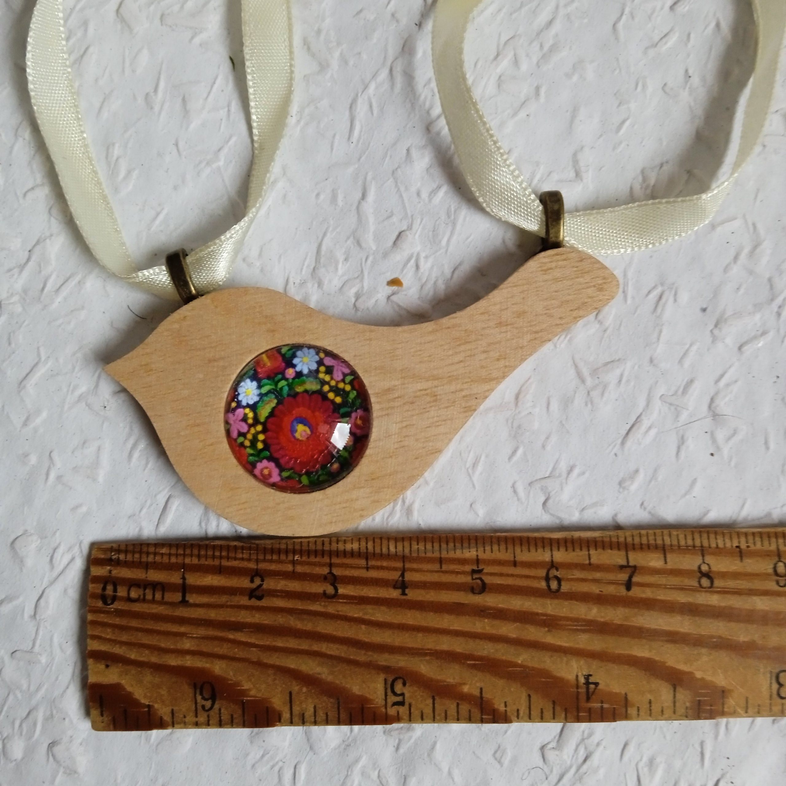 Madárkás faalapra készült kalocsai mintás nyaklánc, melyet zöld selyemszalag tart meg. Ez a nyaklánc sem fog Veled szembe jönni! Hátul kapoccsal megköthető.