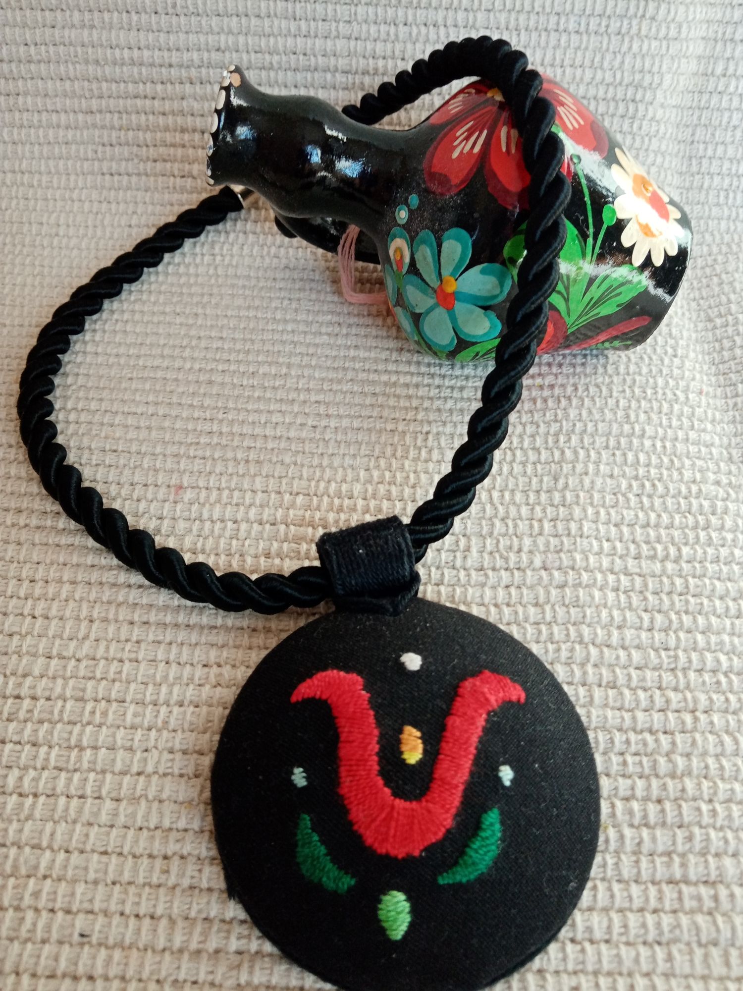 Hímzett kalocsai mintás nyaklánc fekete szövetalapon A nyakláncot domború faalap tartja meg. Hátul kapoccsal megköthető.
