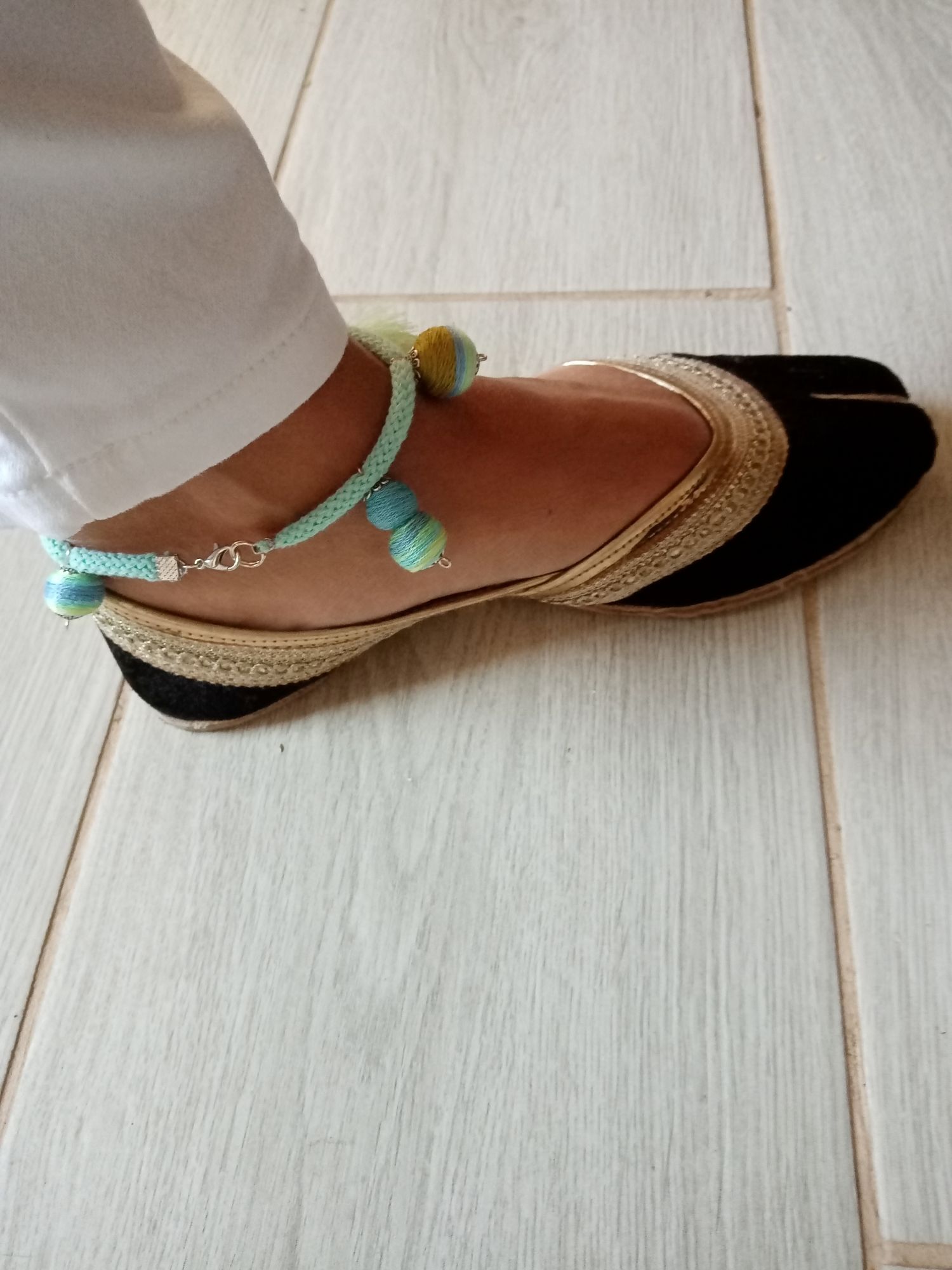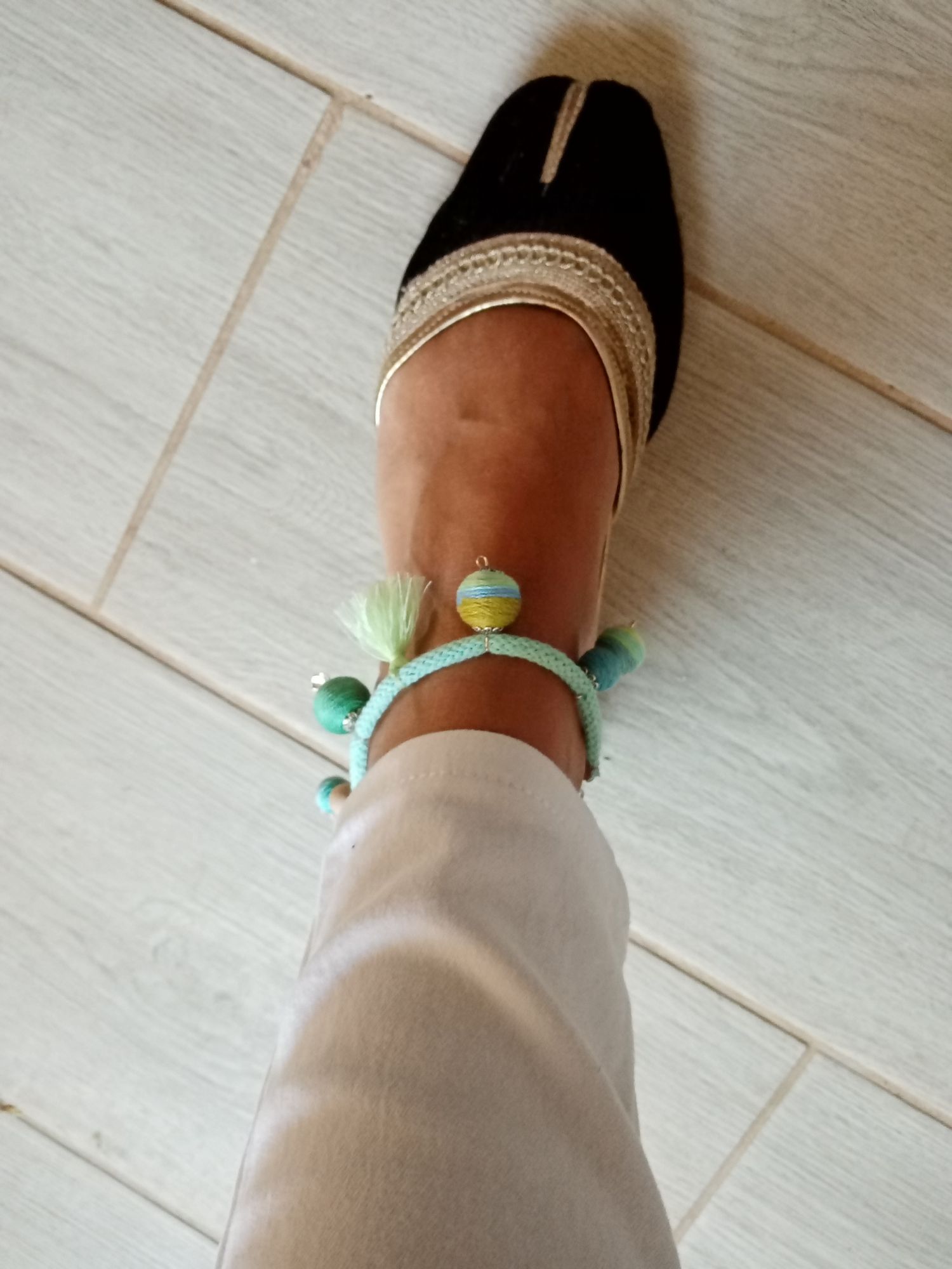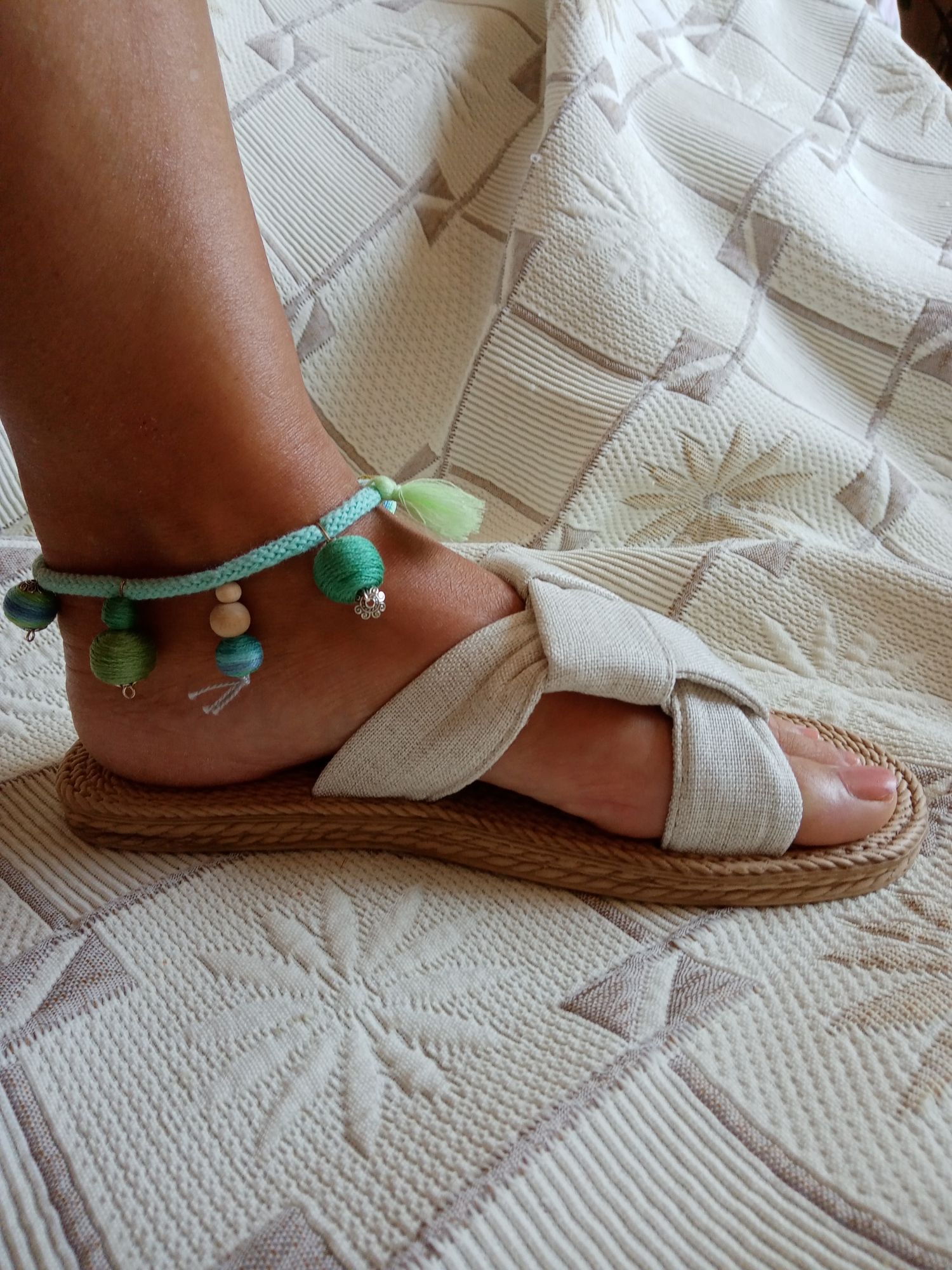 Nálam nincs nyár bokalánc kiegészítő nélkül. Gondoltam, Te is szívesen feldobnád a megjelenésedet ezzel a darabbal! Zöld-kék tarka színben játszó textilbogyó bokaékszer, remek nyári viselet.