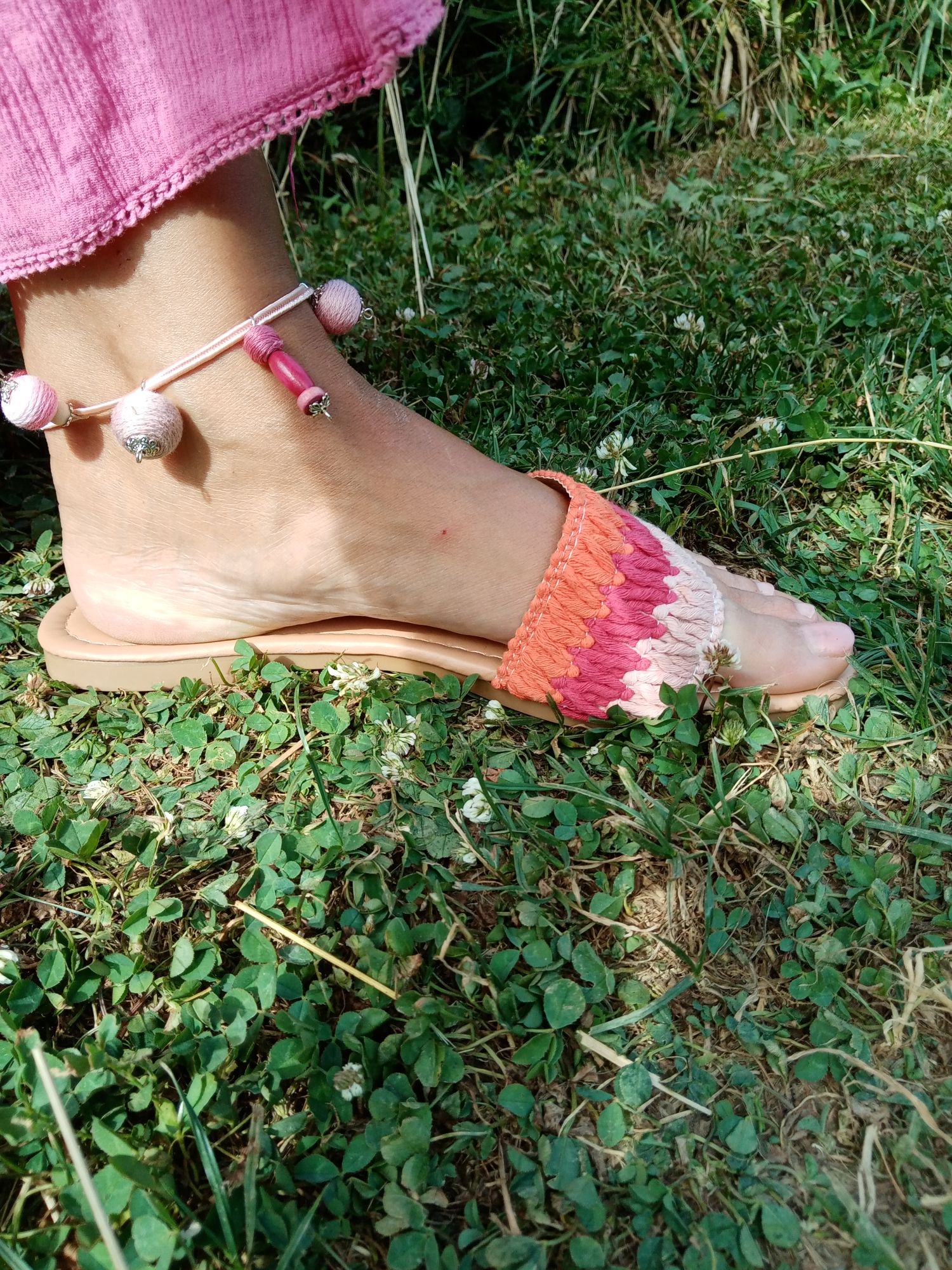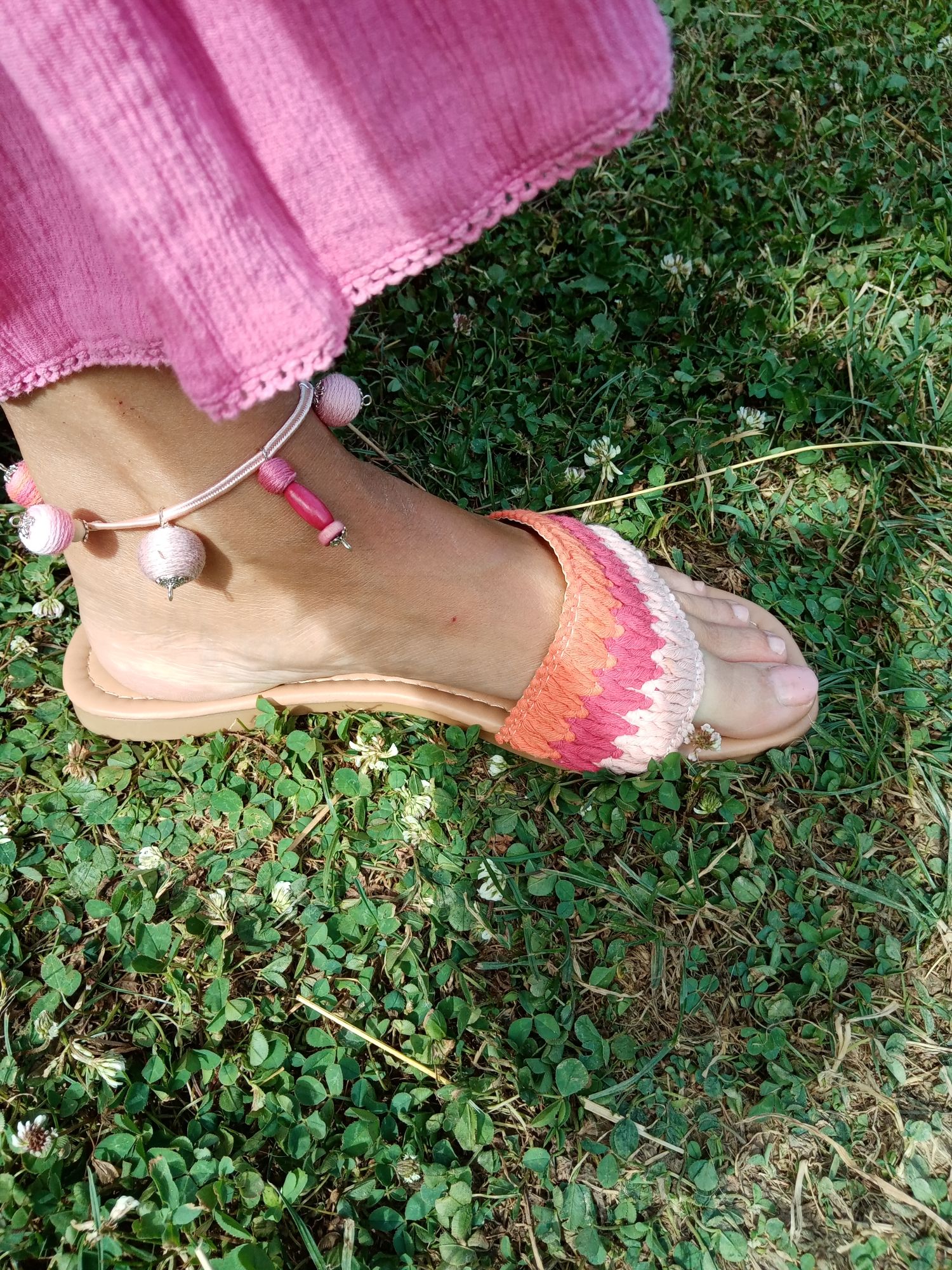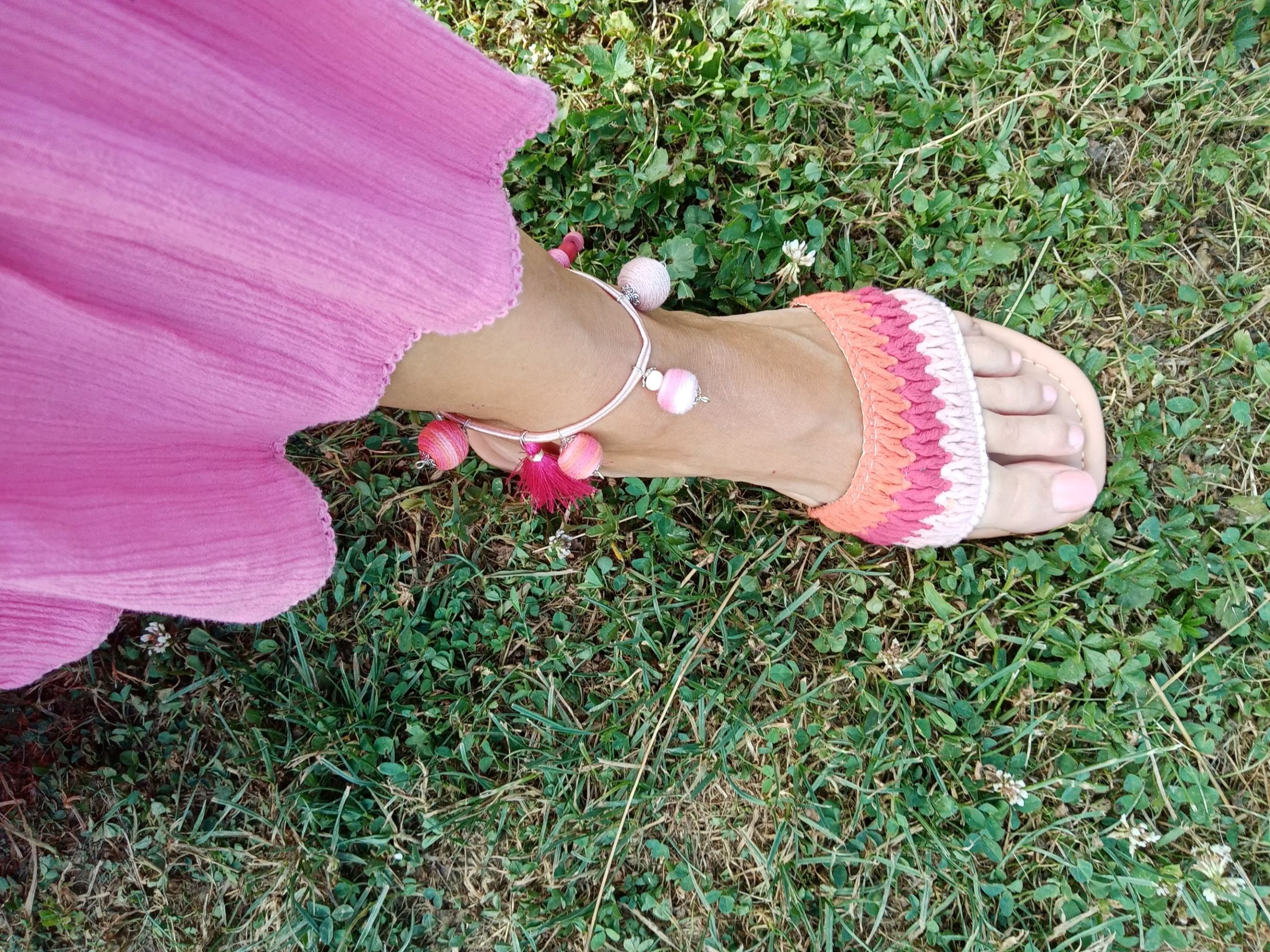 Rózsaszín-lila színben játszó textilbogyó bokaékszer, mely igazán megemeli a nyári hangulatot. Pompás nyári viselet. Lila sújtászsinórra vannak felfűzve a textilbogyók.