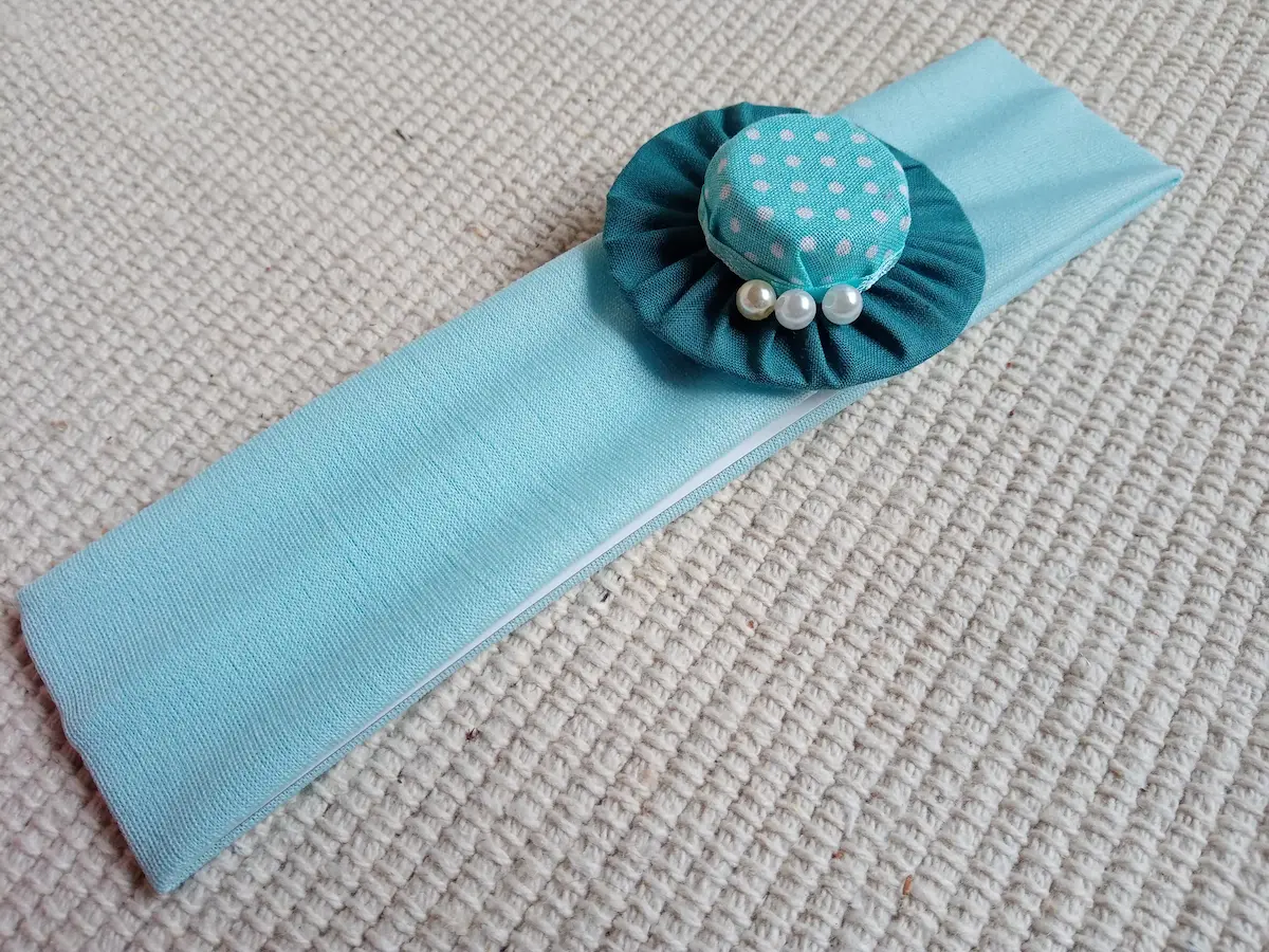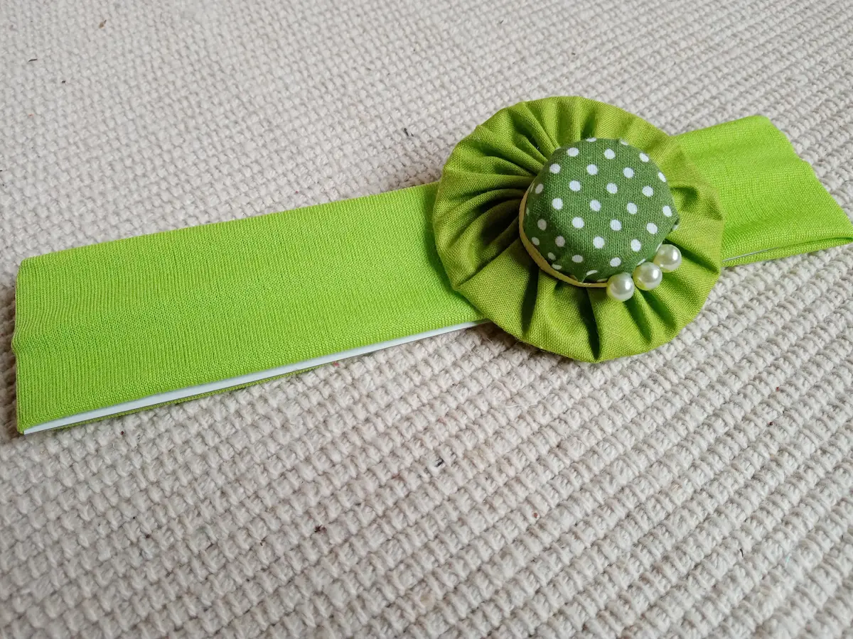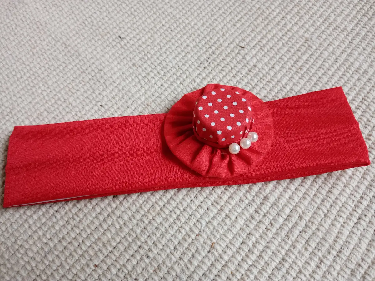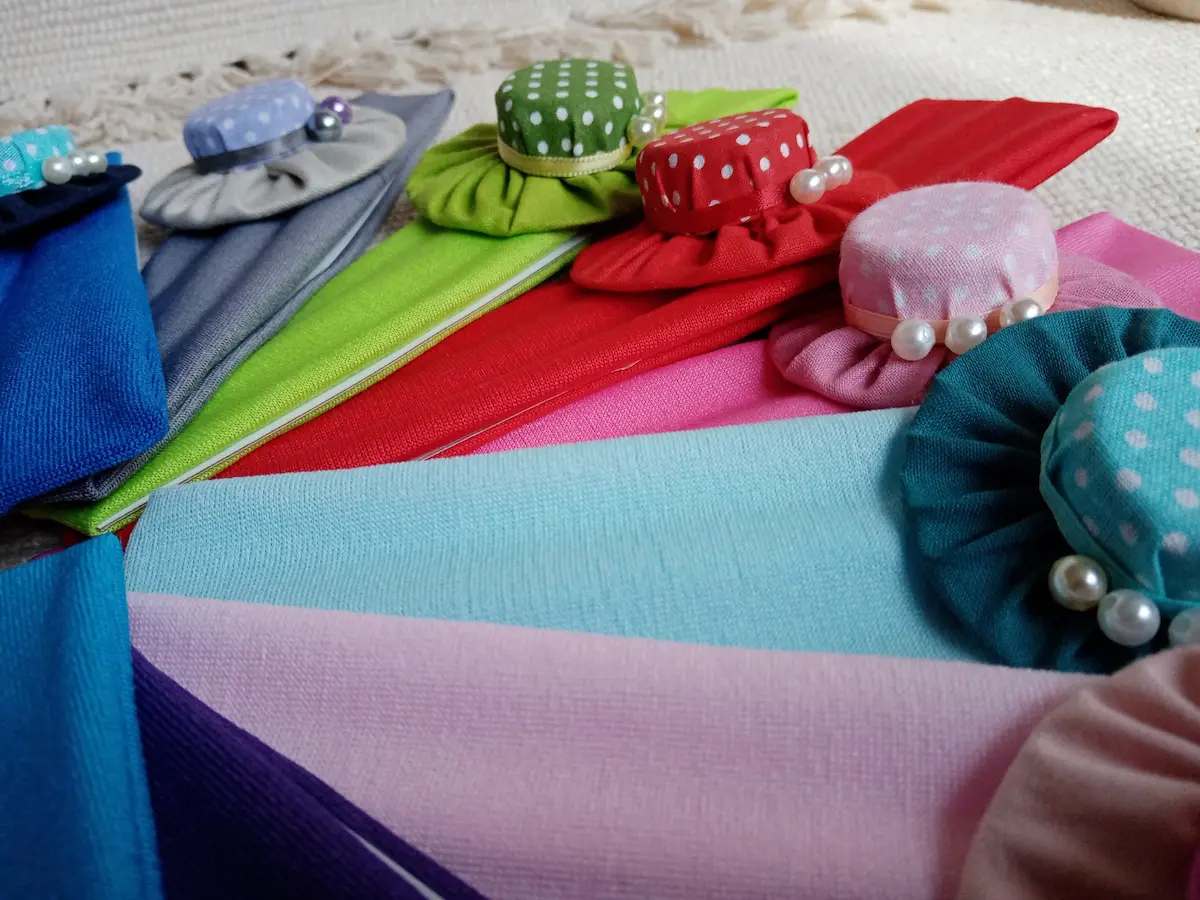 Textil gumis hajpántok színes választékát láthatod itt, melyeken pöttyös anyagból készült gyöngyökkel díszített női kalap található dekoratív elemként.