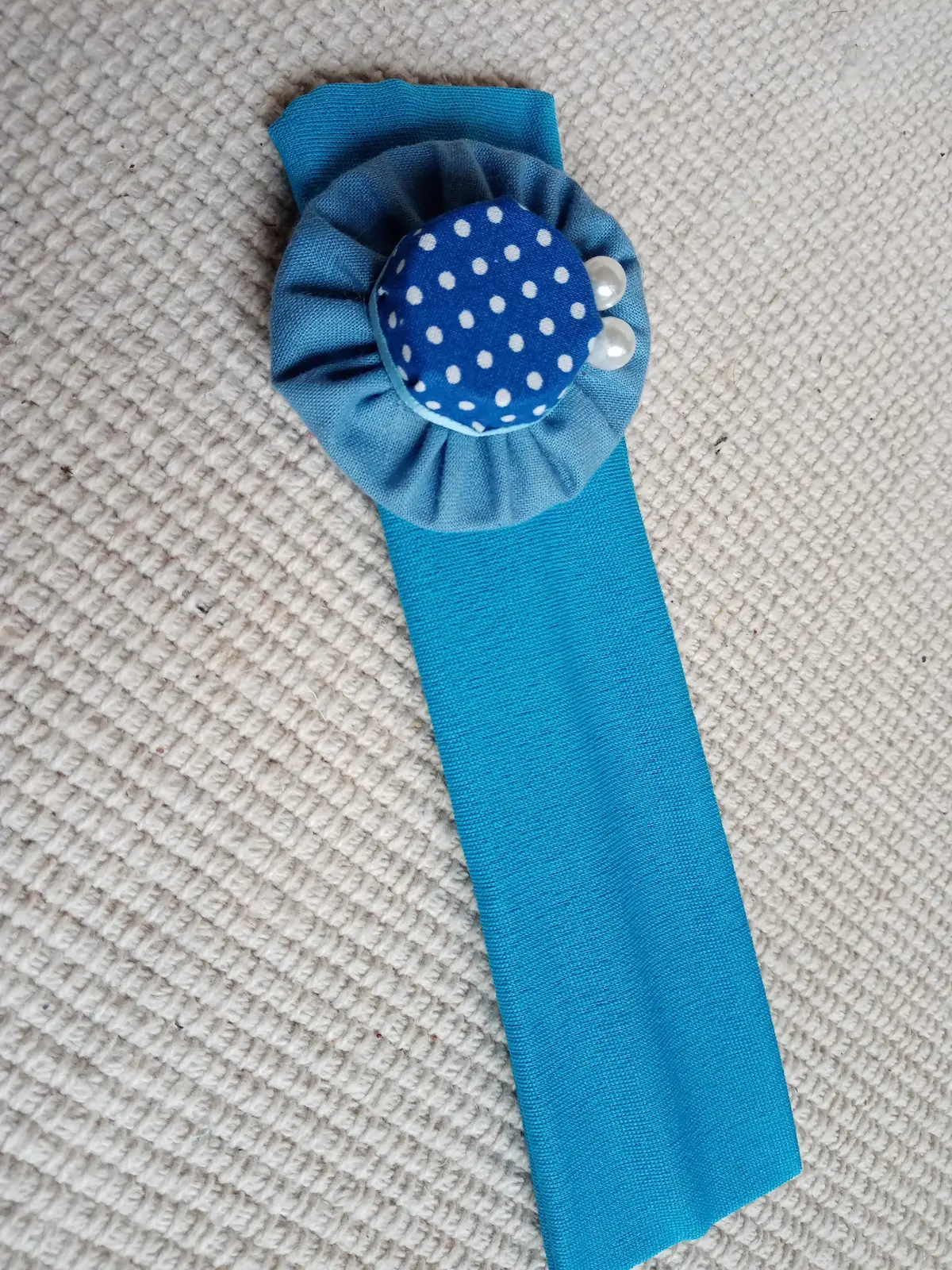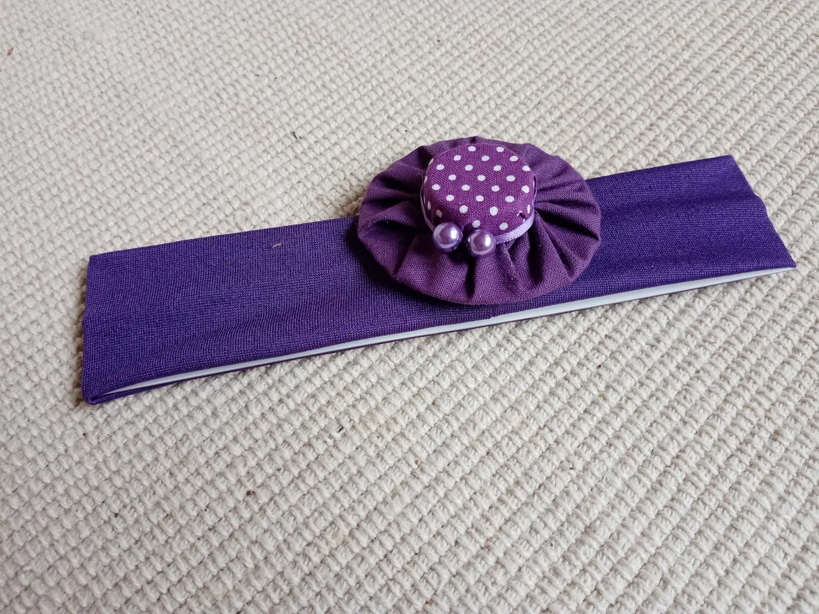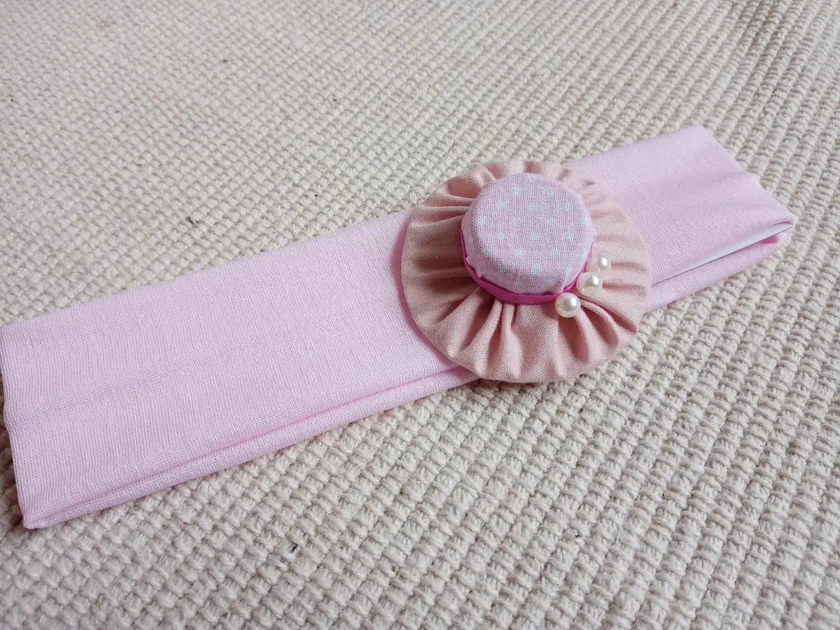 Textil gumis hajpántok színes választékát láthatod itt, melyeken pöttyös anyagból készült gyöngyökkel díszített női kalap található dekoratív elemként.