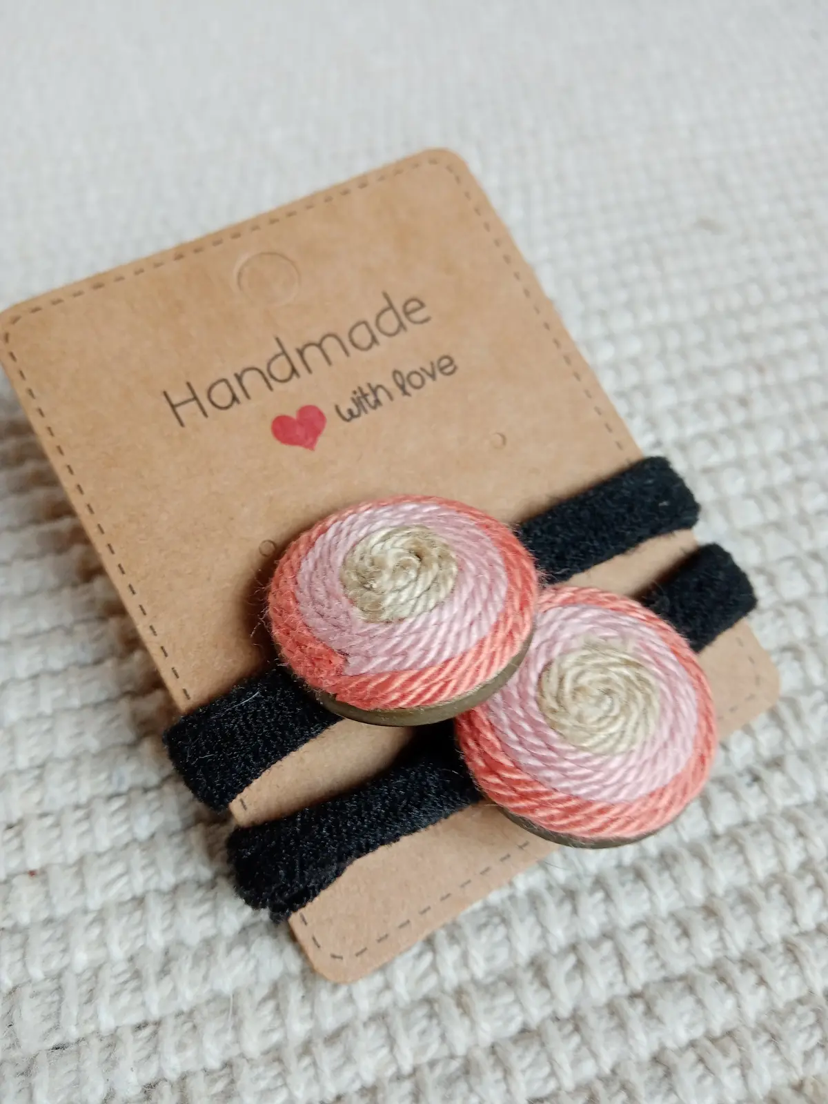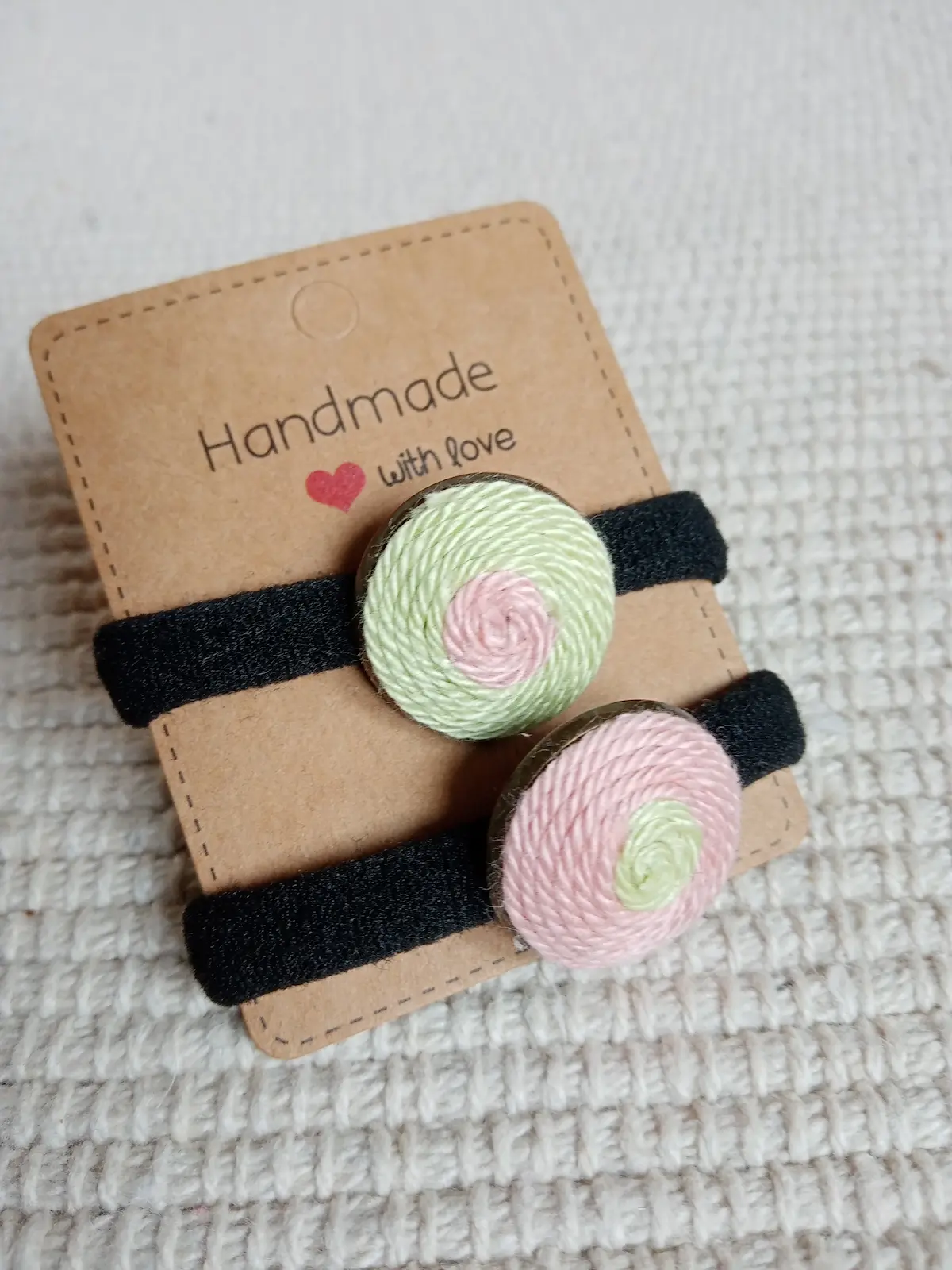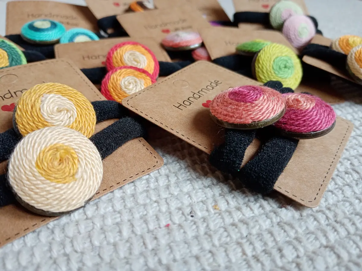 Fémalapban fonallal bevont falencse található, mely fekete hajgumival van összeerősítve.