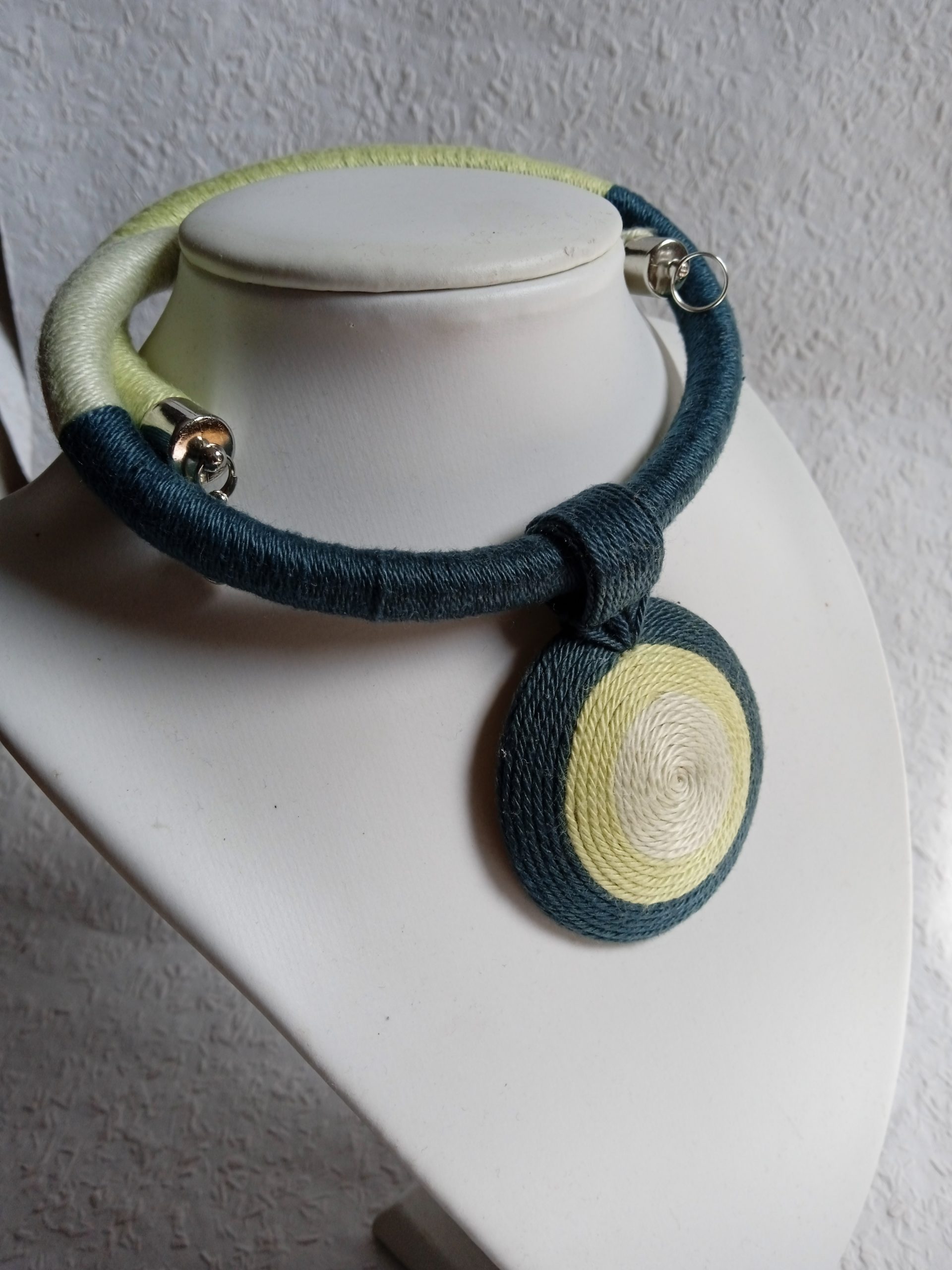 A moha árnyalataiban készült ez az egyedi fonal nyaklánc. Minőségi, természetközeli és trendi mind a hétköznapokra mind ünnepnapokra. A medál újrahasznosított falencsére és megmaradt fonalakból készült. Állítható nyaklánc