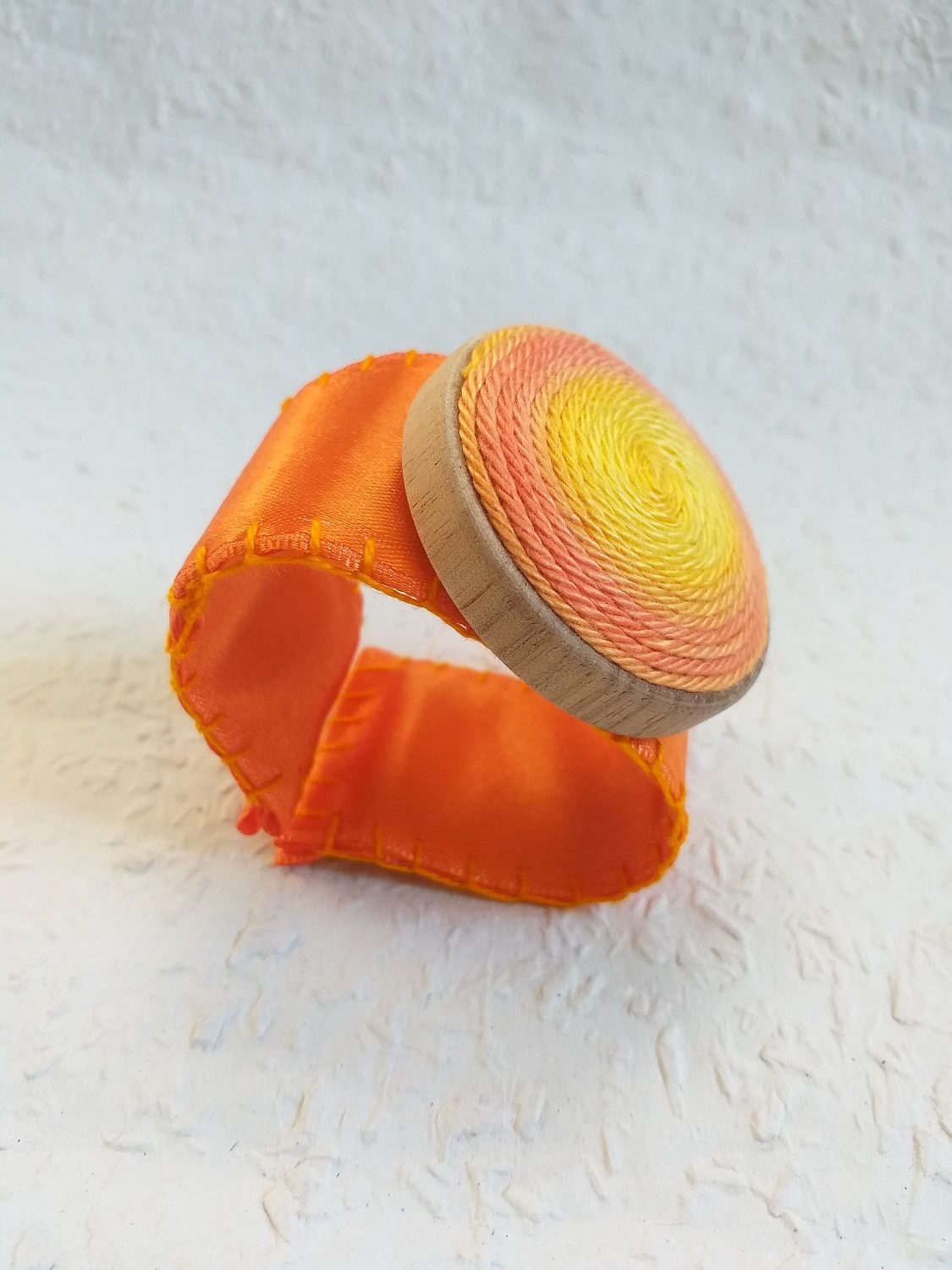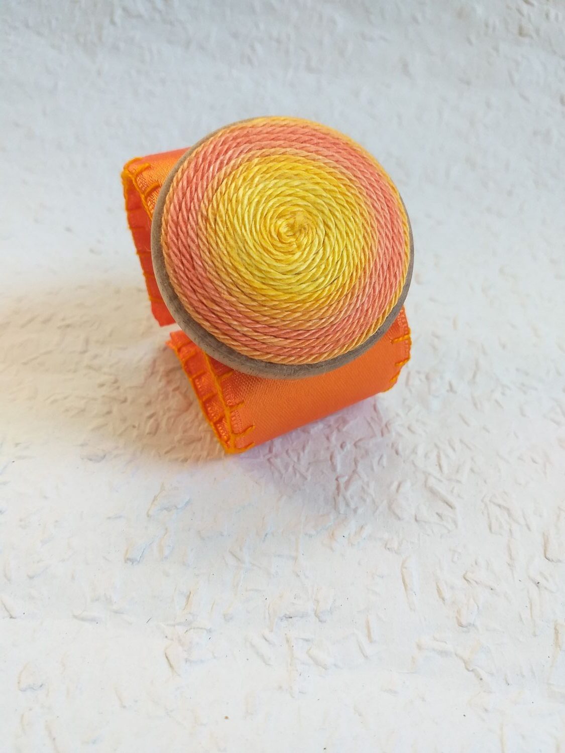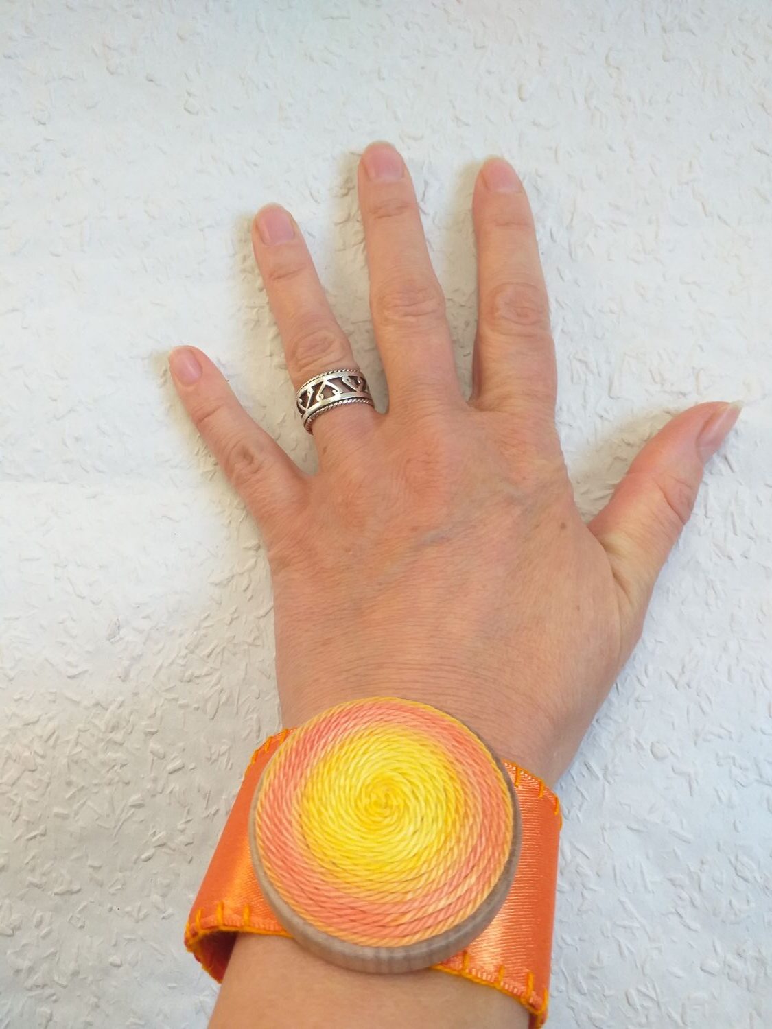 A mutatós kerek domború fonallal körbevett falencse faalapba került, melyet hozzávarrtam széles selyemszalaghoz. Hajlítható, állítható, hiszen a hajlíthatóságát sárgaréz lemez adja, ezt vontam be narancsszínű selyemszalaggal. Nagyon praktikus darab