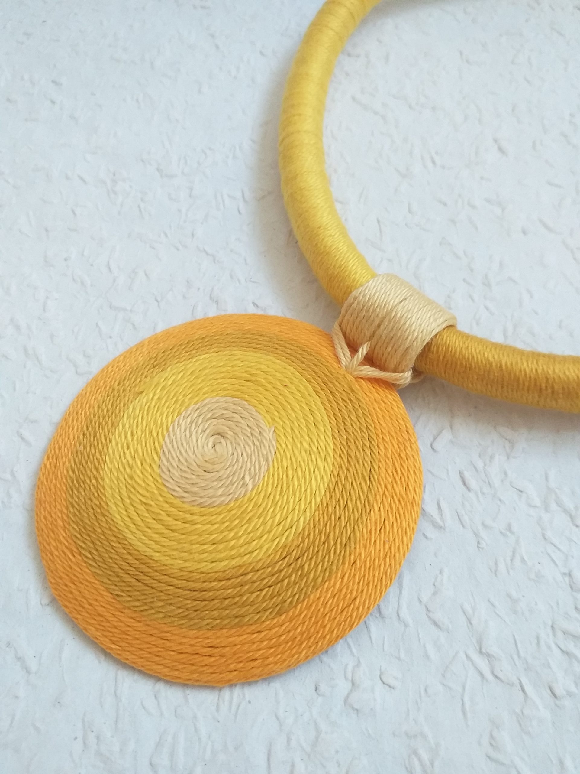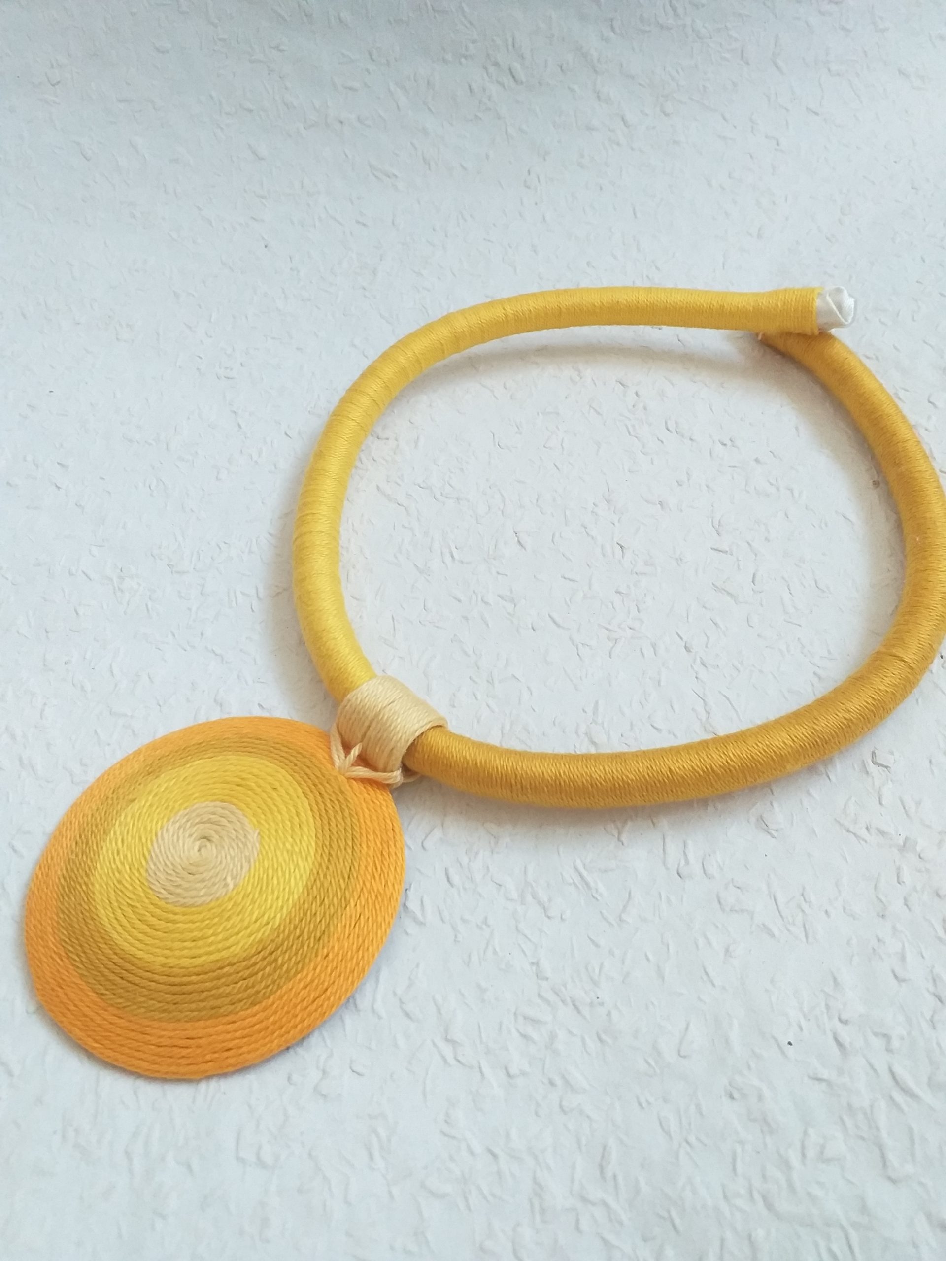 Citromsárga-narancssárga-aranyszínű OGEL nagyméretű fonalnyaklánc Ha szereted a különleges ékszereket, akkor az OGEL nyakláncokat különösen ajánlom a figyelmedbe. Kisebb méretben is van elérhető nyakláncom. A medált sárga fonallal körbevett hajlítható tartó tartja meg, a méretet te szabhatod meg szorosra vagy lazábbra állítással