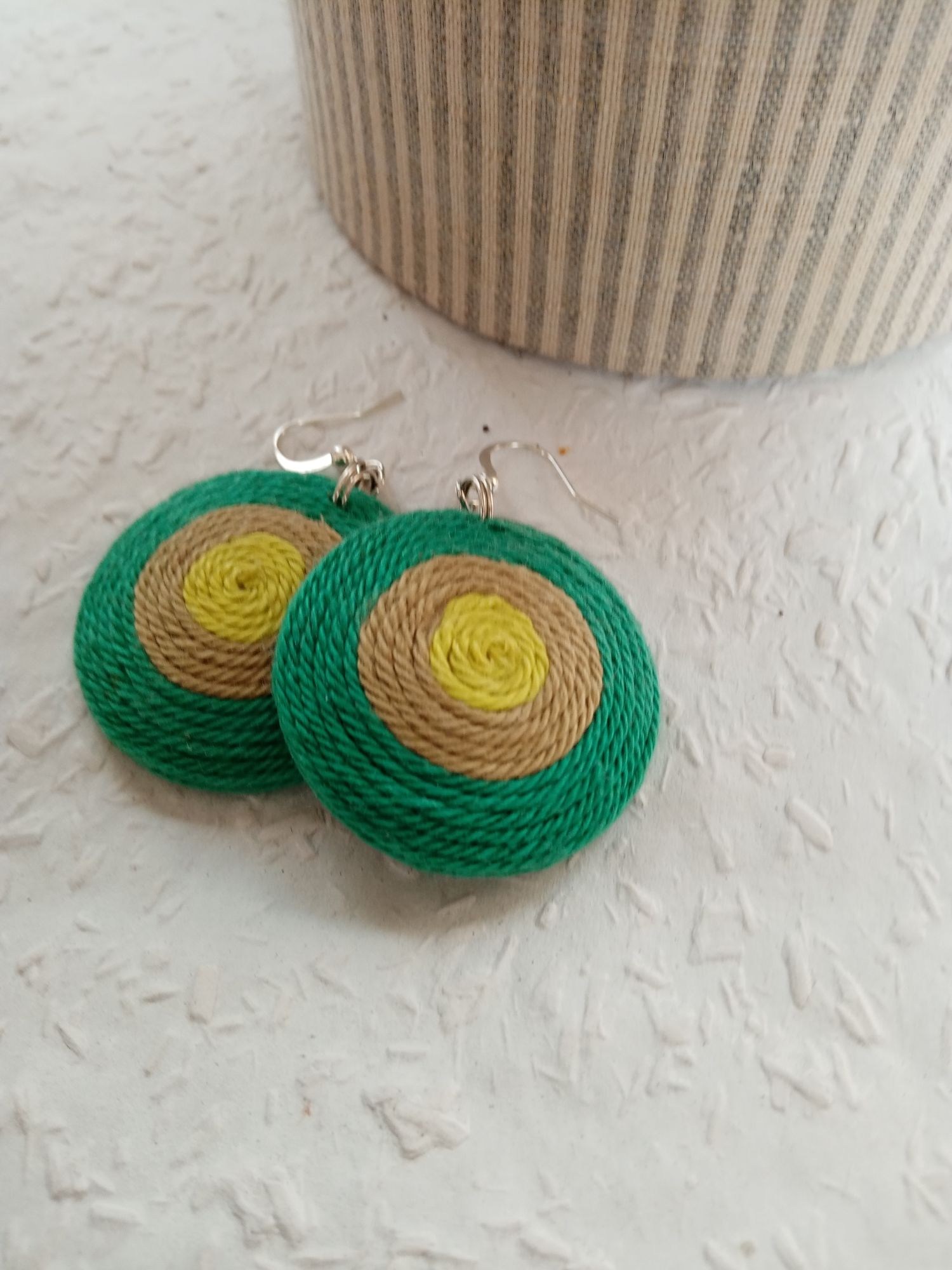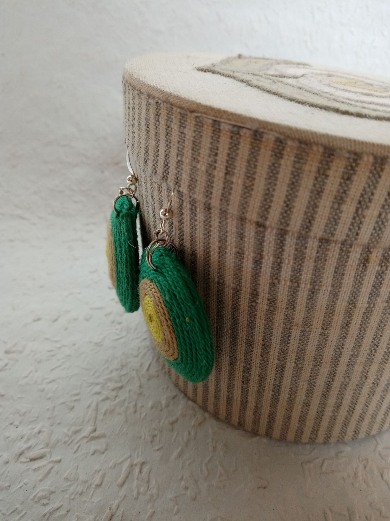 Ezt a köralakú fonalékszert a zöld színeiben alkottam meg. Garantáltan feltűnő, egyedi darab, ha szereted a különleges ékszereket. Átmérő: 4 cm