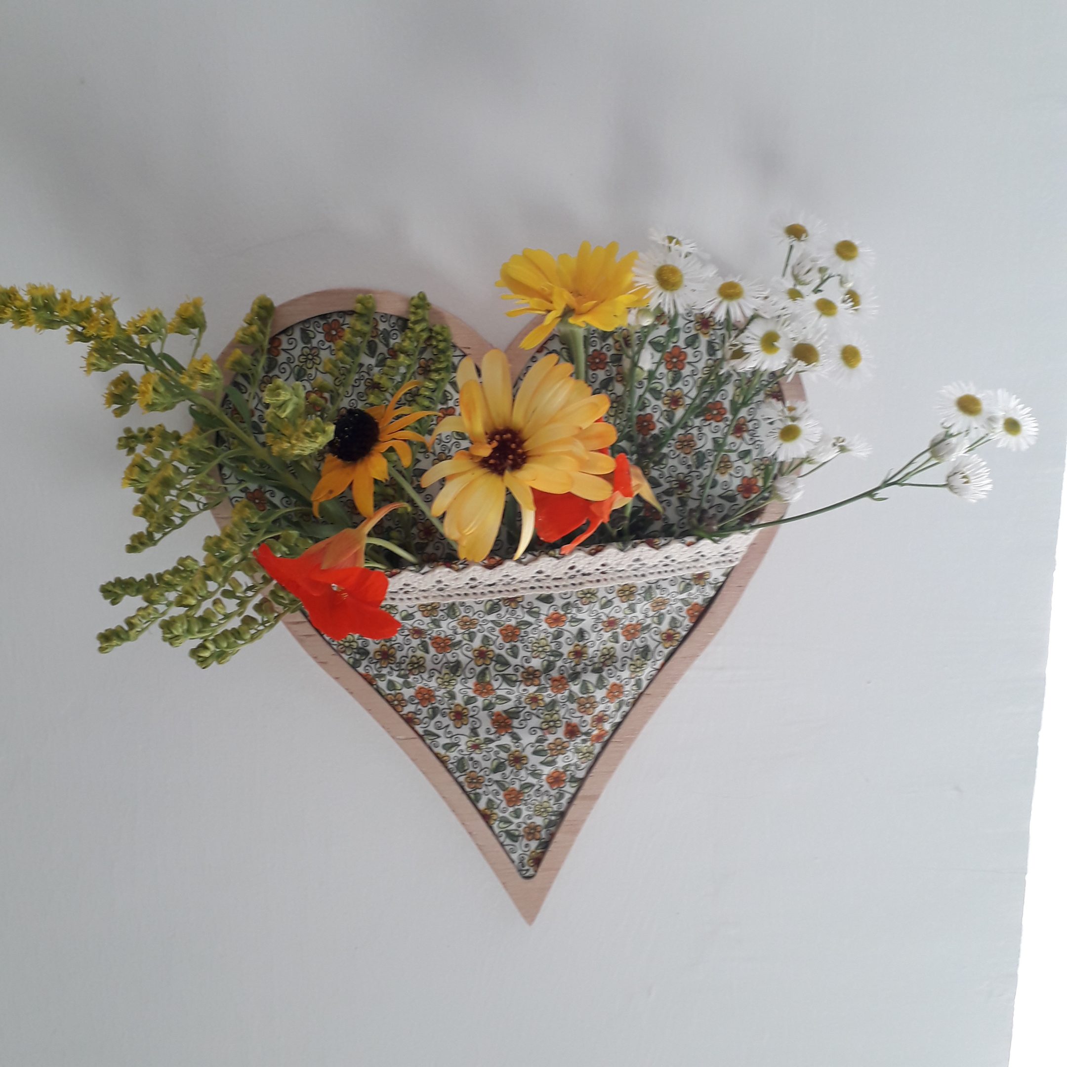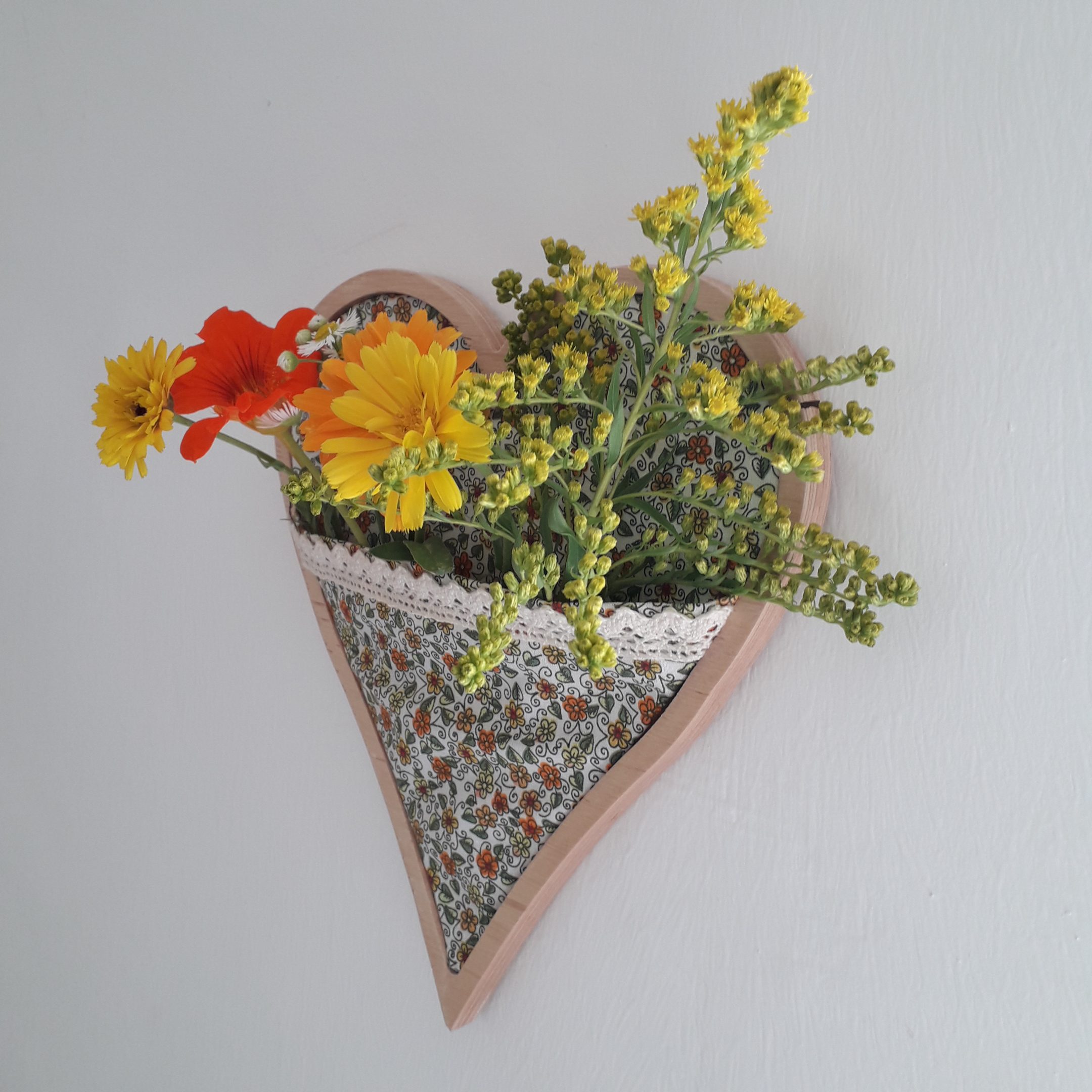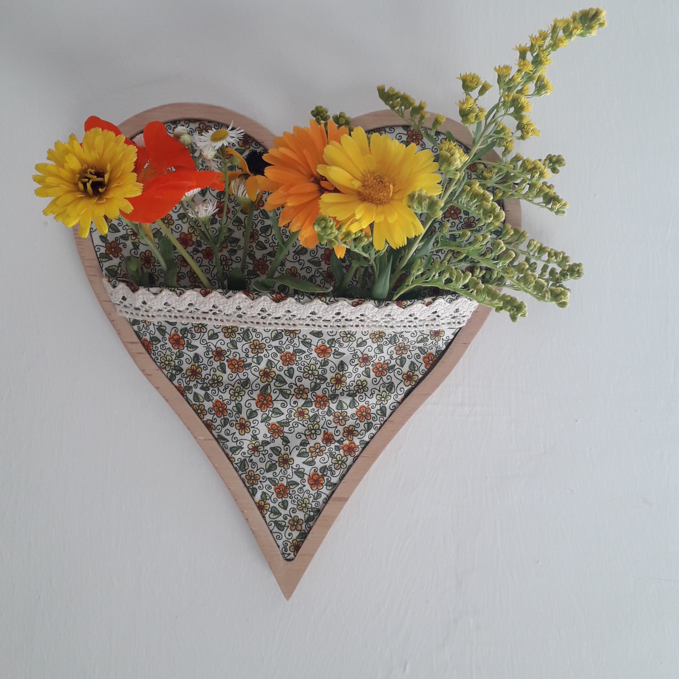 A falidísz textil zsebbel rendelkezik, s nemcsak (főként száraz) virágokat , hanem piperecuccokat, kedvenc fotókat, ceruzákat is lehet benne tartani. Élő virágot is lehet bele tenni, ehhez valamilyen üvegcsét kell beszerezned, amibe kis vizet teszel. A képeken látható virágokat, ceruzákat, pipere dolgokat nem tartalmazza a csomag. Mind a szívalakú faalap mind a textil dekoráció saját fantázia alapján és saját kézzel készült. Hátul fúrt akasztórésze van, amivel a falra akaszthatod a díszt.