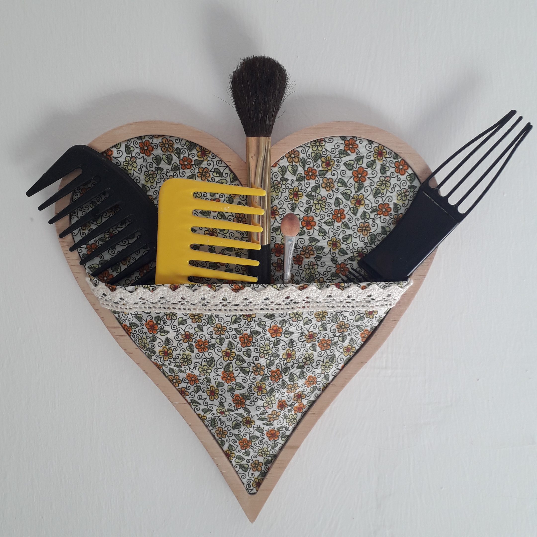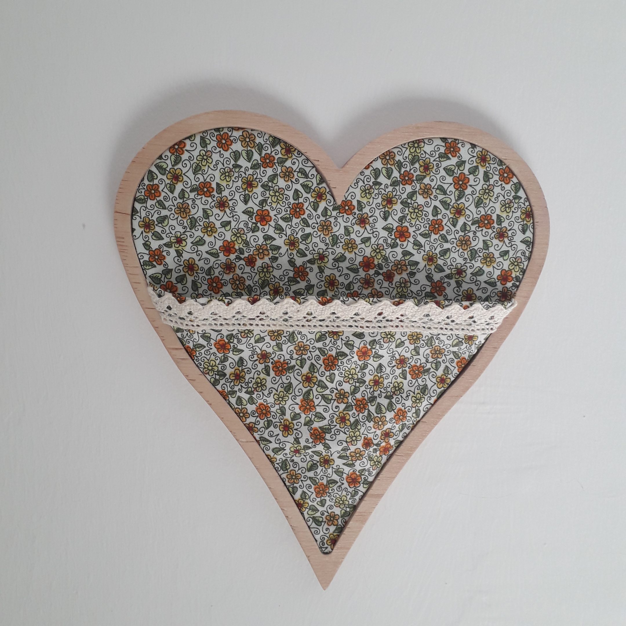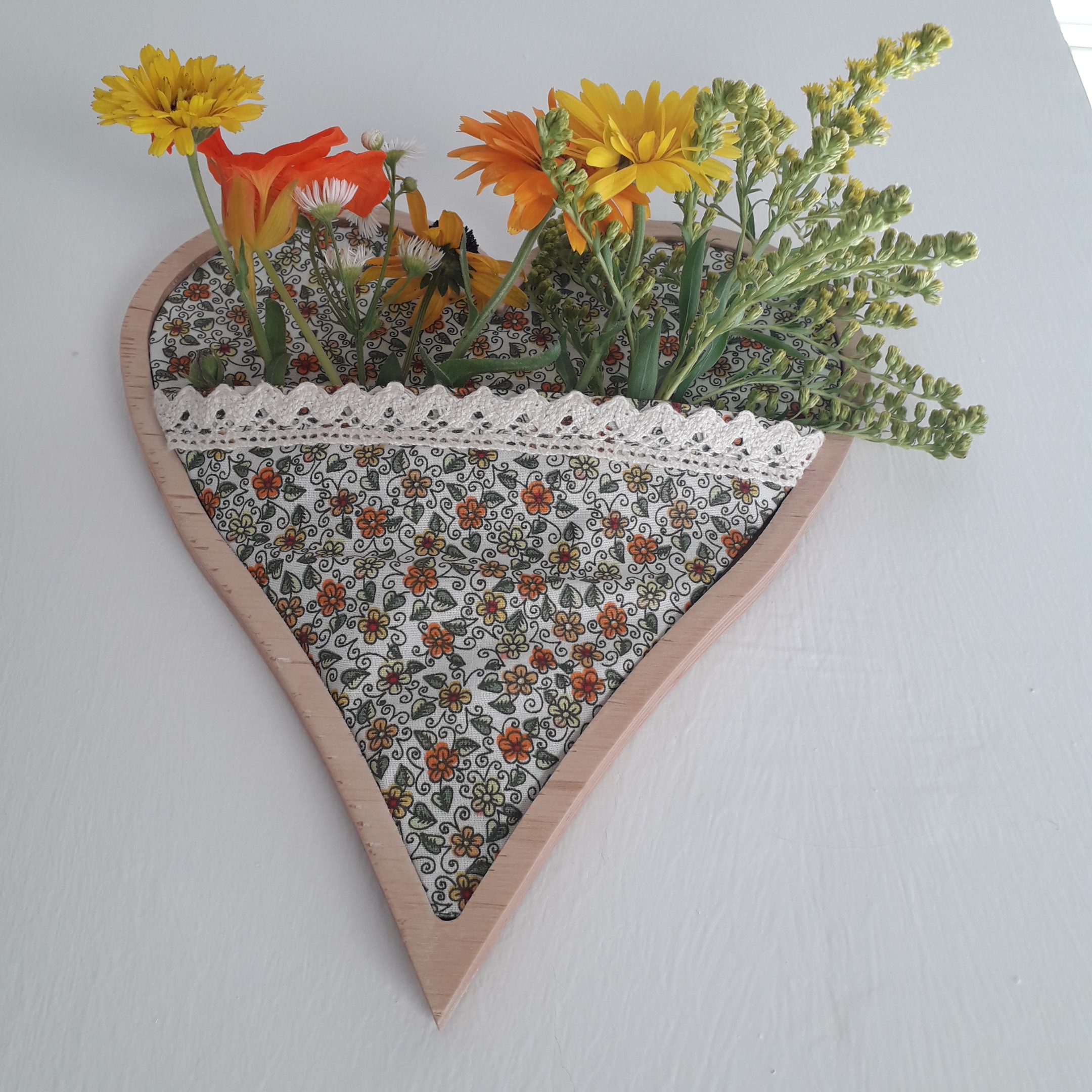 A falidísz textil zsebbel rendelkezik, s nemcsak (főként száraz) virágokat , hanem piperecuccokat, kedvenc fotókat, ceruzákat is lehet benne tartani. Élő virágot is lehet bele tenni, ehhez valamilyen üvegcsét kell beszerezned, amibe kis vizet teszel. A képeken látható virágokat, ceruzákat, pipere dolgokat nem tartalmazza a csomag. Mind a szívalakú faalap mind a textil dekoráció saját fantázia alapján és saját kézzel készült. Hátul fúrt akasztórésze van, amivel a falra akaszthatod a díszt.