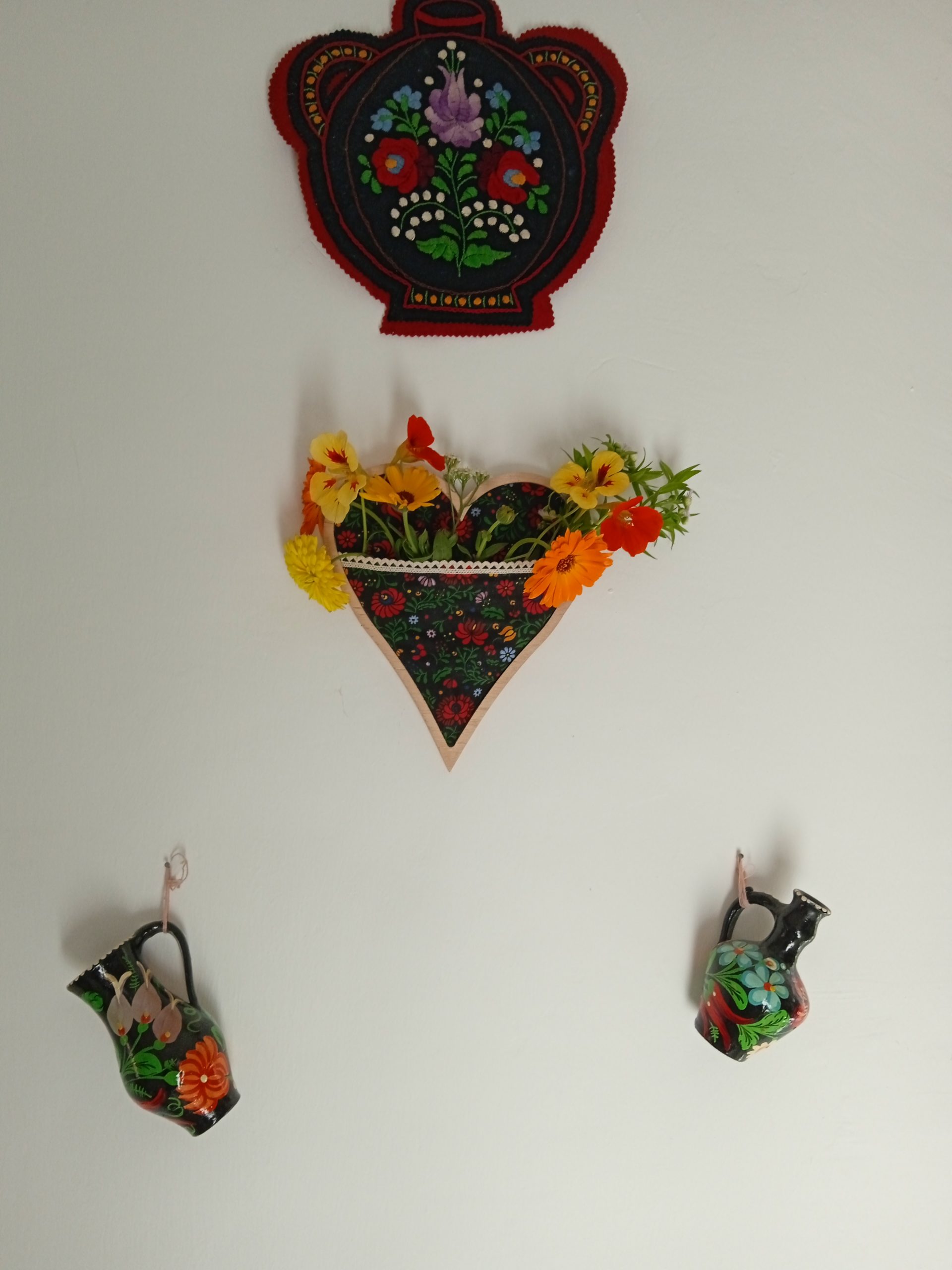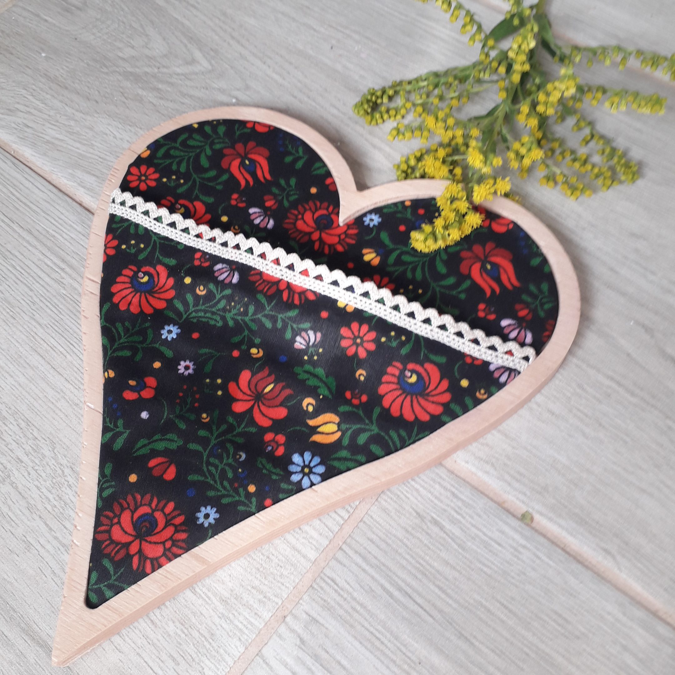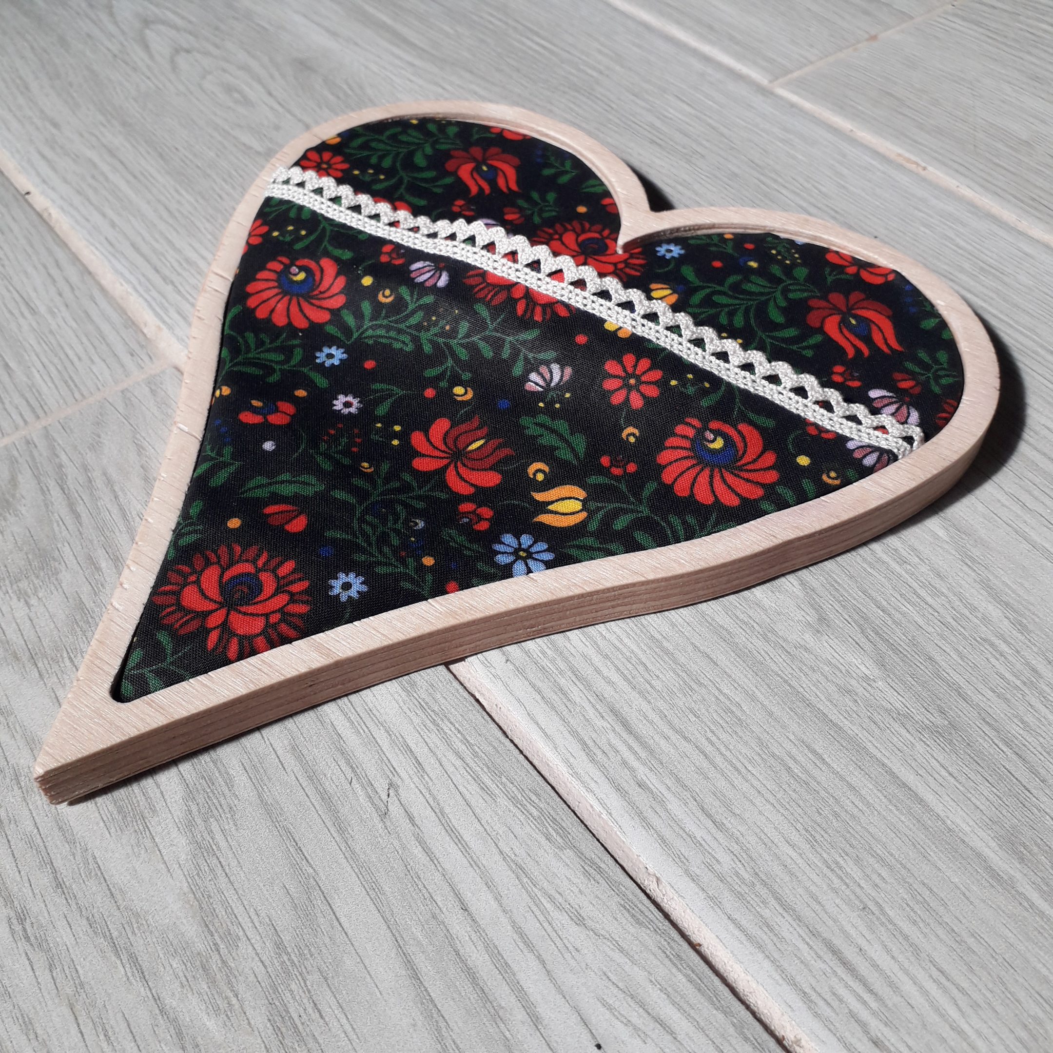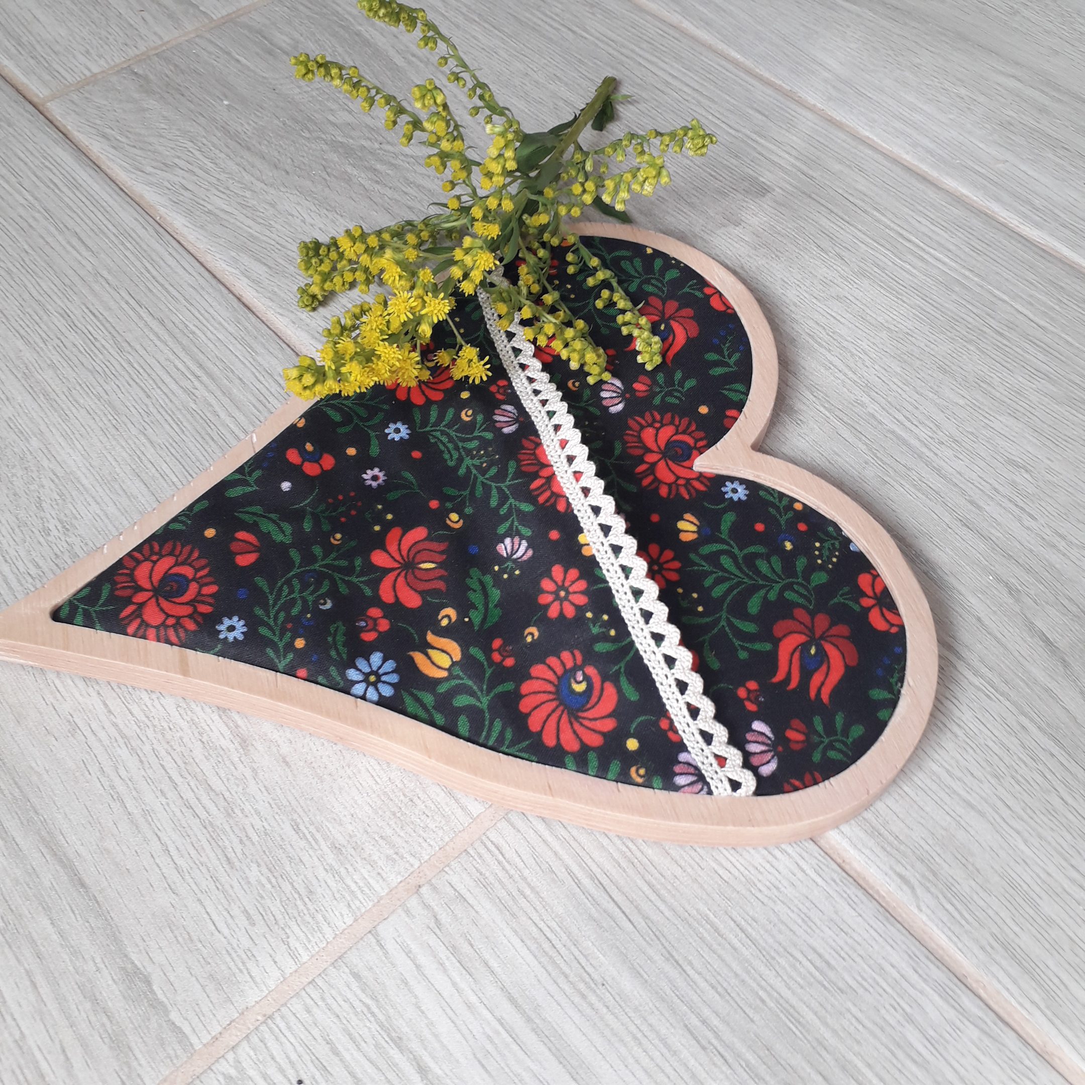 Ennek a falidísznek az elkészítéséhez magyar mintás, kalocsai népi virágmintás anyagot használtam. Ezzel a szívalakú falidísszel otthonosabbá, meleg hangulatúvá tudod varázsolni a szobádat! Saját, egyedi ötlet alapján készült alkotás.