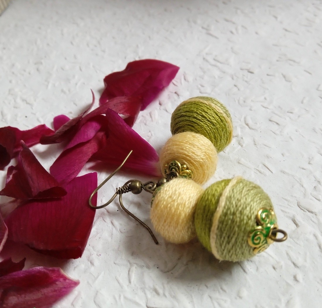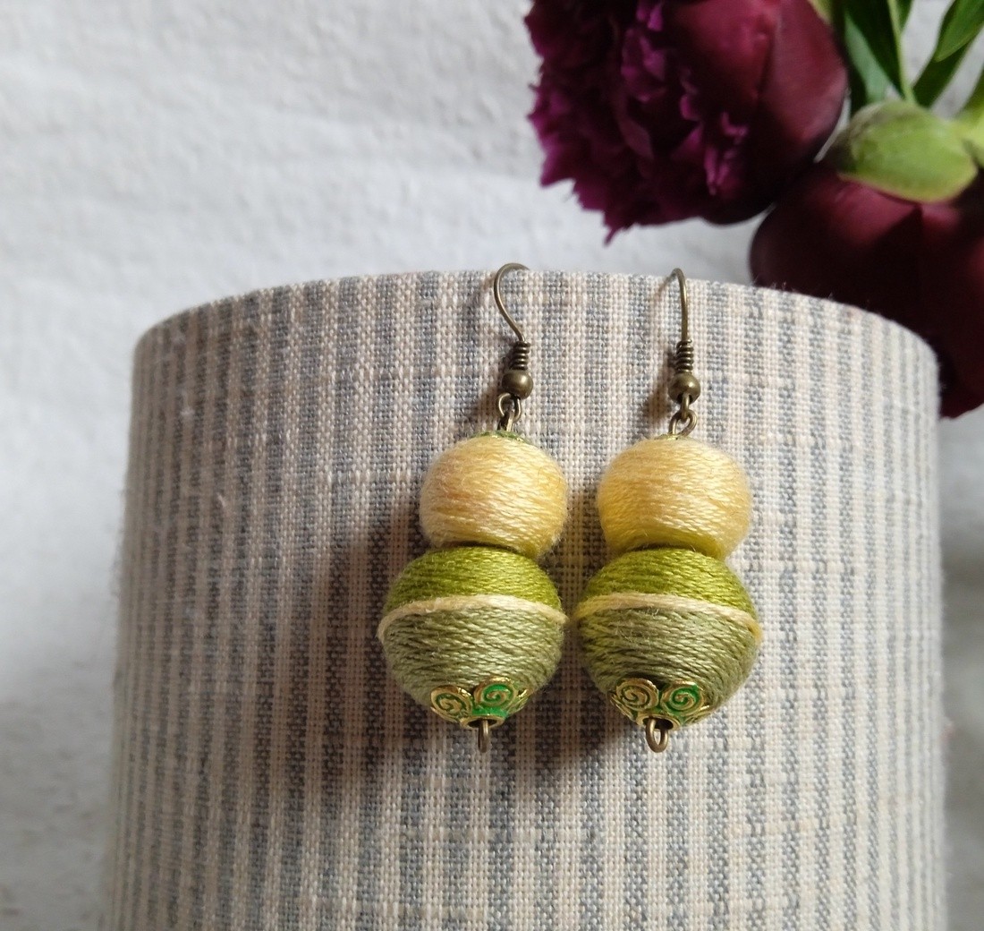 Barack és zöld színben játszó textilbogyó fülbevaló két bogyóval, mely talán a legjobban kiemeli a természetes szépségünket.