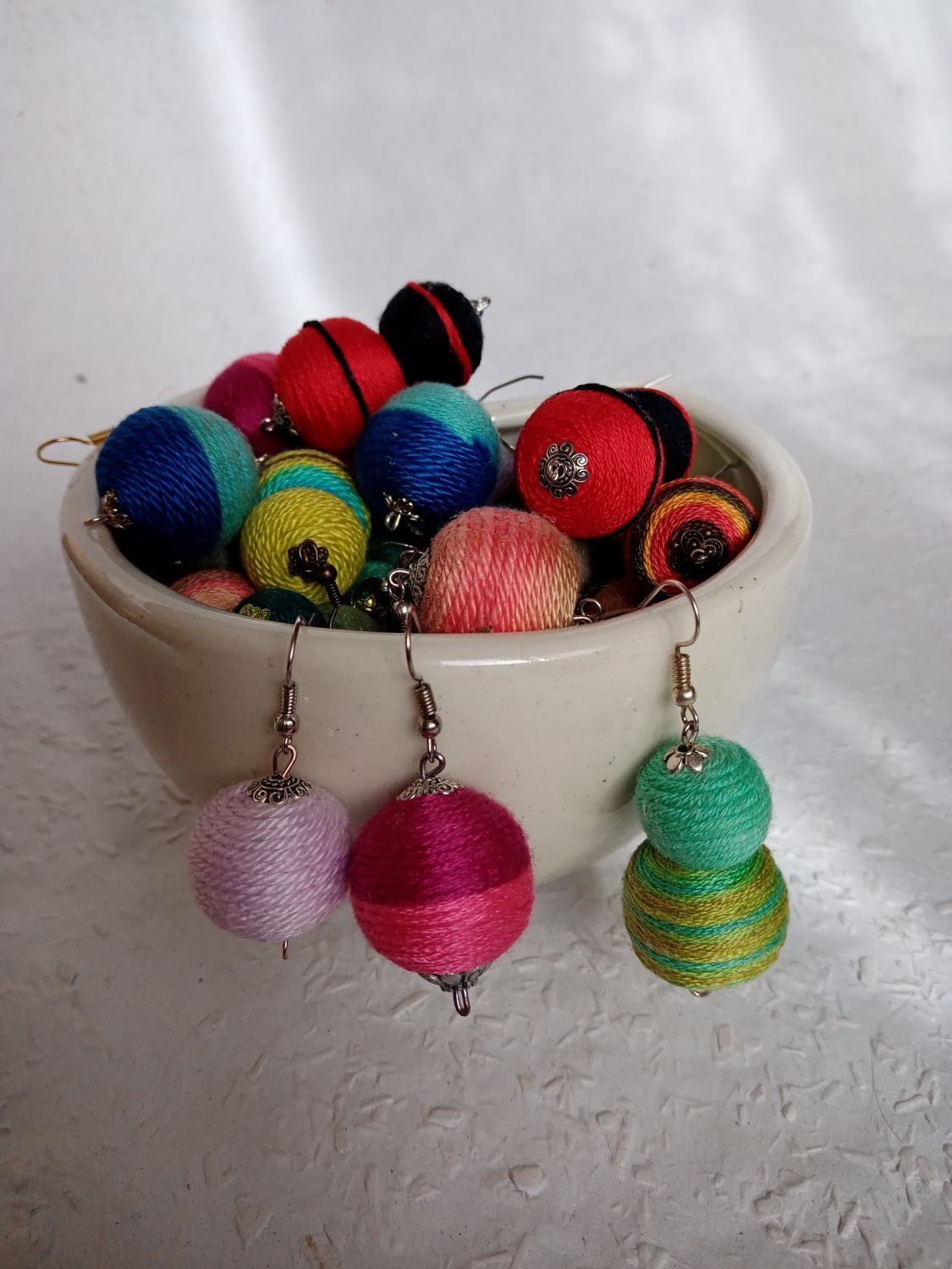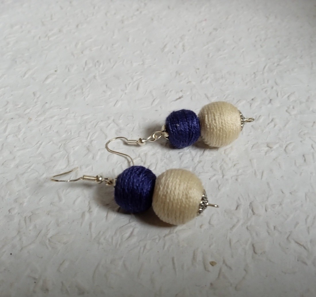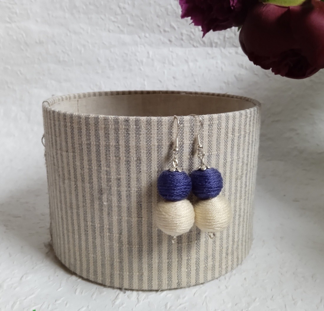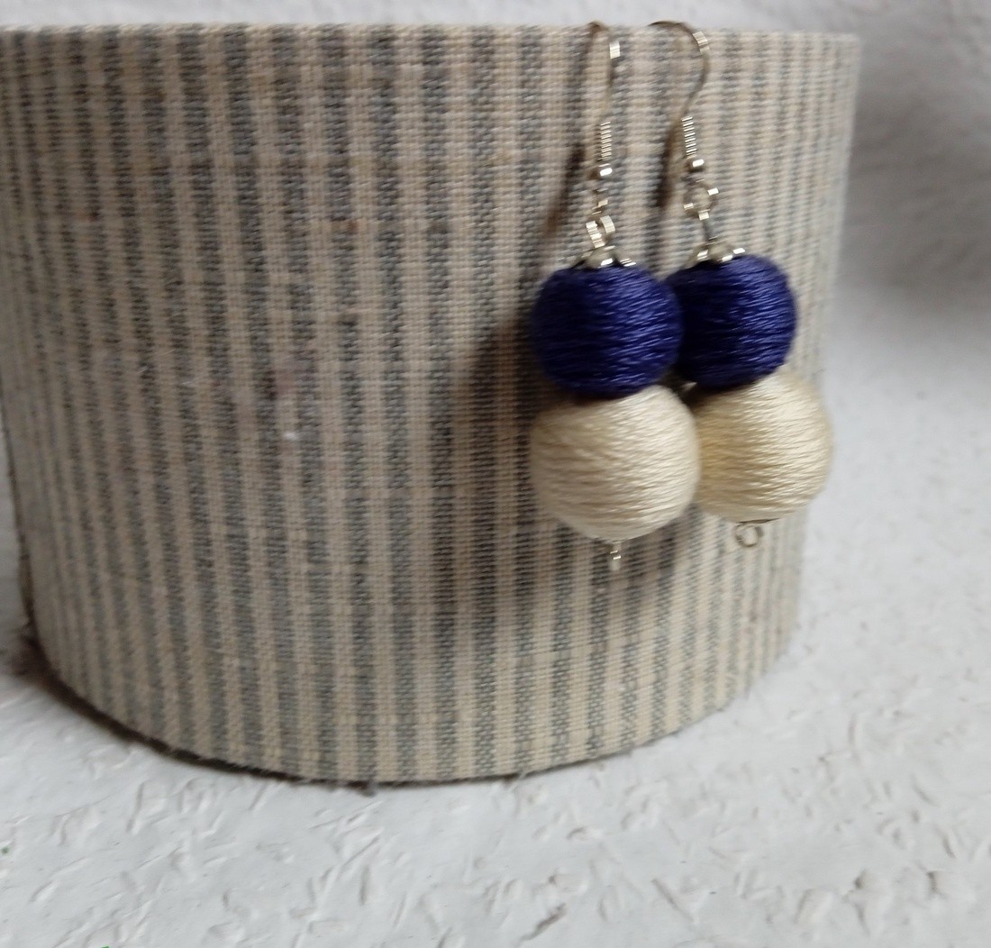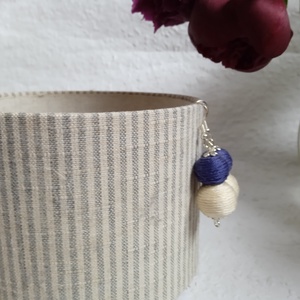 Tengerkék és tört fehér színekben játszó textilbogyó fülbevaló két bogyóval, mely talán a legjobban kiemeli a természetes szépségünket.