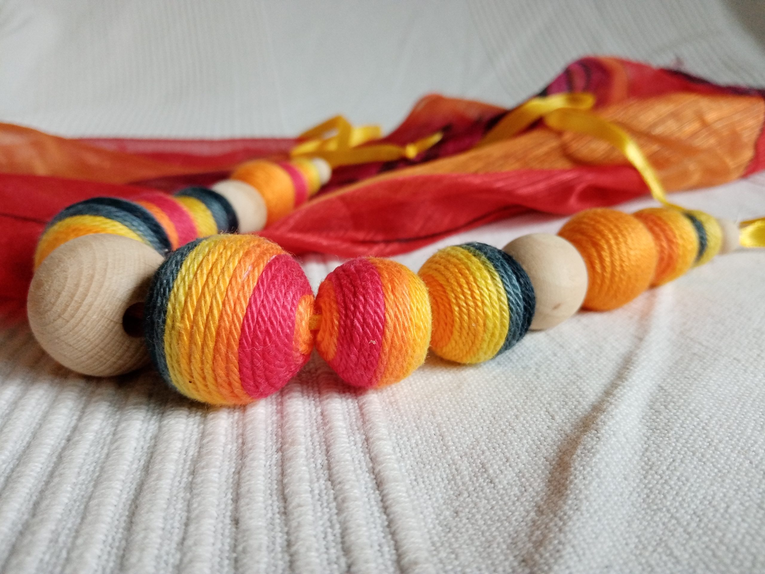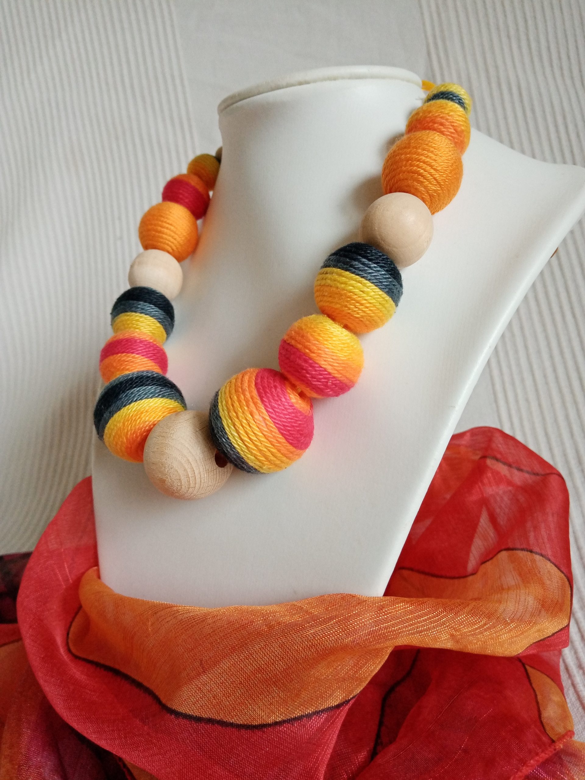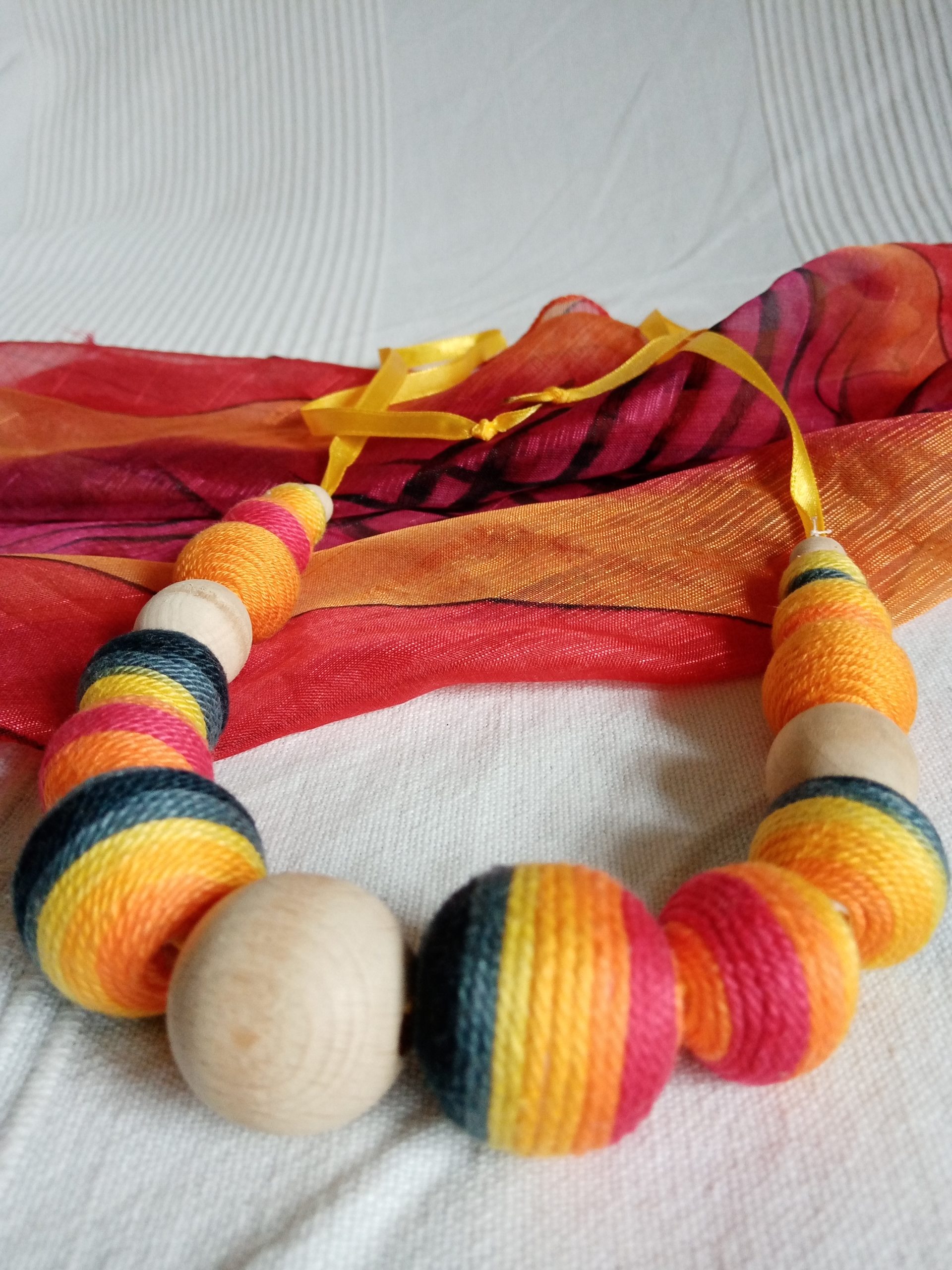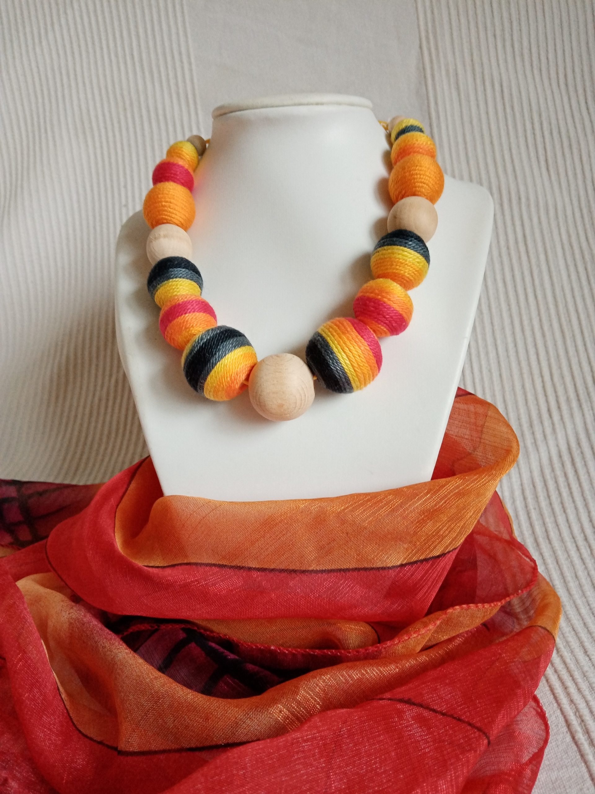 A napfelkelte színeit választottam ehhez a nyaklánchoz, melyet natúrfából készült fagolyó is díszít. Színátmenetével tökéletesen feldobja ruhánkat. Egy fekete ruhát abszolút feldob, színessé tesz.