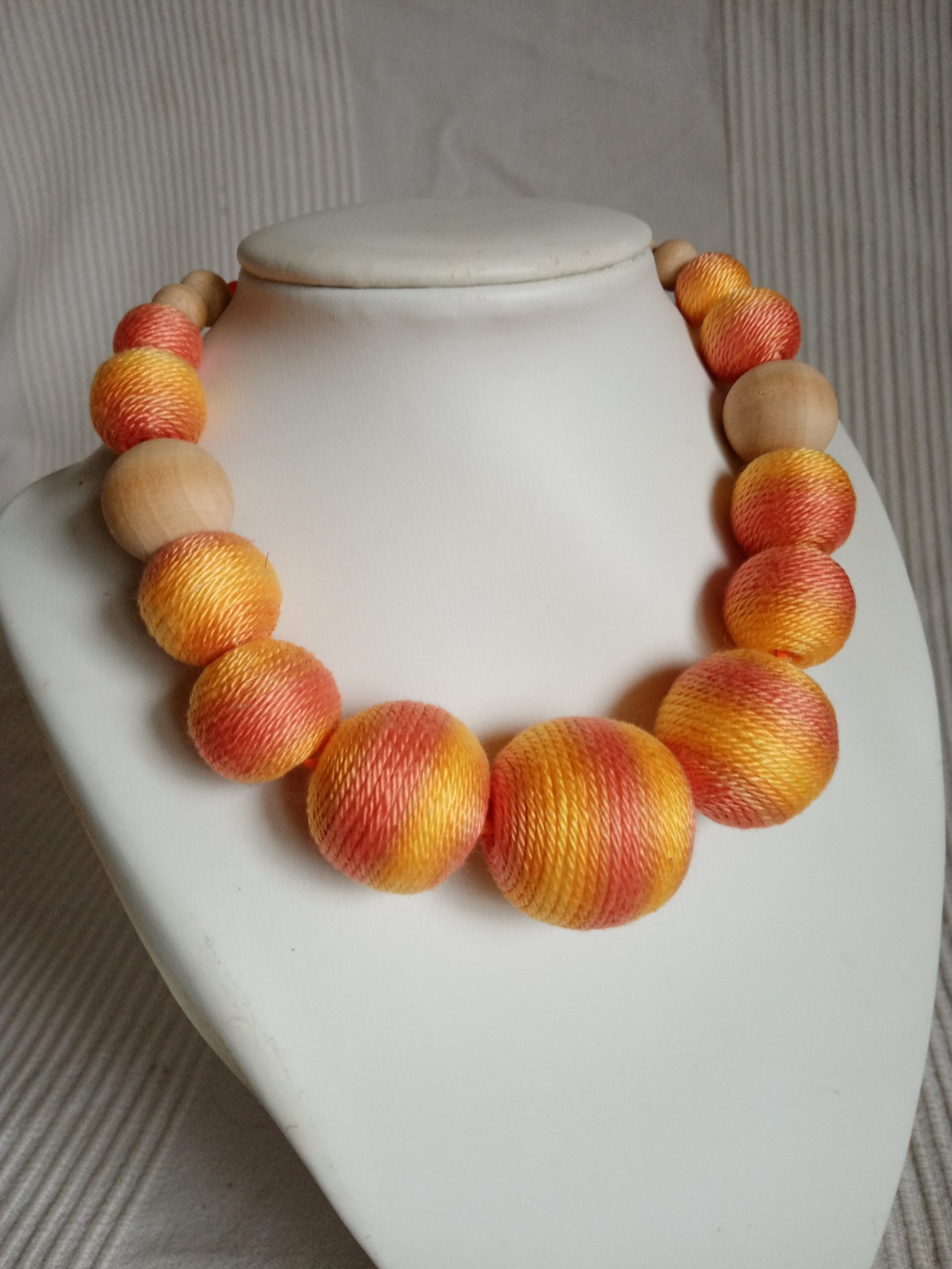 Sárga-citromsárga színekben pompázó textil nyaklánc, a fagolyók natúrszínűek. Egyszínű ruhához kitűnő kiegészítő.
