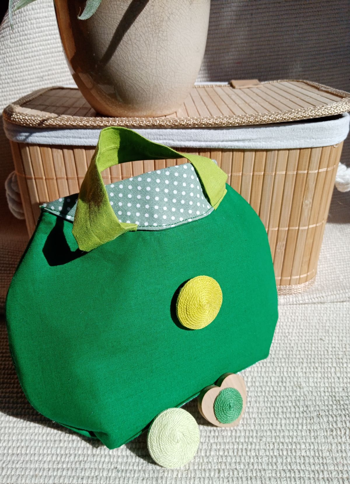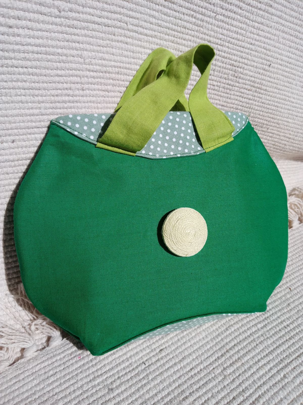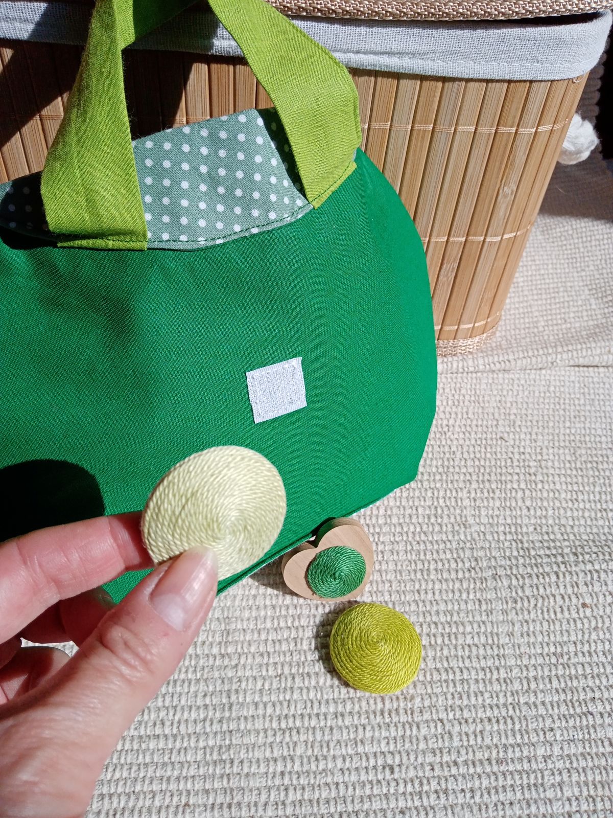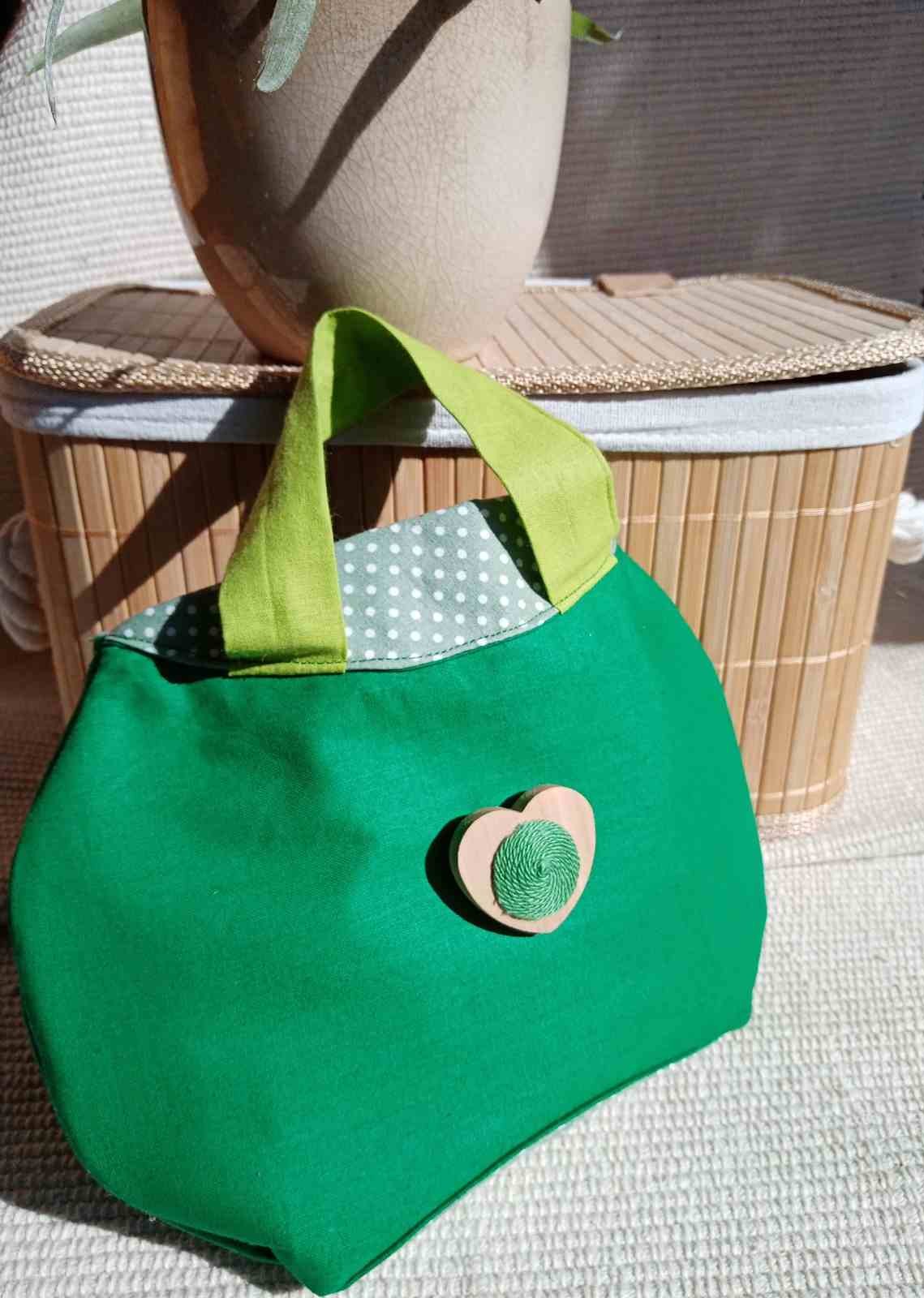 A táska első részén lévő kerek díszdarabot változtathatod, kettő kerekalakú + 1 db szívalakú díszelemre. (fadarabra készült díszek, melyek tépőzárral illeszkednek a táskához)