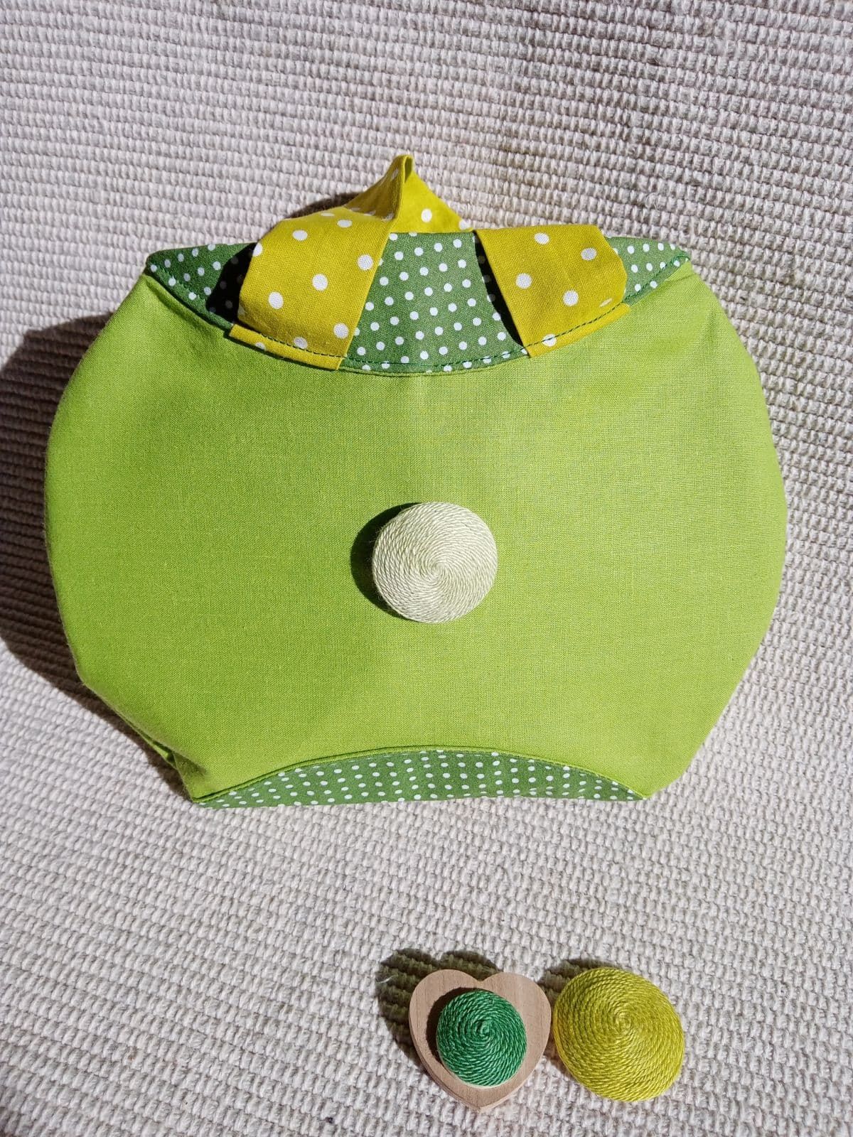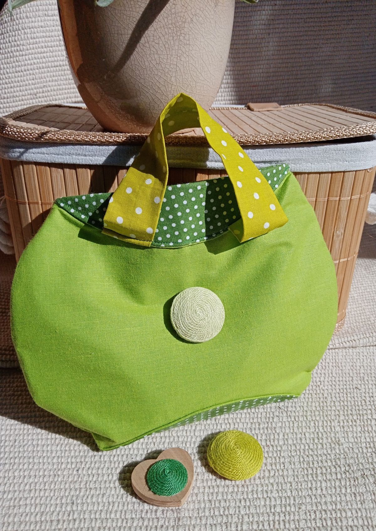 A táska első részén lévő kerek díszdarabot változtathatod, kettő kerekalakú + 1 db szívalakú díszelemre. (fadarabra készült díszek, melyek tépőzárral illeszkednek a táskához)