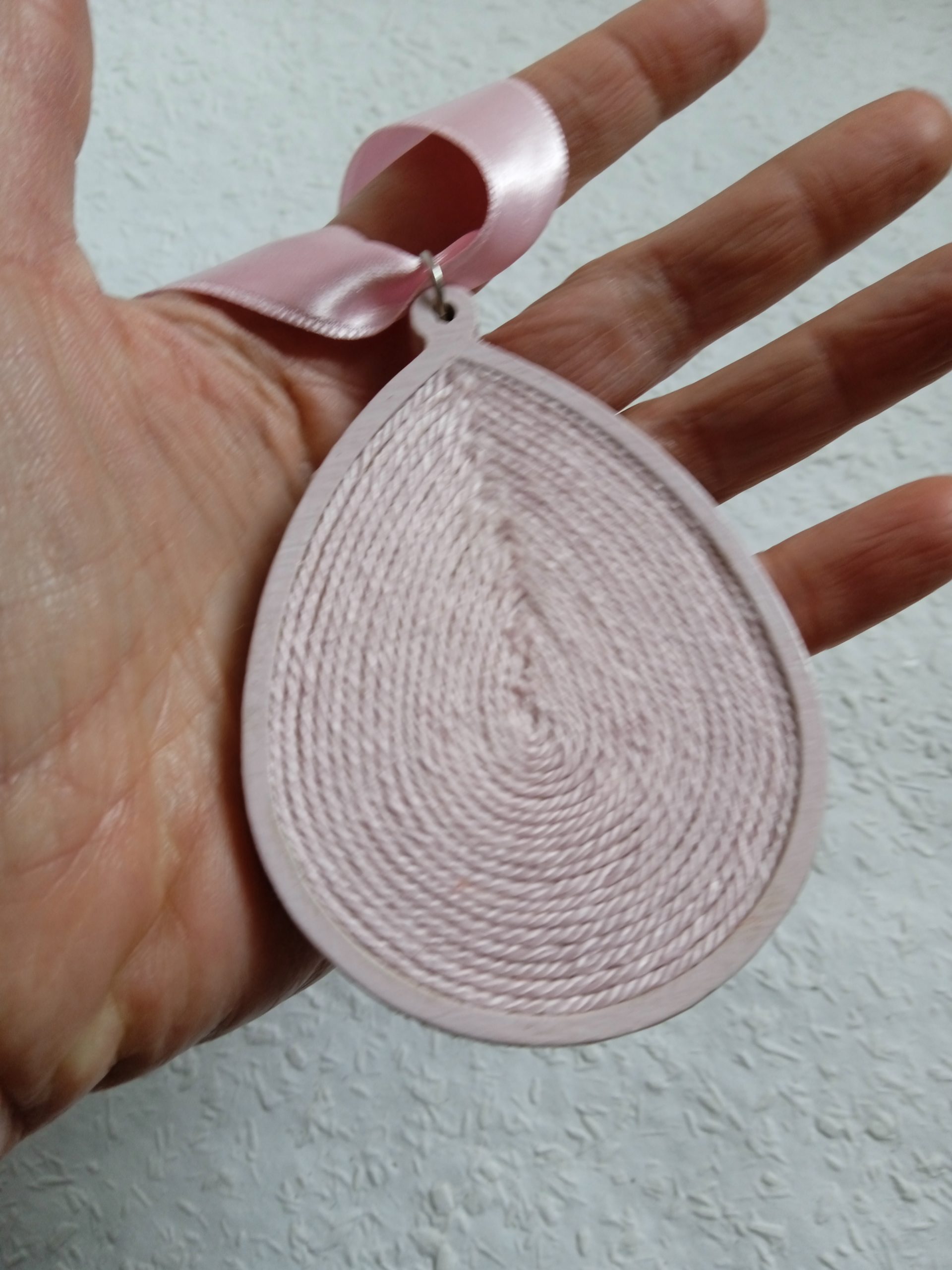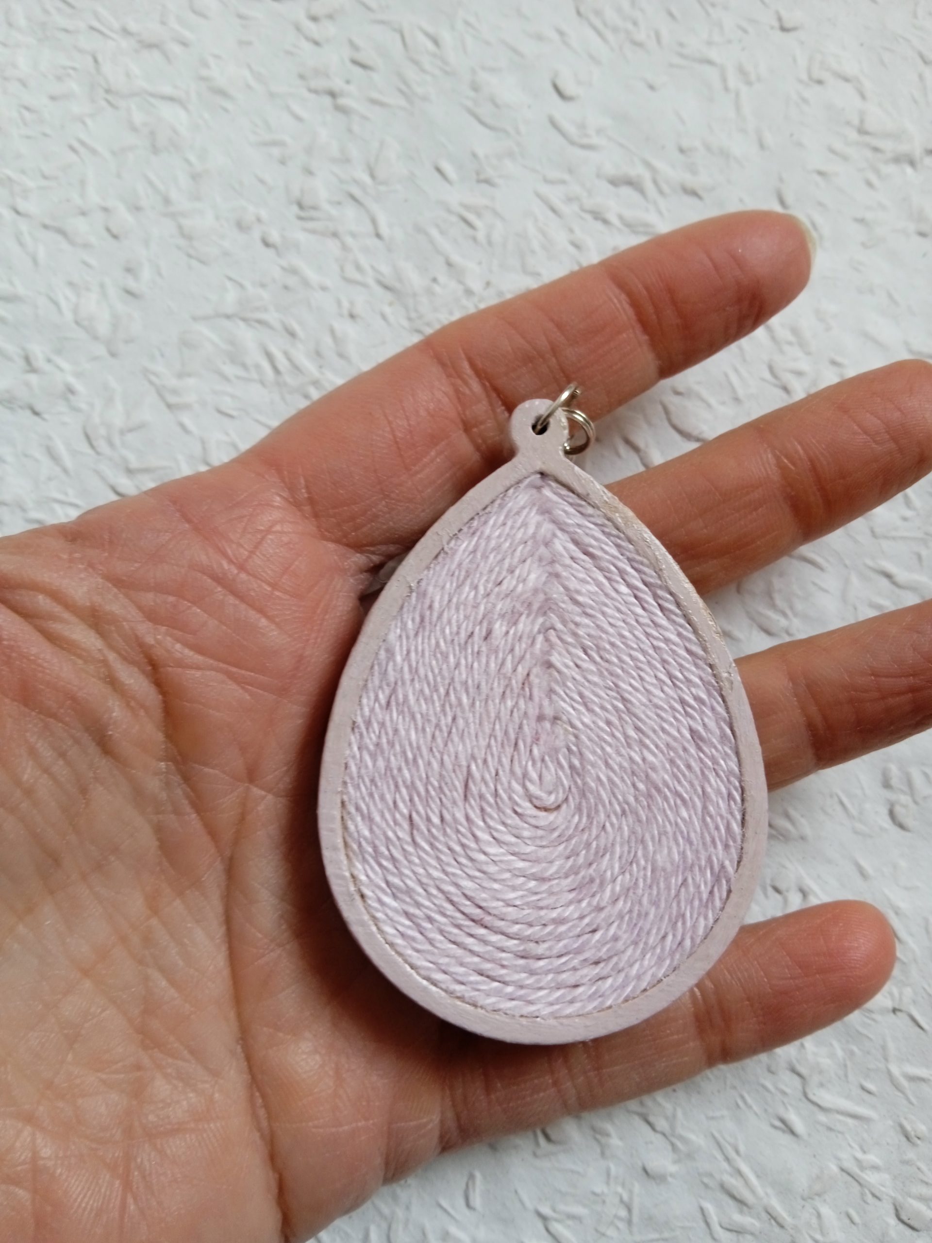 Csepp alakú faalapra készült színes fonal fülbevaló .