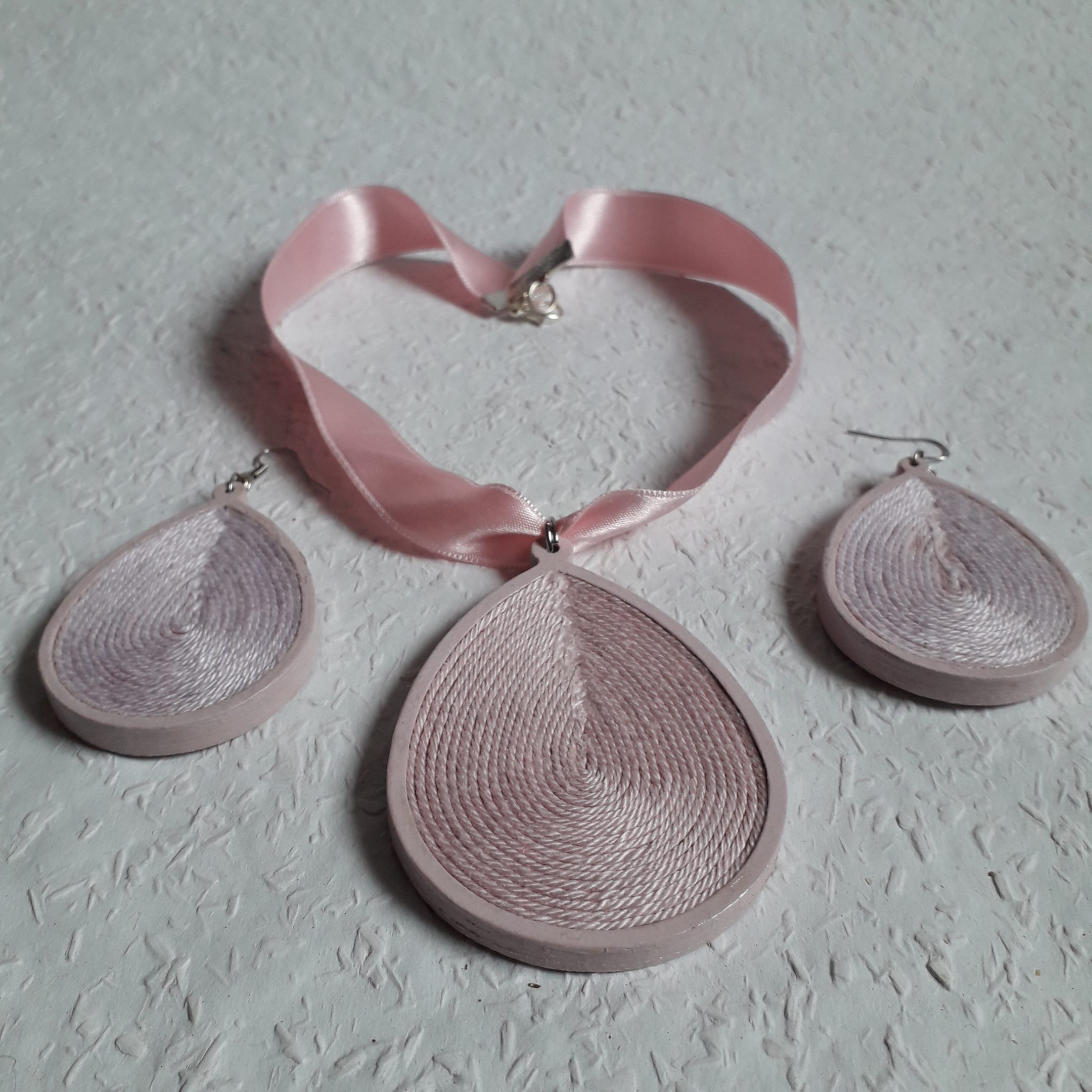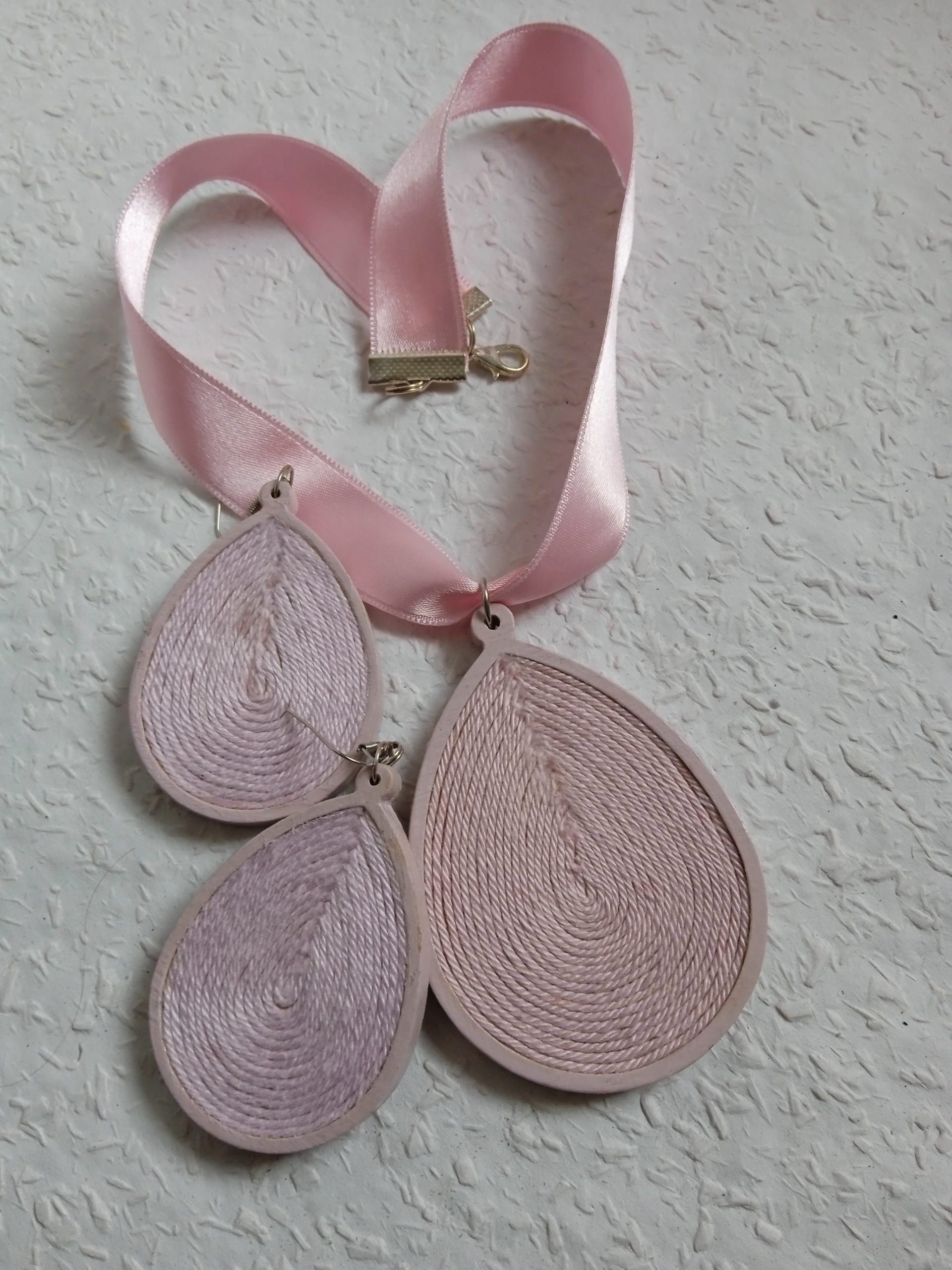Kőris fából készült a faalap, de rózsaszínűre festett,lakkozott. Egyedi darab. A nyaklánc kapoccsal záródik. Bib fülbevaló. Több darabot is el tudok készíteni rendelésre más színvilágban is . Rózsaszín árnyalatban készült.