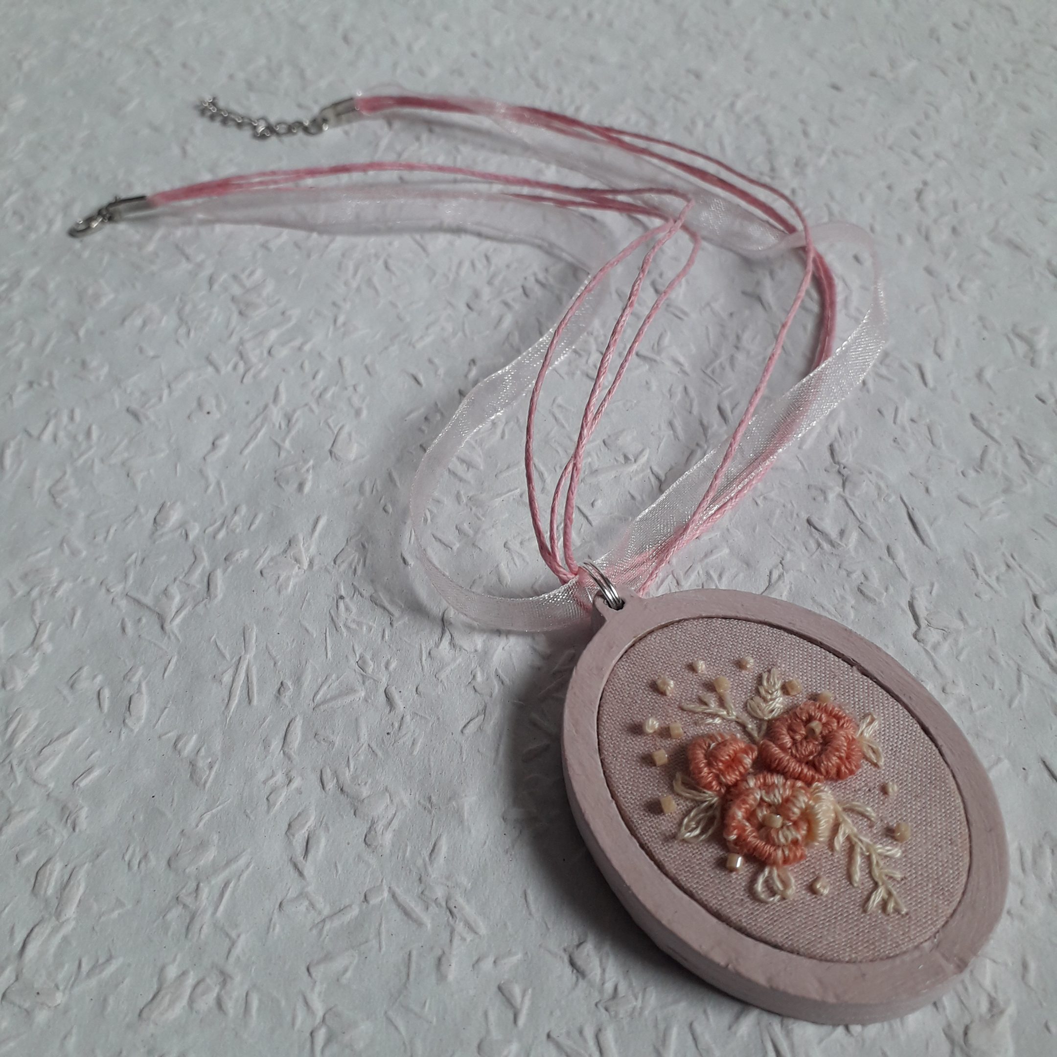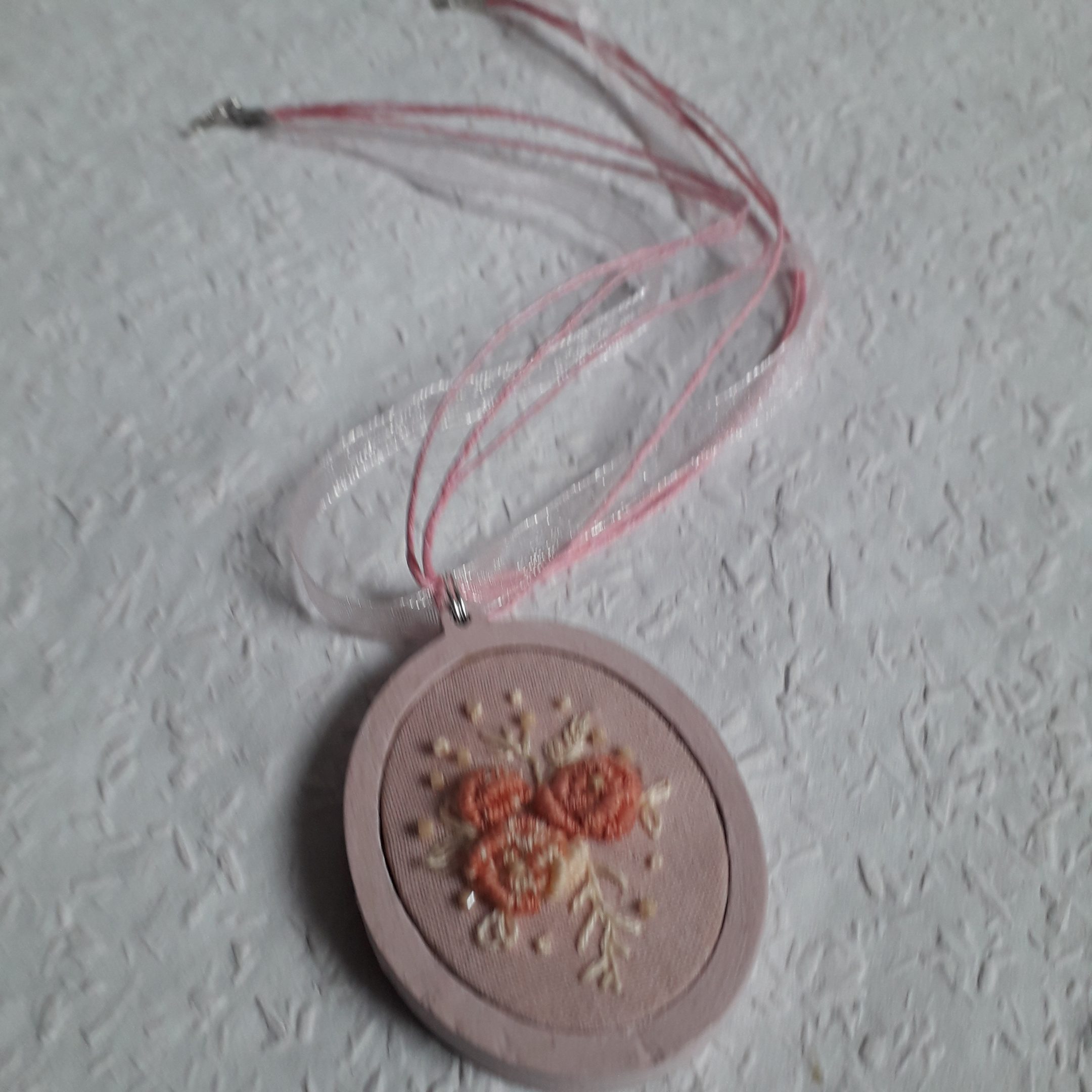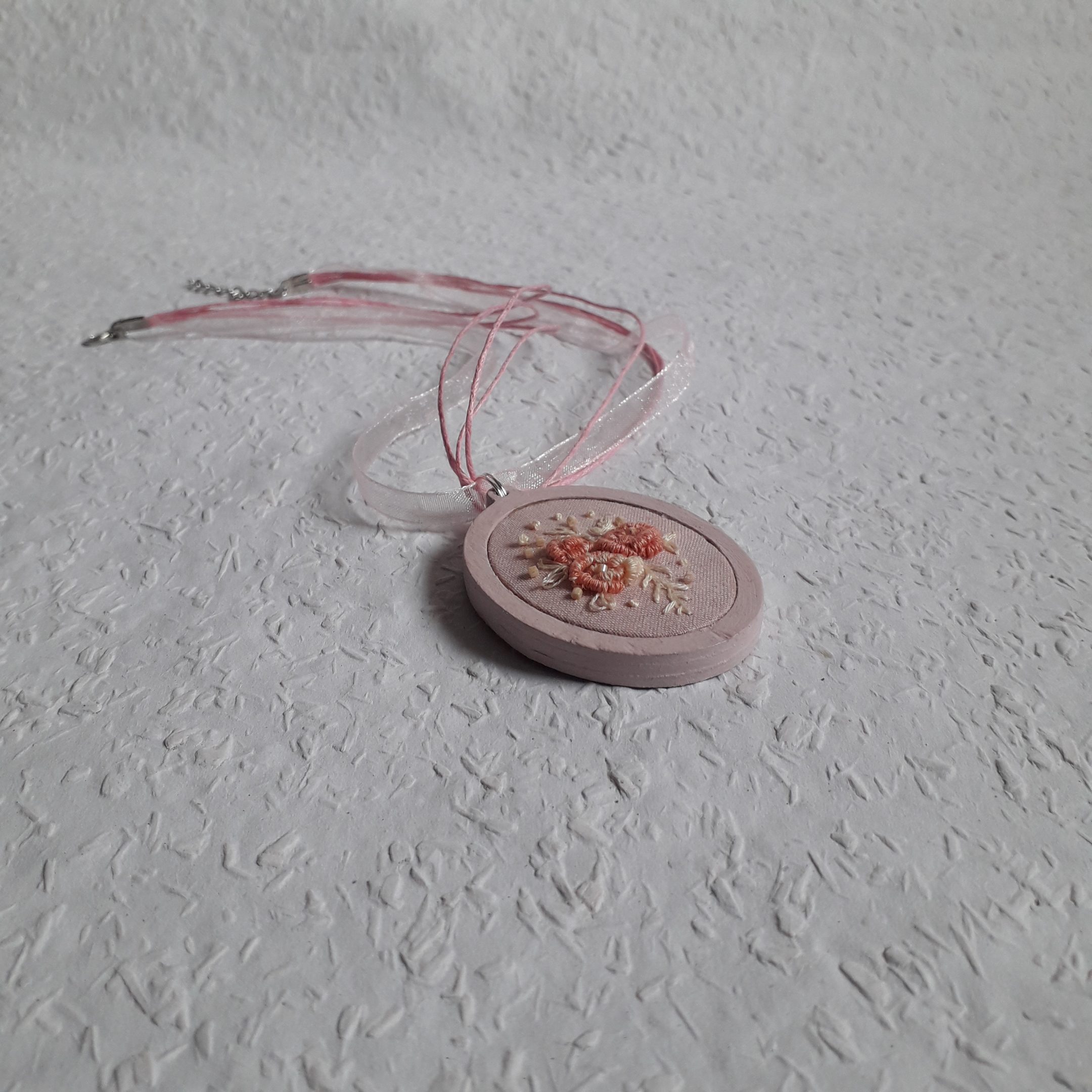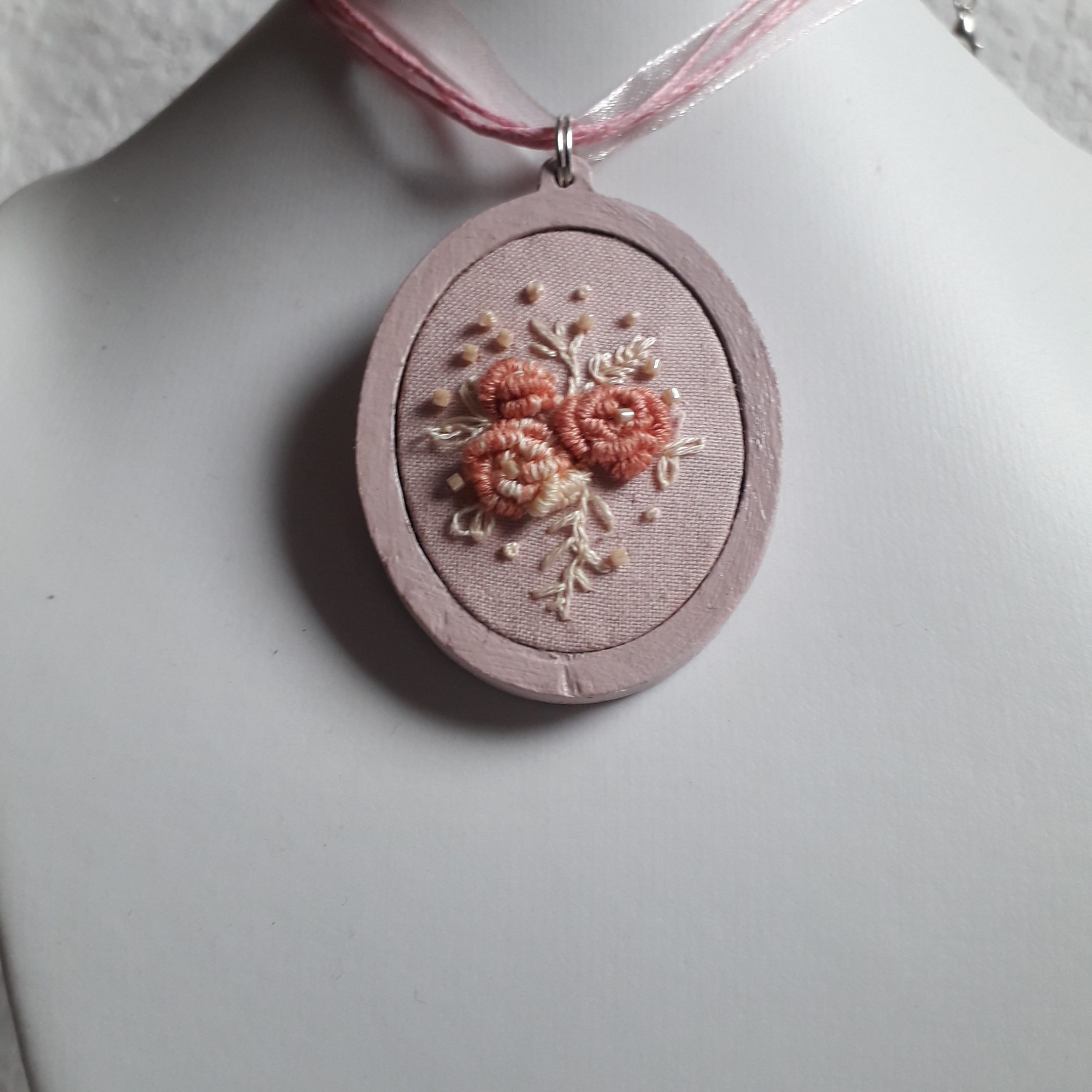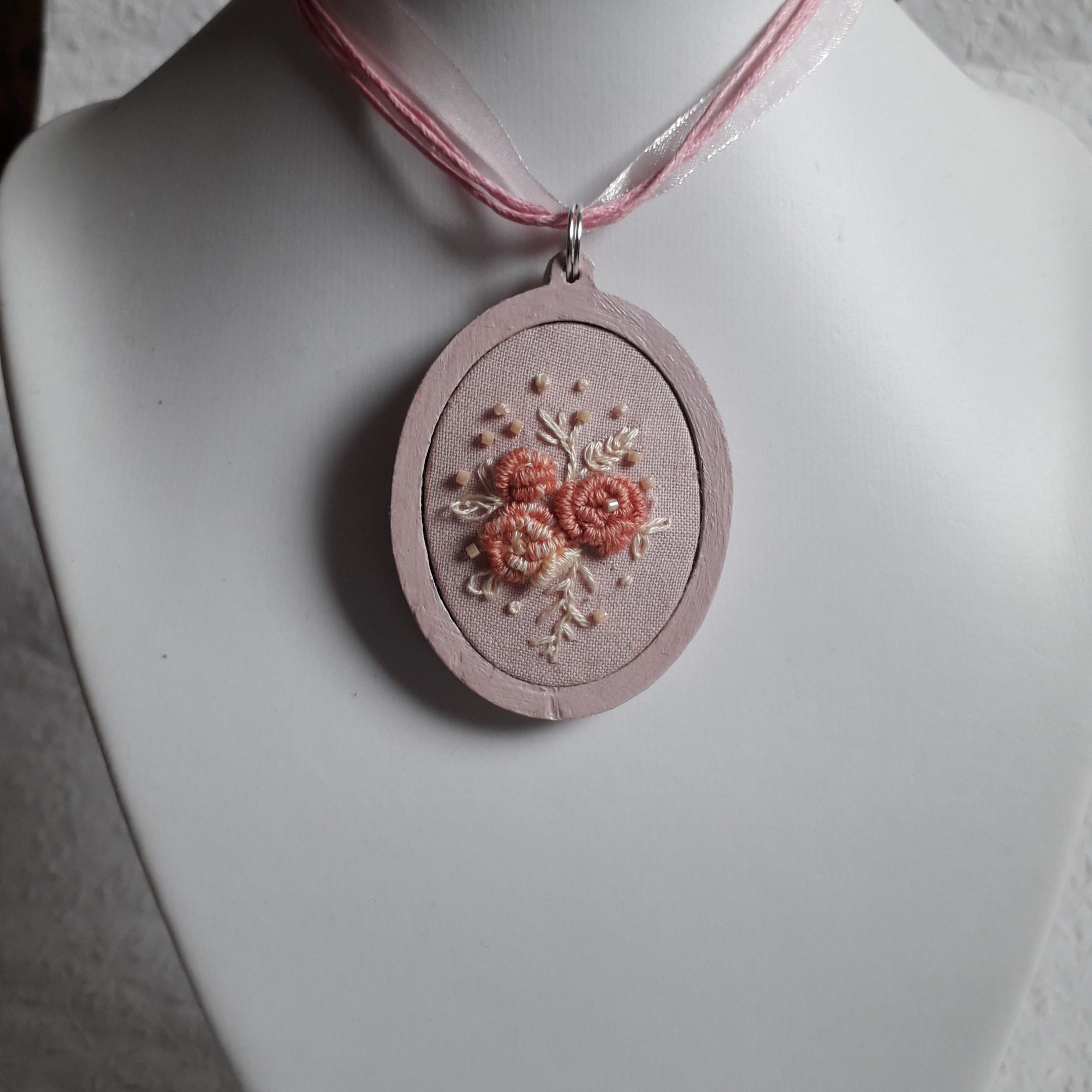 Vintage stílust idéző mini hímzett mezei virágot idéző nyaklánc lenszöveten ovális fakeretben.