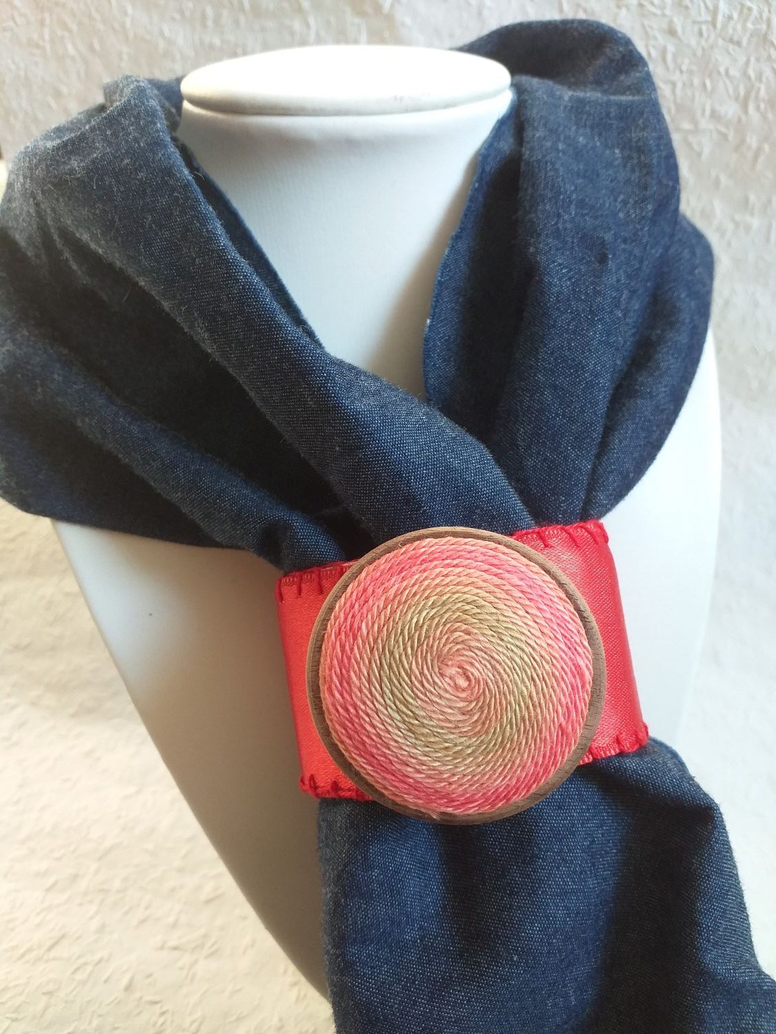A mutatós kerek domború fonallal körbevett falencse faalapba került, melyet hozzávarrtam széles selyemszalaghoz. Hajlítható, állítható, hiszen a hajlíthatóságát sárgaréz lemez adja, ezt vontam be narancsszínű selyemszalaggal. Nagyon praktikus darab